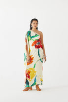 The Monet One Shoulder crafted from our stunning vegan silk fabrication , trans-seasonal, is a statement piece. The dress, made in our hand drawn Monet print, has a draped fit. With a one shoulder, the piece has hand embroidered fringe and sequin details. Featuring a summery look, it is full length and has ties on one side. Wear it with heels for an elegant look.