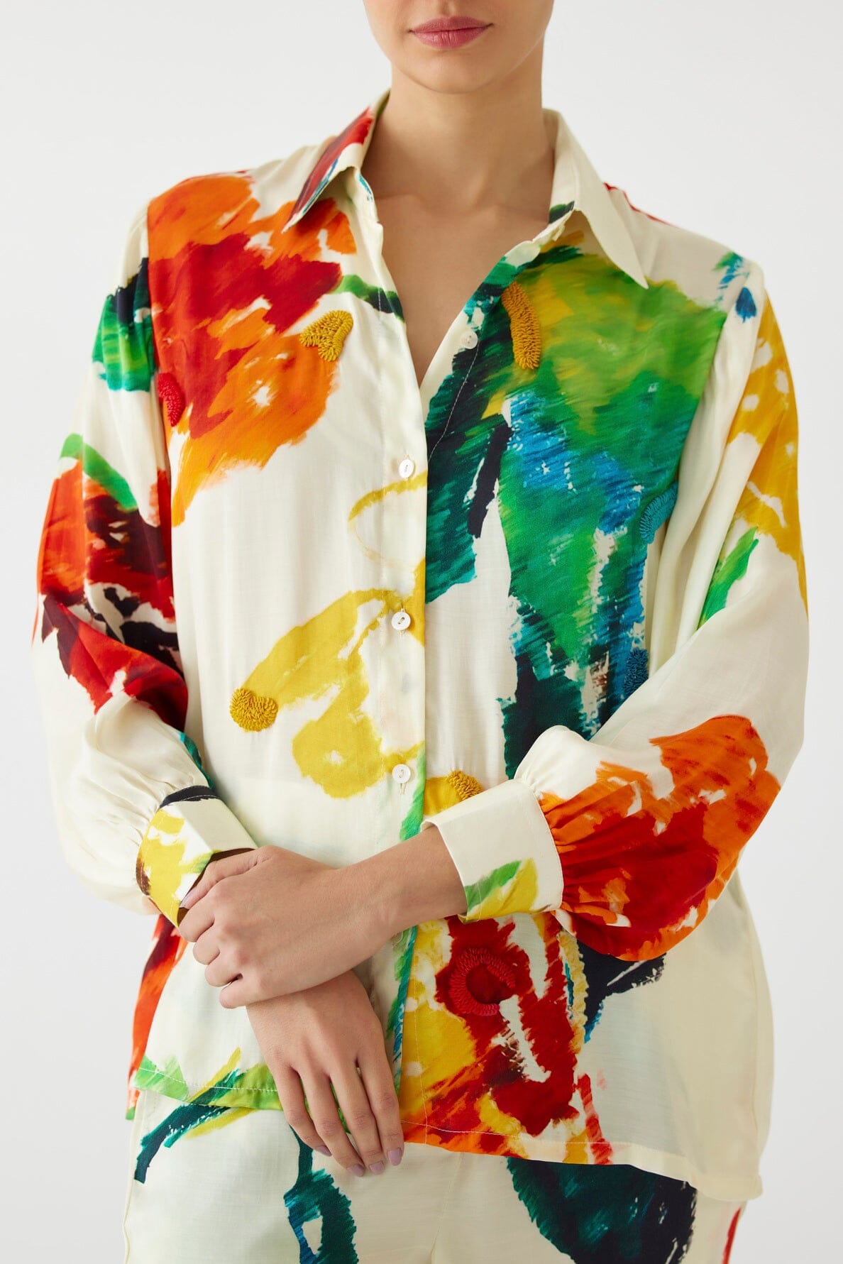 The Monet Shirt & Trousers Co-ord crafted from our stunning vegan silk fabrication , trans-seasonal, is a statement piece. The co-ord, made in our hand drawn Monet print, has a relaxed fit. With a straight fit, the piece has hand embroidered sequin and front buttons. Featuring a summery look, it is paired with our monet trousers with a waistband and pockets. Wear it with heels for an elegant look.