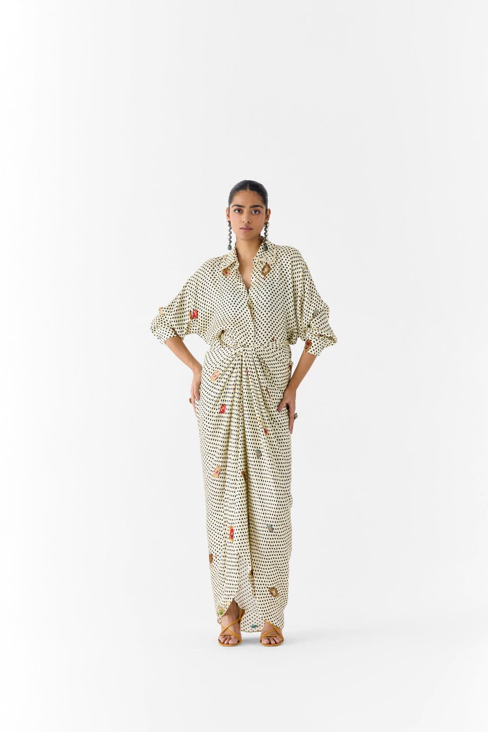 The Pearl Polka Dot Kimono crafted from our stunning vegan silk fabrication, trans-seasonal, is a statement piece. This set, printed in our jewels polka dot print, has a relaxed fit. With dropped sleeves and a joined shirt and skirt, the piece has front shell buttons. It has small lace detailing on the collar. Featuring a draped skirt, this piece can be tied with a knot and can be styled in different ways. Wear it with heels for an elegant look.