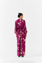 The Plum Kimono Top & Pants Co-ord crafted from our stunning Vegan Silk fabrication, trans-seasonal, is a statement piece. The piece, made in our original digitally printed sakura print in plum colour in cupro, is a co-ord. With tie ups at the waist, this top has a relaxed fit with kimono sleeves and a cuff. Featuring straight pants, this piece can be tied with a knot and can be styled in different ways. It is paired with matching plum straight pants. Wear it with heels for an elegant look.