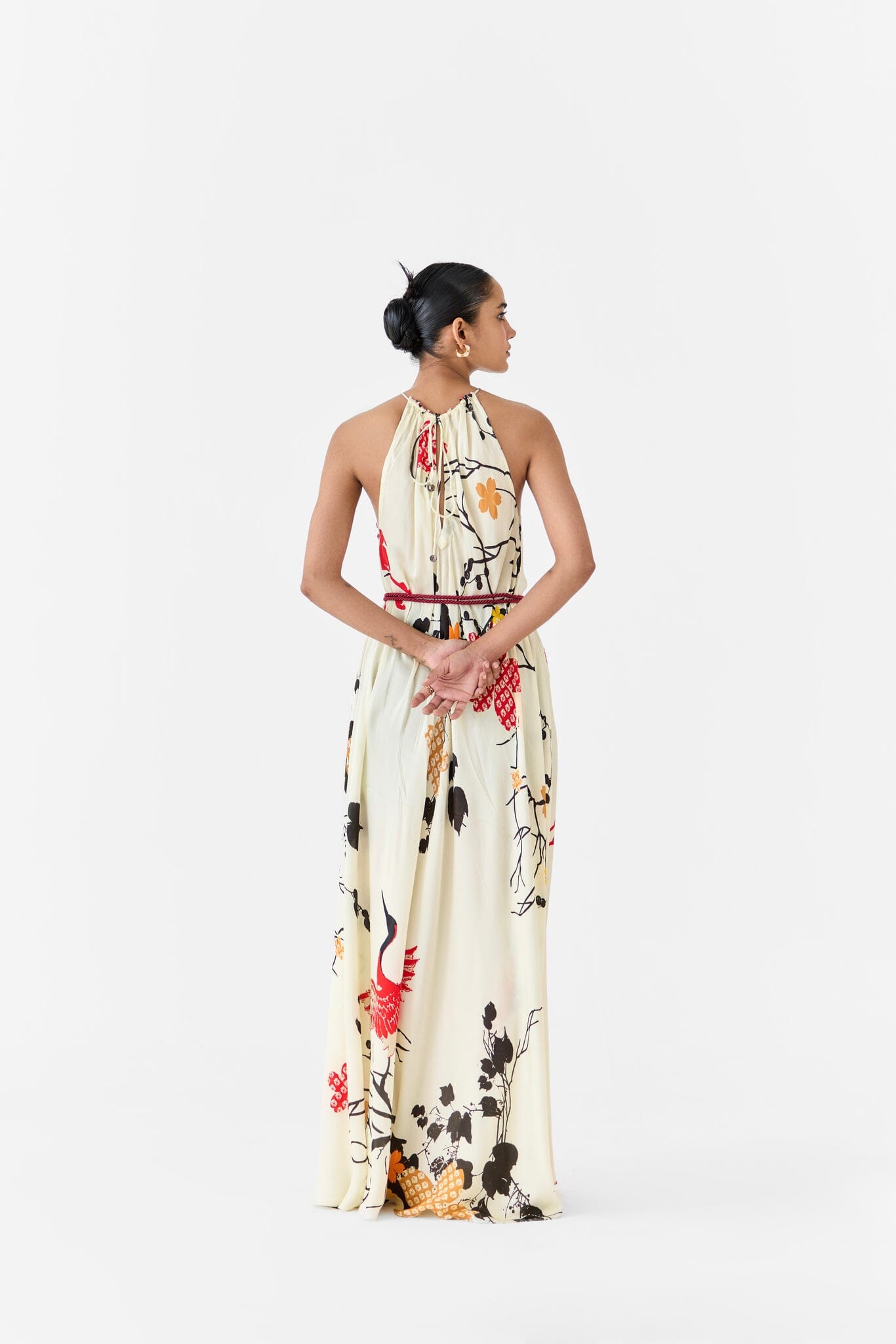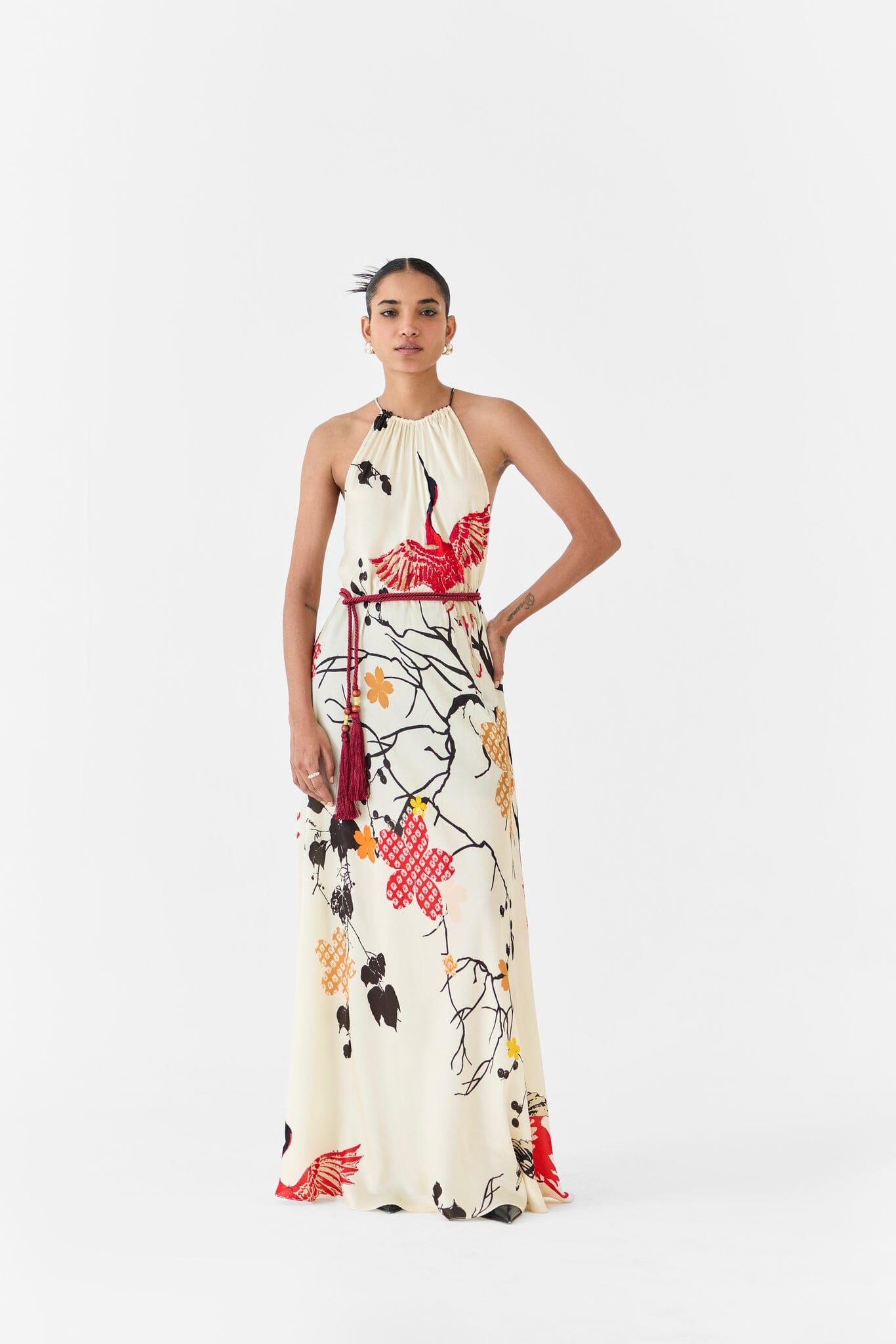 The Red Crane Halter Dress crafted from our stunning Vegan Silk fabrication, trans-seasonal, is a statement piece. The piece, made in our digitally printed crane & shibori print, has a halter neckline. With gathers at the neck, the dress has keyhole at the back and has been hand embroidered with sequin on the front. The neckline can be adjusted with the string. Wear it with heels for an elegant look.