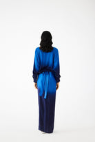 The Royal Shirt Draped dress crafted from our stunning Vegan Silk fabrication, trans-seasonal, is a statement piece. The piece, made in our hand dyed cupro, is a one single dress. With tie ups at the waist, this dress in royal & dark blue has a relaxed shirt on top and attached skirt at the bottom. Featuring a draped skirt, this piece can be tied with a knot and can be styled in different ways. Wear it with heels for an elegant look.
