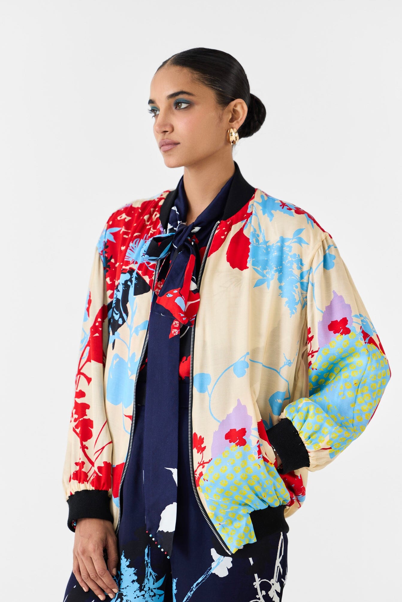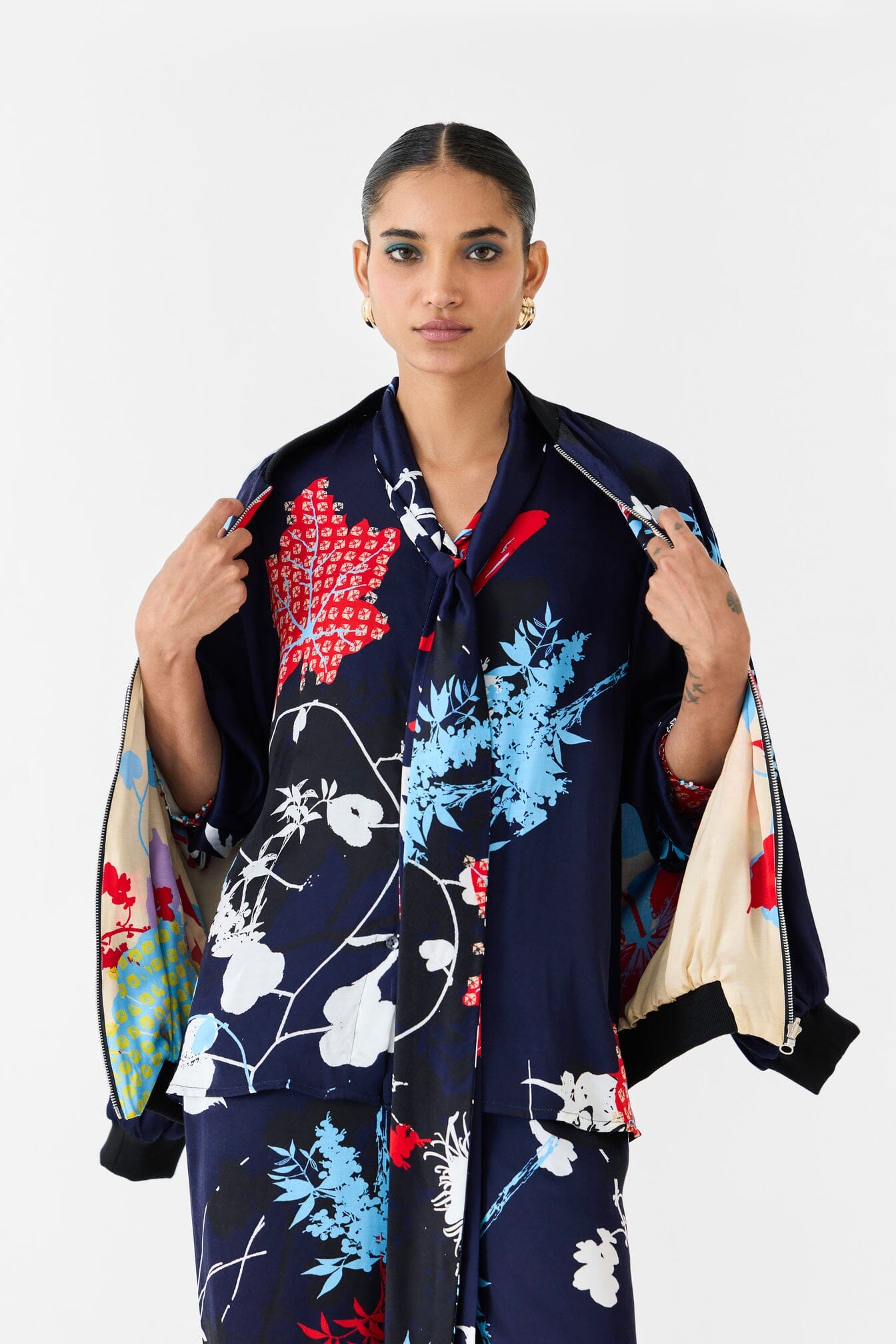 The Royal Ikigai Bomber Jacket crafted from our stunning Vegan Silk fabrication, trans-seasonal, is a statement piece. The piece, made in our digitally printed shibori and ikigai print, is reversible. The bomber jacket has a front zipper and is ribbed. It has a contrasting reversible side in our cream ikigai print. Wear it with heels and jeans for an elegant look.