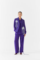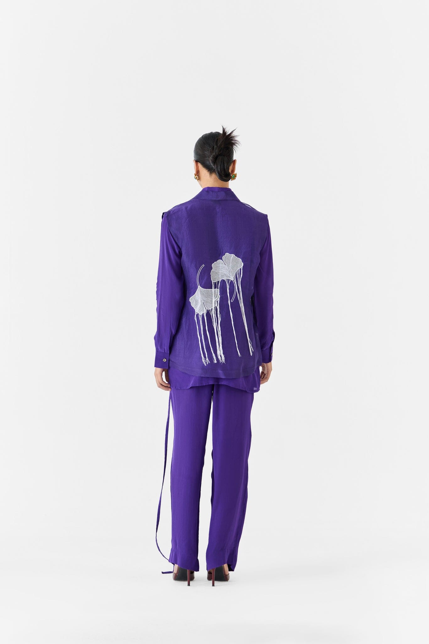 The Violet Organza Jacket crafted from our stunning organza fabrication, trans-seasonal, is a statement piece. The jacket, made in our hand dyed organza has a collar and lapel. It has a straight fit. It has been hand embroidered with flower motifs with hanging threads. It can be paired with our matching Violet shirt & Trousers Co-ord. Wear it with heels for an elegant look.