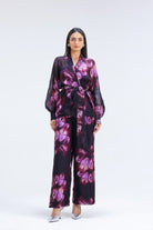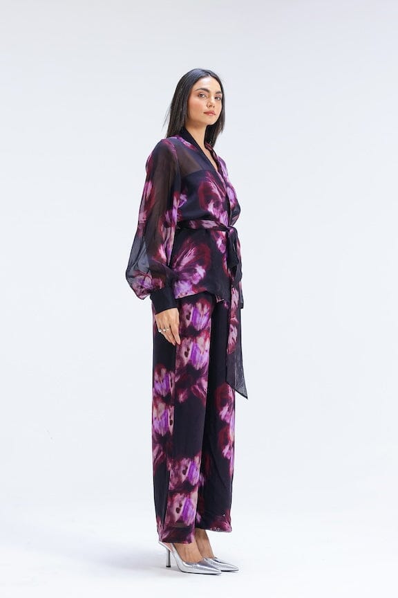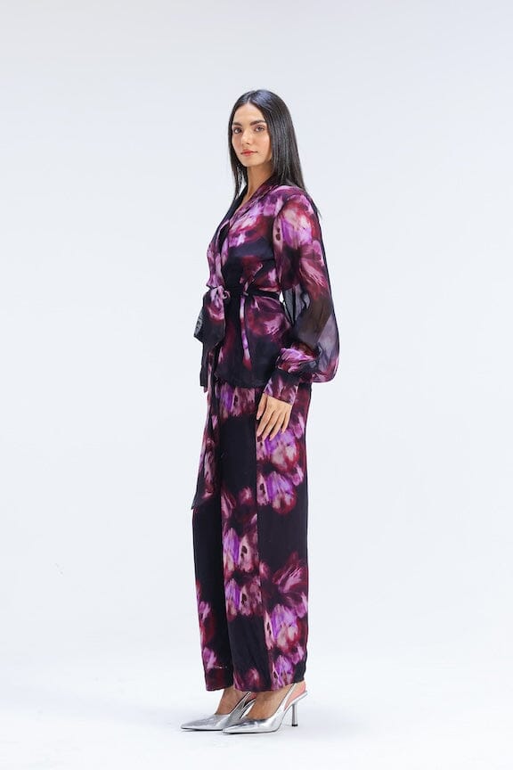 Step into effortless summer glam with this three-piece set, featuring a digitally printed organza jacket and coordinating elasticated pants. A muted yet striking wine print adds understated drama, while the tailored cut ensures comfort and style. Perfect for evening soirées or elegant gatherings.