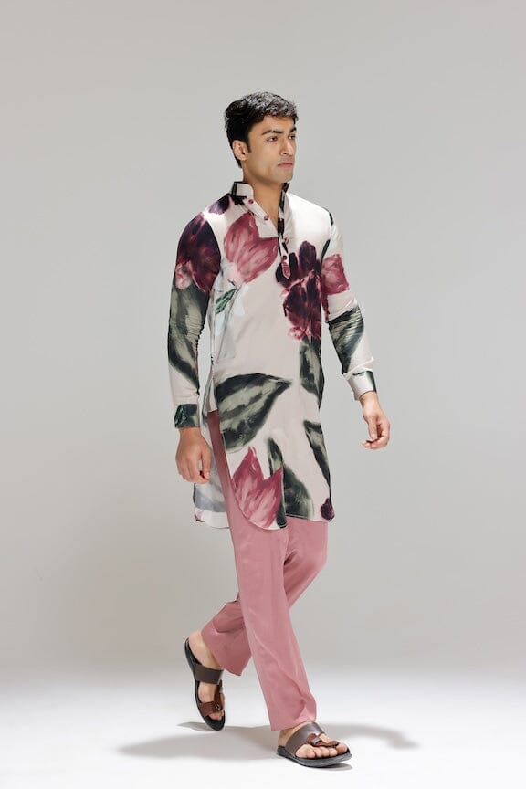 Crafted in lustrous cotton silk, this versatile kurta set is designed with an elegant closed collar and our signature ivy gardenia print. Paired with contrasting trousers, it balances traditional charm with modern sophistication—perfect for festive occasions or refined gatherings.