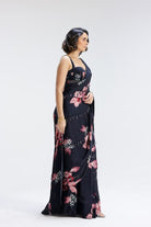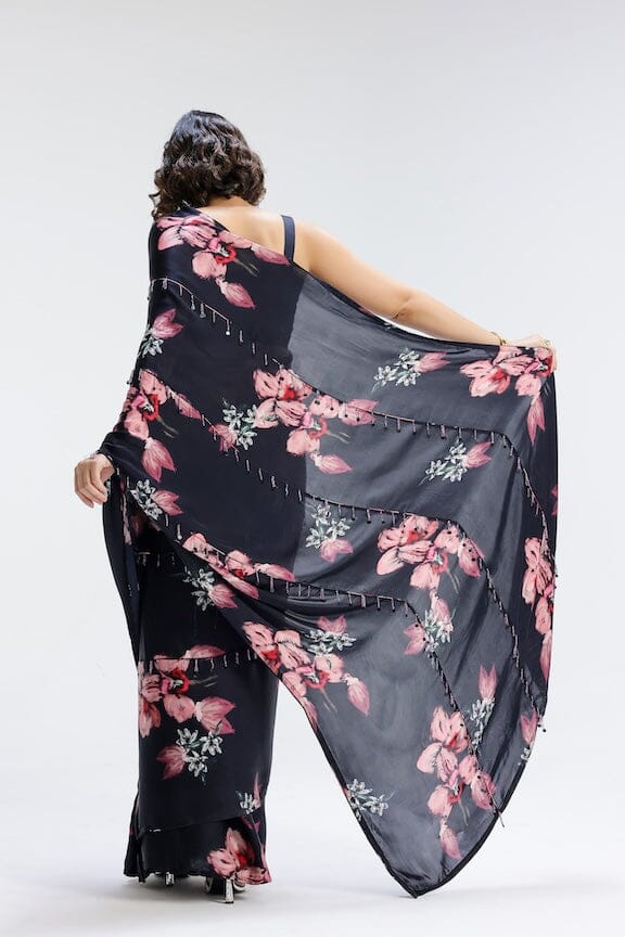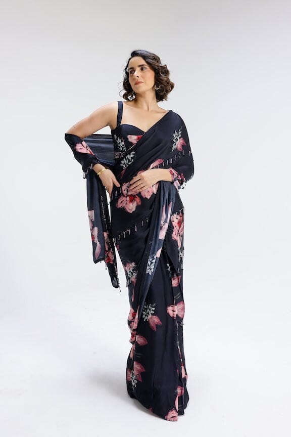 Get the drama of a saree with the ease of a skirt! This Georgette satin set features a diagonal hand-worked palla and an underwired bustier with intricate piping detail. Perfect for turning heads, it blends elegance with effortless charm.