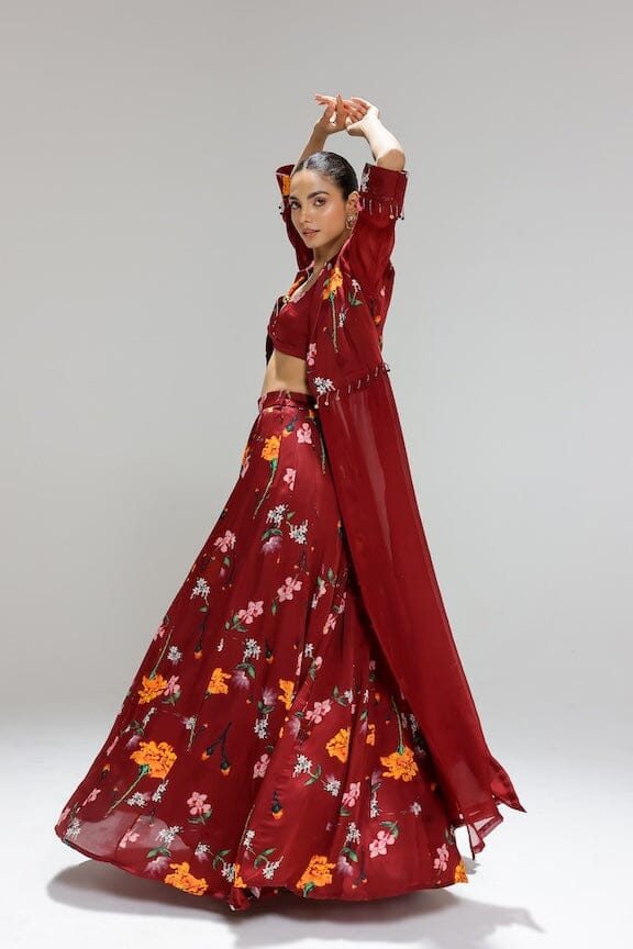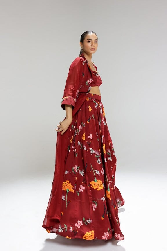 Turn heads at summer weddings in this vivid scarlett printed three-piece set. Featuring a flowing kalidar skirt, stylish blouse, and a solid contrast organza jacket with hand embellishment at the waistline, it perfectly blends elegance with festive glamour. Ideal for evening soirees and special occasions.