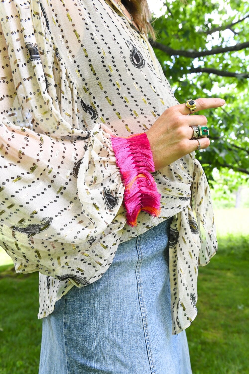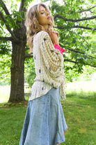 Ready-to-wear for the bold and fascinating. This black & white Bandhini kimono shirt in sheer chiffon with gold butti texture is your go-to for festive or boho styling. Its lightweight, airy fabric ensures comfort, while the intricate Bandhini design adds a touch of traditional elegance. Perfect with flared pants for a festive feel or skirts for boho chic. Effortless style for the woman ready to make a statement.