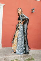 Make your demure look fancy-schmancy with this flowy maxi duster. Customized in lurex, the layering piece features tonal embellishments for a party-ready update. Style a no brainer casual look by pairing it with a basic tee and denim. Make it dressier with a maxi skirt and bralette for the upcoming Diwali gathering.