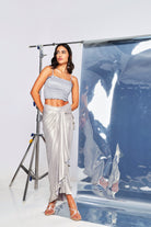 Crafted from a luxurious silver metallic fabric, this skirt is designed to captivate attention with its unique drape detail and mirror embellishments. The drapes of the skirt fall gracefully, creating a mesmerizing silhouette that complements the curves of the body. This statement skirt is versatile enough to transition seamlessly from a chic daytime look to an alluring evening ensemble.  Pair it with a fitted blouse or a tucked-in top in a neutral shade to allow the skirt to take center stage. Opt for strappy heels to elongate your silhouette and complete the look with understated accessories. Let your confidence shine as brightly as the metallic sheen of the skirt, and you're ready to make a lasting impression wherever you go.