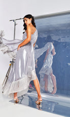 Keep accessories minimal to let the dress shine. Opt for strappy heels and a clutch in neutral tones to complement the silver hue. A sleek updo or soft waves will perfectly frame your face and allow the one-shoulder and cape sleeve details to steal the spotlight. Confidence is your best accessory – wear it with pride.