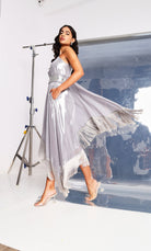 Perfect for evening soirées or upscale events, this dress will have you stealing the spotlight effortlessly. The metallic silver fabric ensures you shine with sophistication and style.