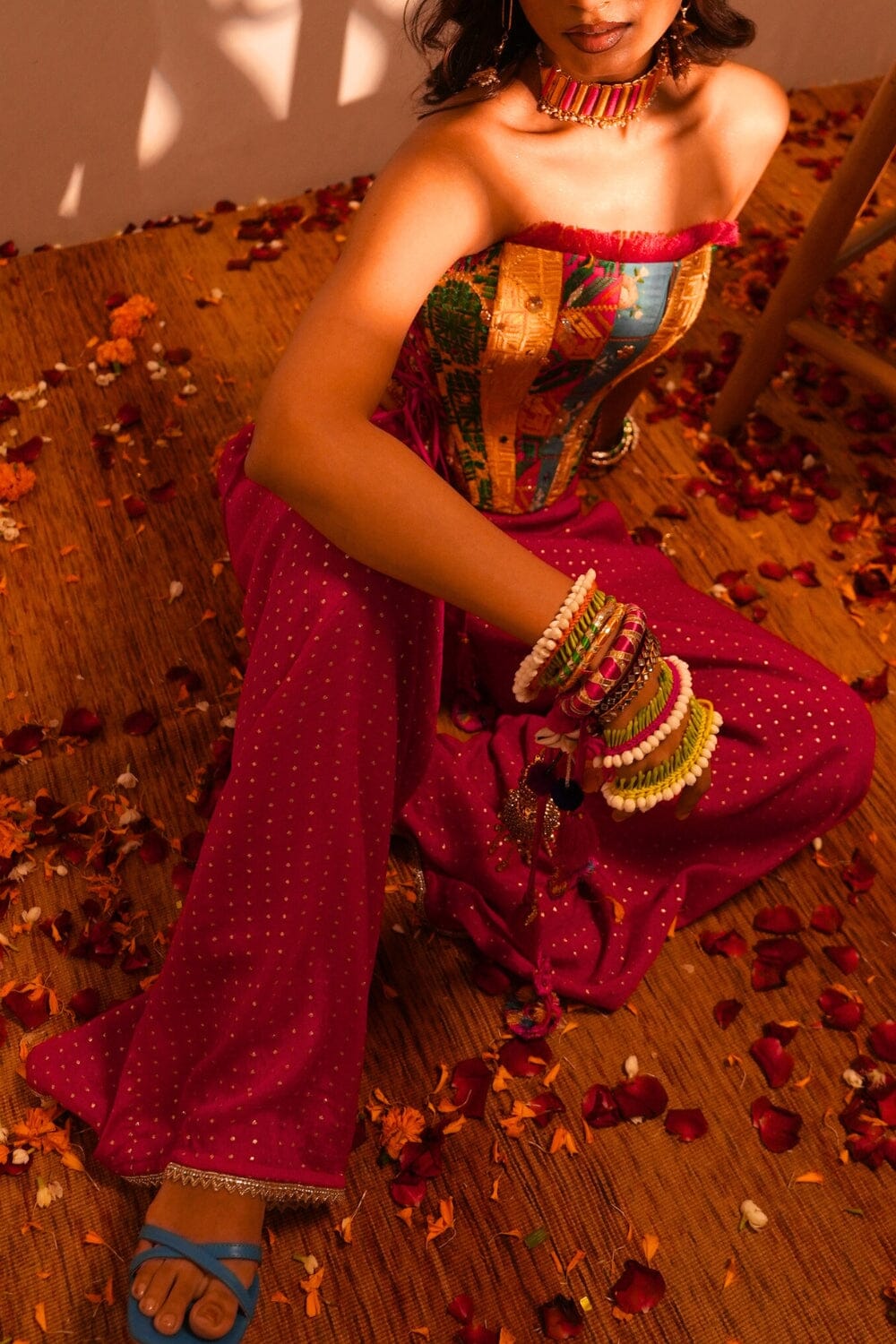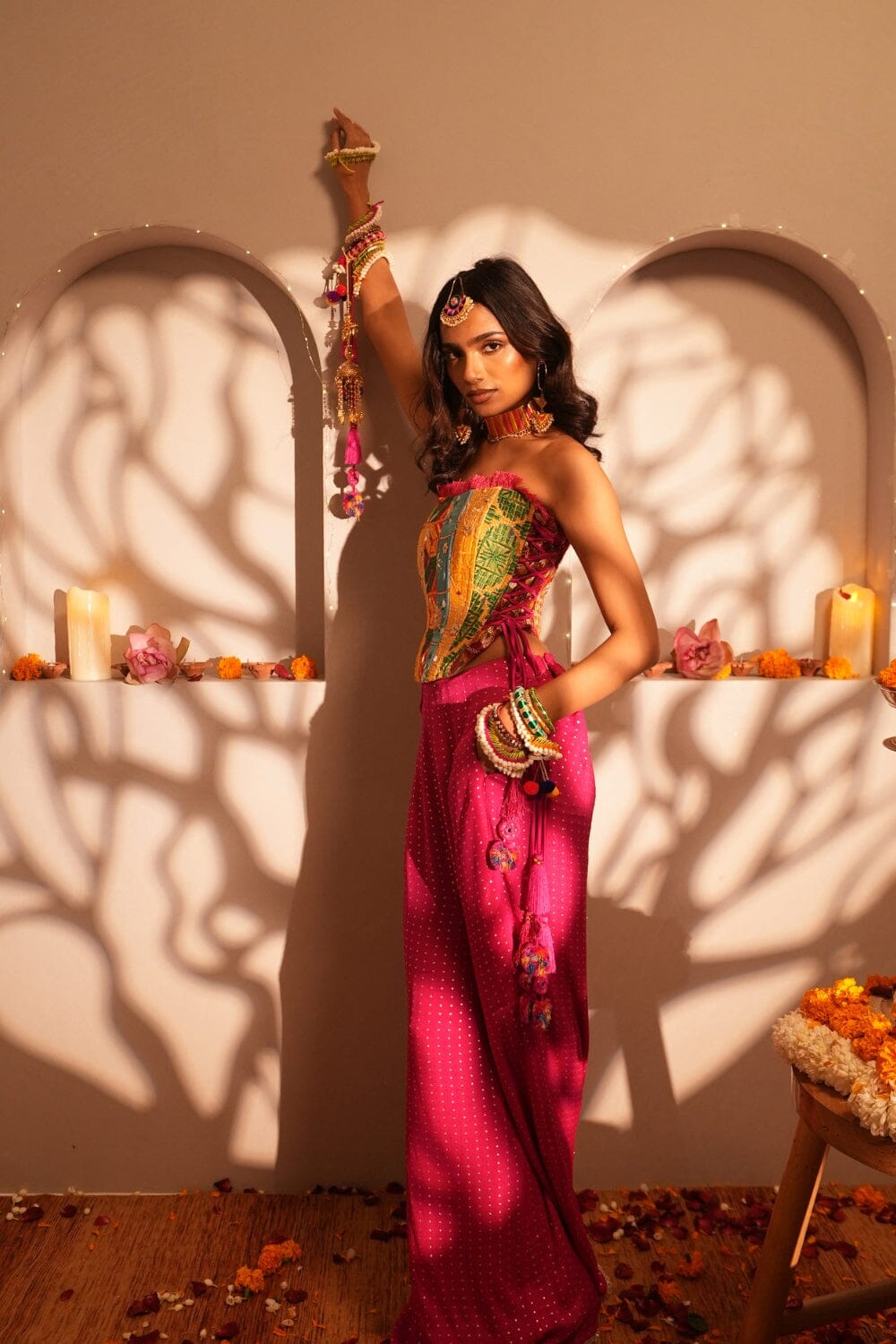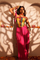 Elevate your style with our Spinal Pink Pants. These high-waisted trousers feature front pleats, pockets, and intricate lace detailing at the hem. Made from stunning lurex jacquard fabric, they offer a chic shimmer. Perfectly versatile, they pair effortlessly with bustiers, kurtis, tunics, and crop tops for a polished, sophisticated look.