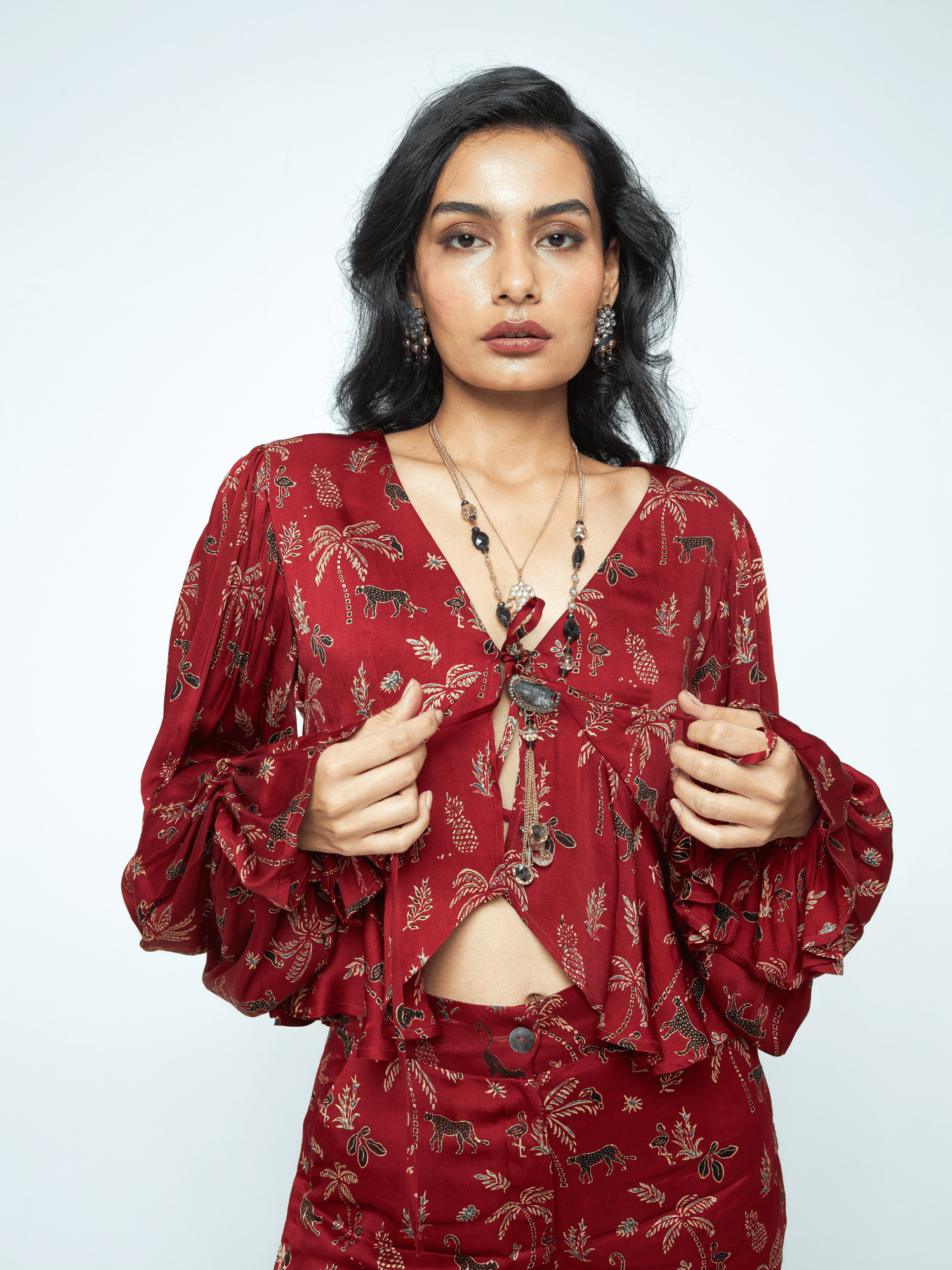 A flowy full-sleeve top in modal with the Wild Parade print. Designed with soft blouson sleeves and a front tie-up closure, it brings movement and ease to an elevated silhouette that works for both day and evening.