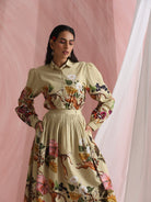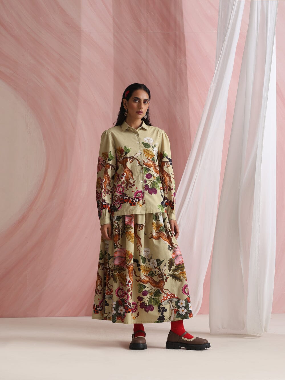 A straight-fitting shirt with gathered detailing on the sleeves giving it a slight exaggerated look. This can be paired with the forest skirt to complete the look.