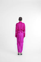 Gigi shirt in pink features a free size shirt. This silhoutte fits and suits all body type and shape. Gigi shirt is made in pink colour on Pure cupro satin fabric. The touch and feel of the set is super soft and buttery. The shirt has a contrasting green brocade patch in the center.