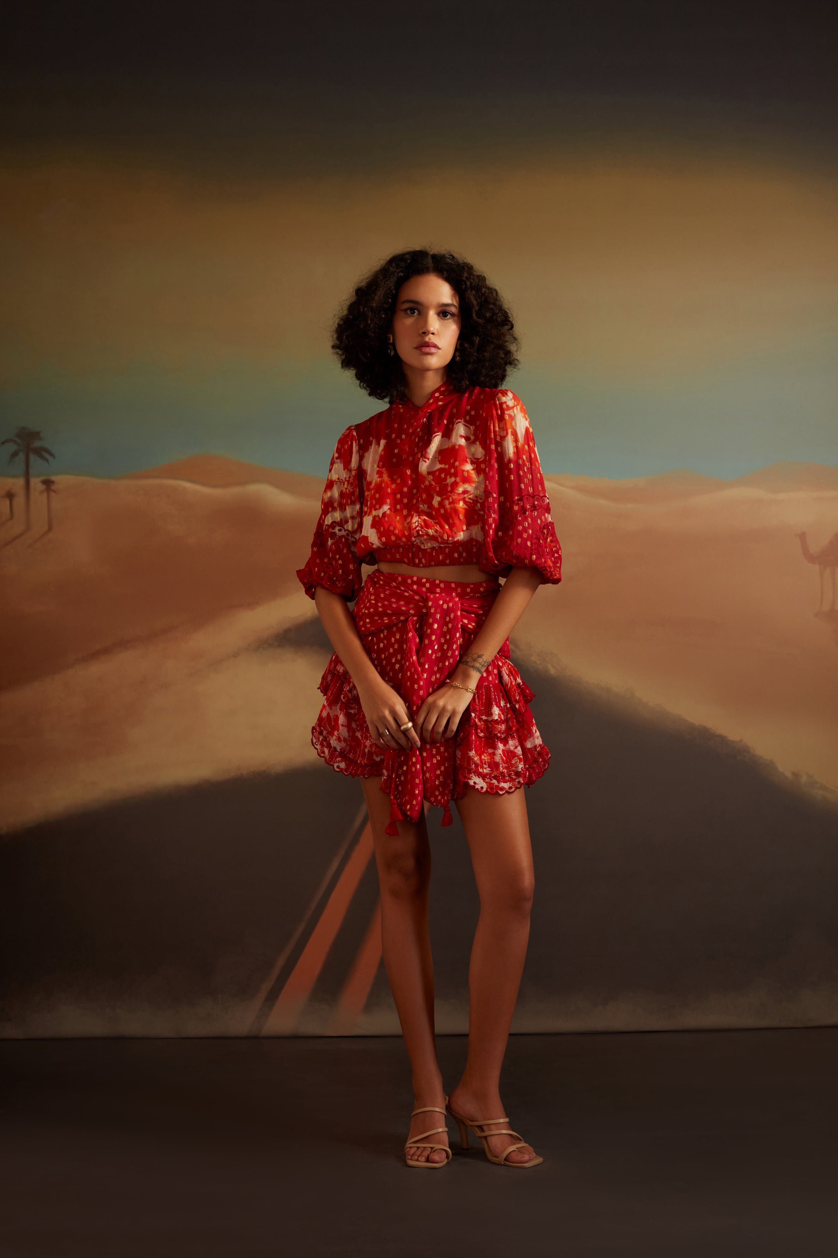 Pleated lurex blouse with tie up mini printed lurex skirt