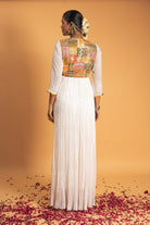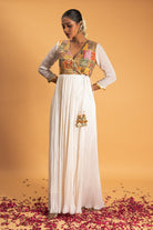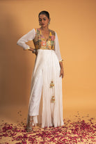 The Ivory Angrakha Kurta Pant Set features Gota applique work on the yoke of the Kurta with hand crafted beautiful Tassels. The outfit is paired with an ivory Chanderi pants.