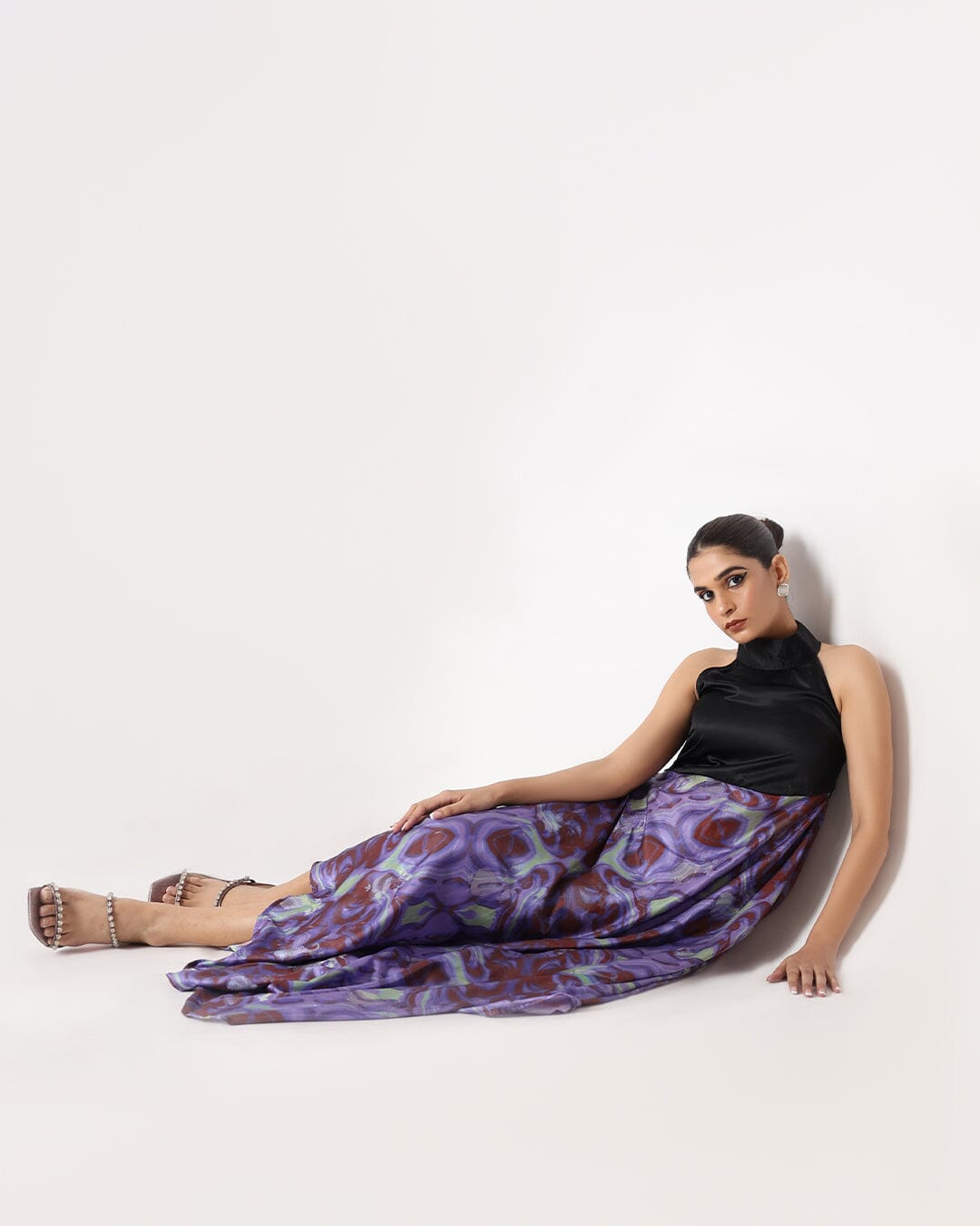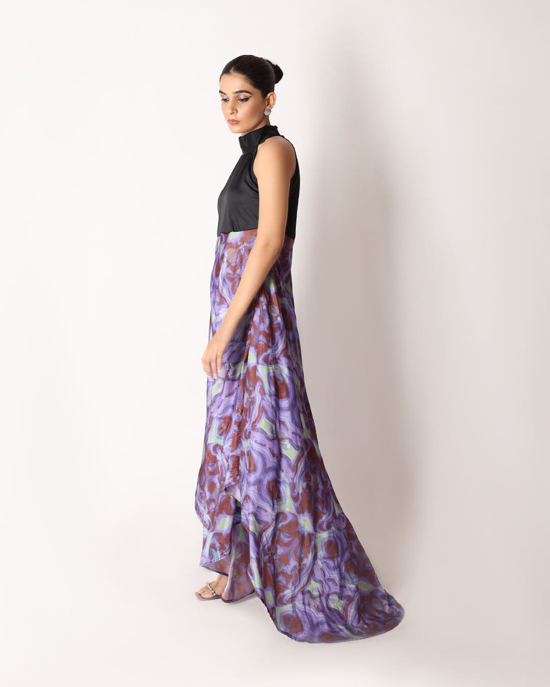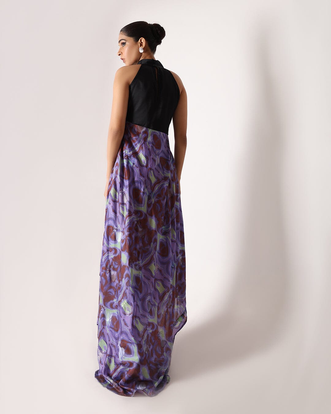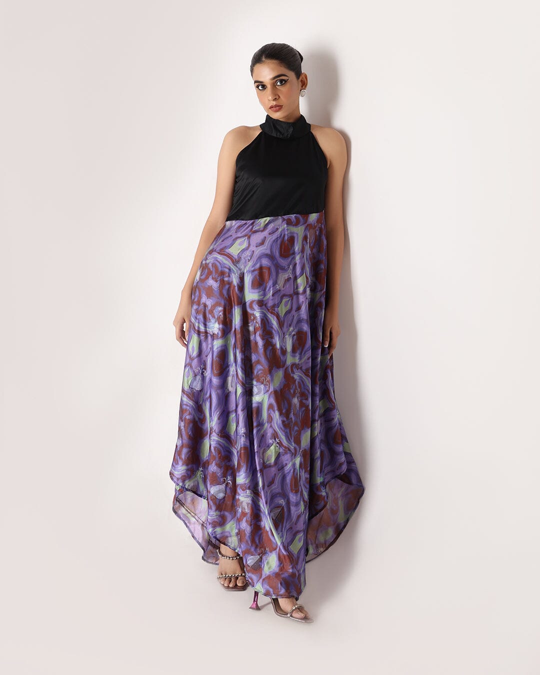 Vestido largo Allure Galaxy y halter negro. Confeccionado con una lujosa tela de seda banarasi, este vestido combina el encanto cautivador de un estampado de galaxias con un elegante escote halter y un corte asimétrico en la parte inferior, creando una silueta fascinante y elegante.