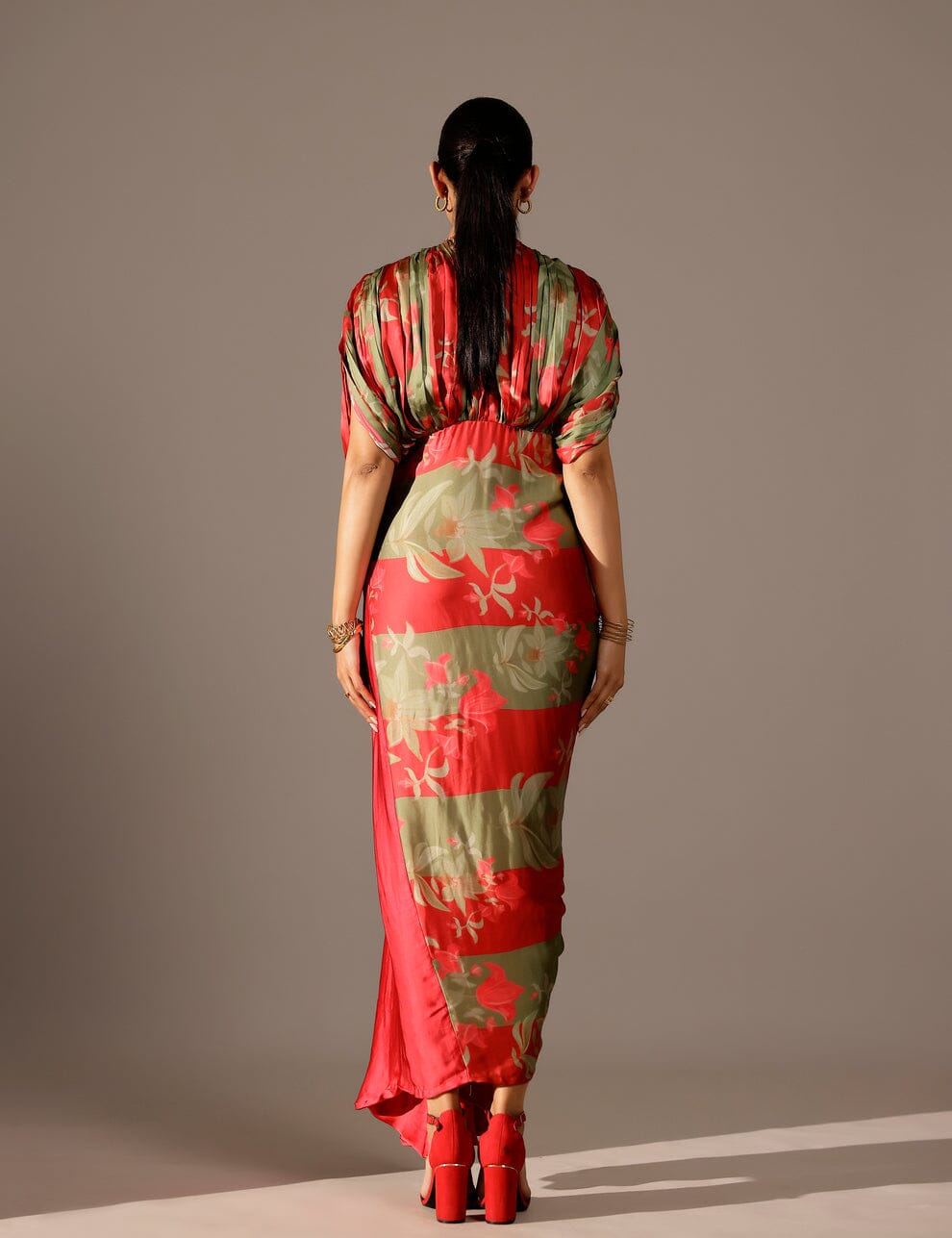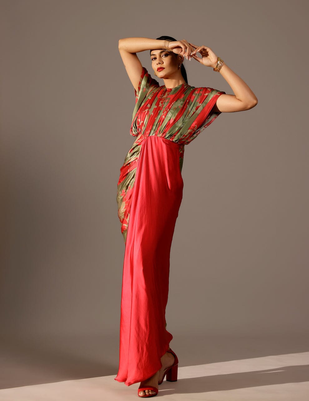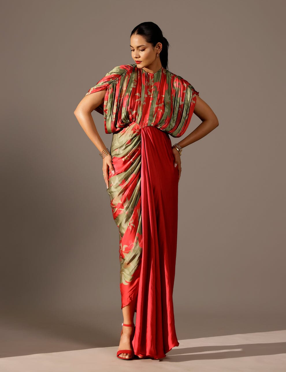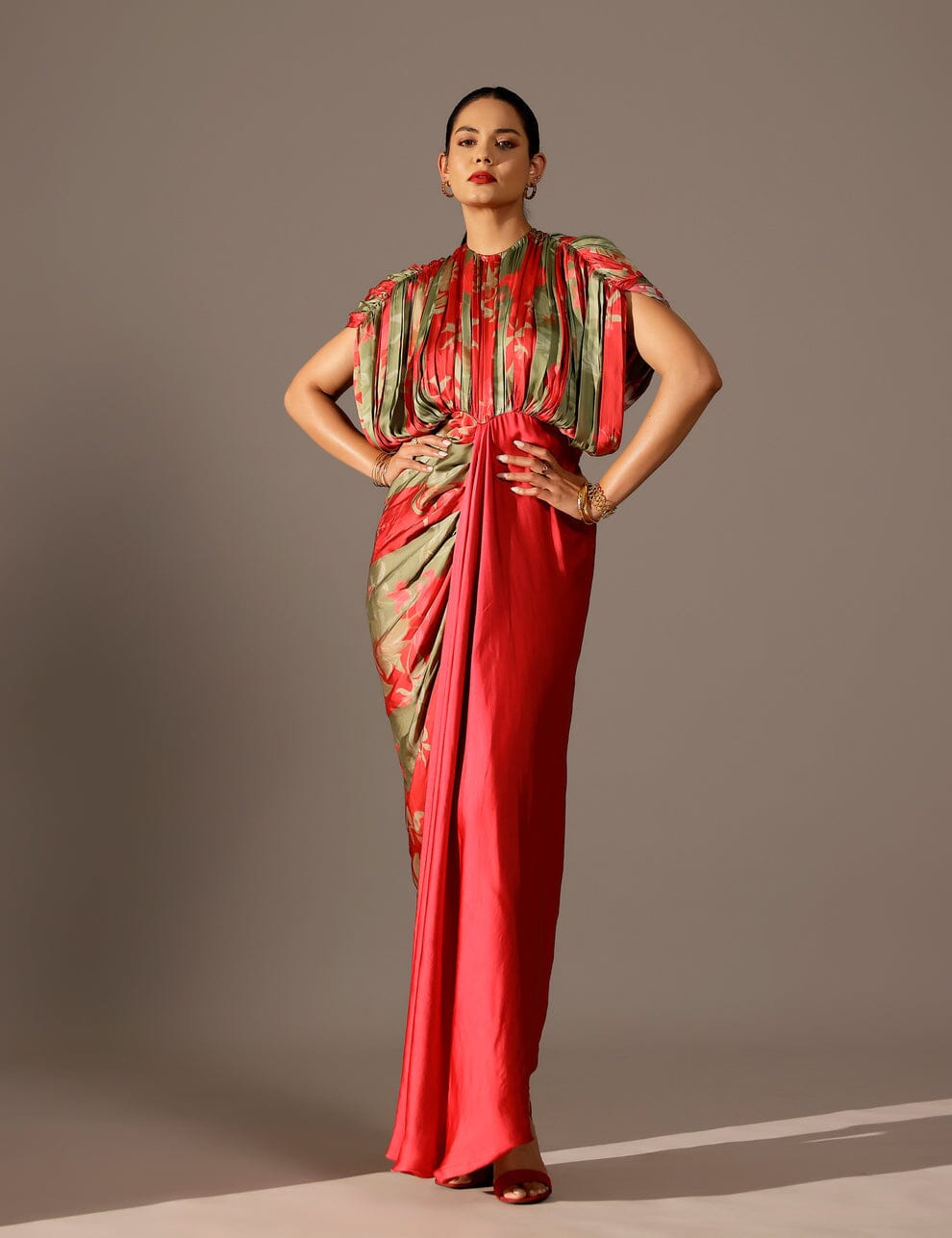 Inspired by the vibrant hues of Jaipur, this georgette satin gown is designed for warm winter occasions. The slim fit through the waist flows into an asymmetric drape, while the hand-draped bodice creates a striking silhouette. Finished with a contrasting fall at the hemline, this piece adds a graceful pop of color — perfect for evenings that call for understated drama.