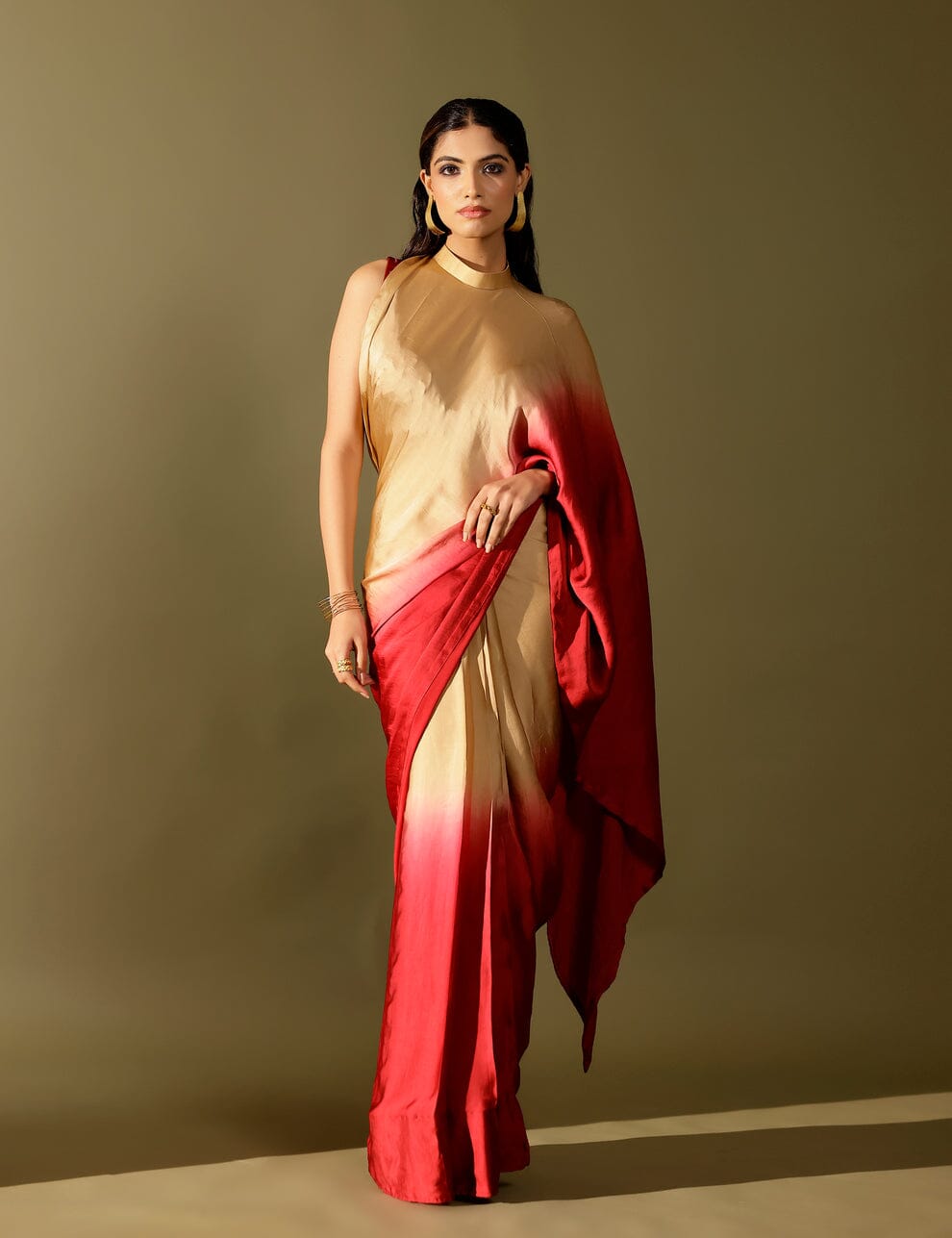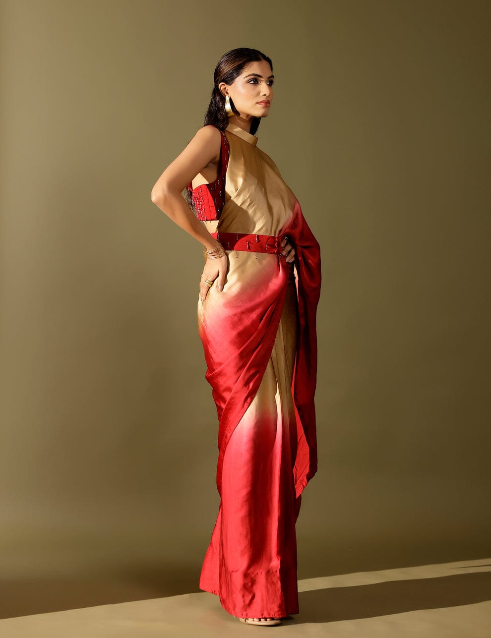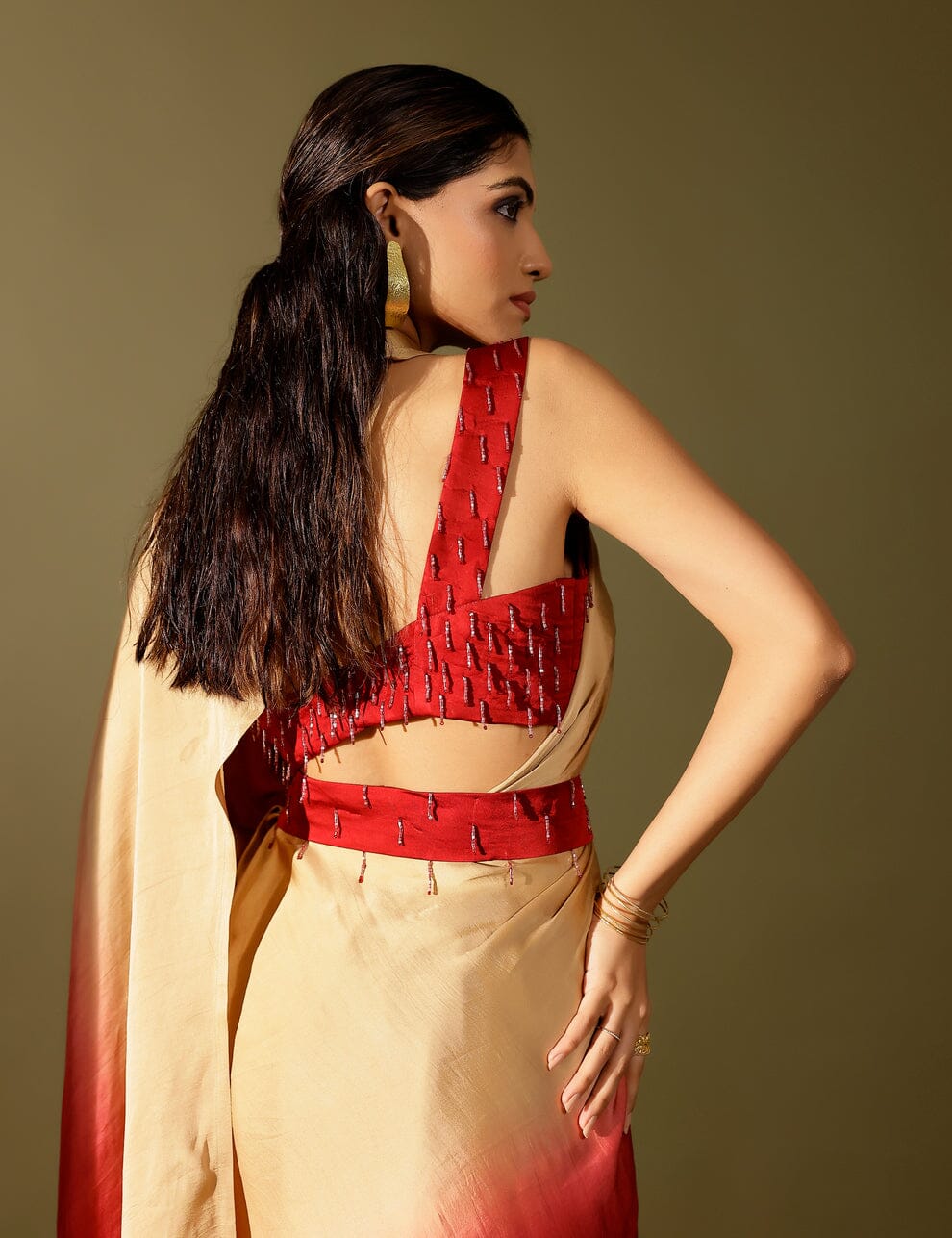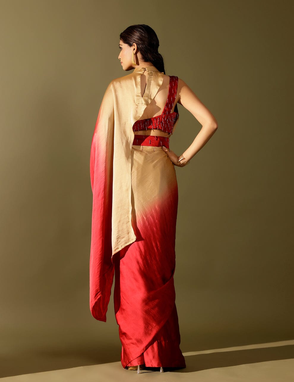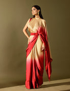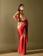 The Basale side collar pallu saree celebrates the beauty of ombré with fluid georgette satin drapes and our signature collared pallu design. Paired with a hand-embellished blouse, it strikes the perfect balance of tradition and modernity. An effortless showstopper, it’s all you need to dazzle through winter weddings and festive soirées.