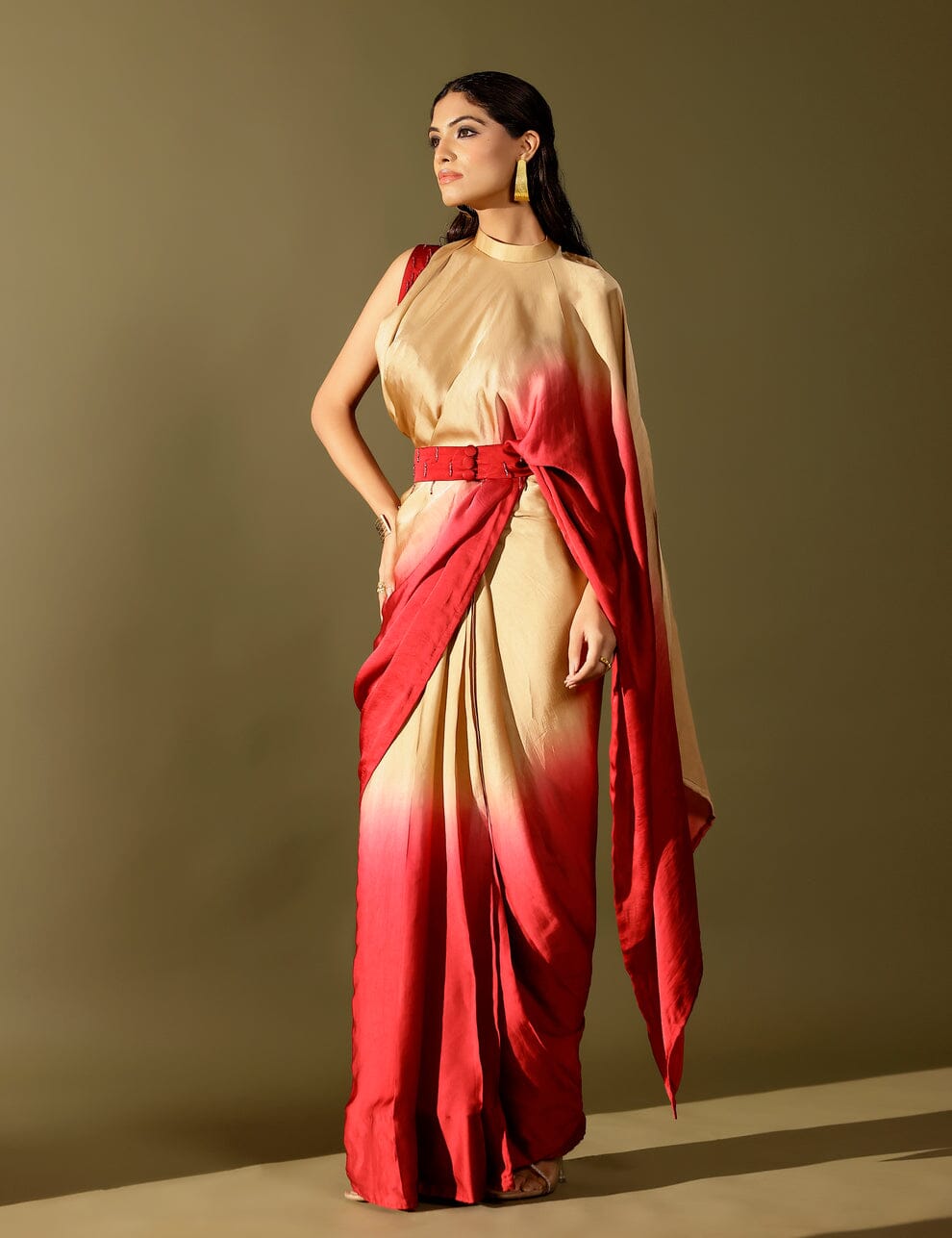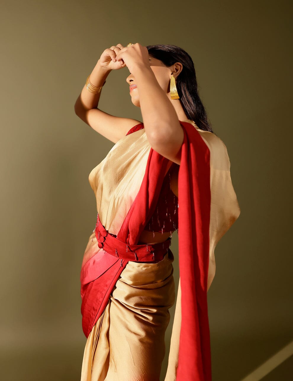 - Look: Three-piece set (saree, pallu, blouse)