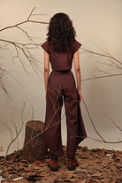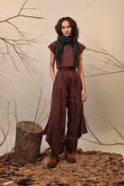Raglan style crop top made in handspun cotton teamed with pleated cowl pants with waist band and side button opening with side pockets. Total set comes in 2 pcs. Please Note: Scarf is not included in the Set.