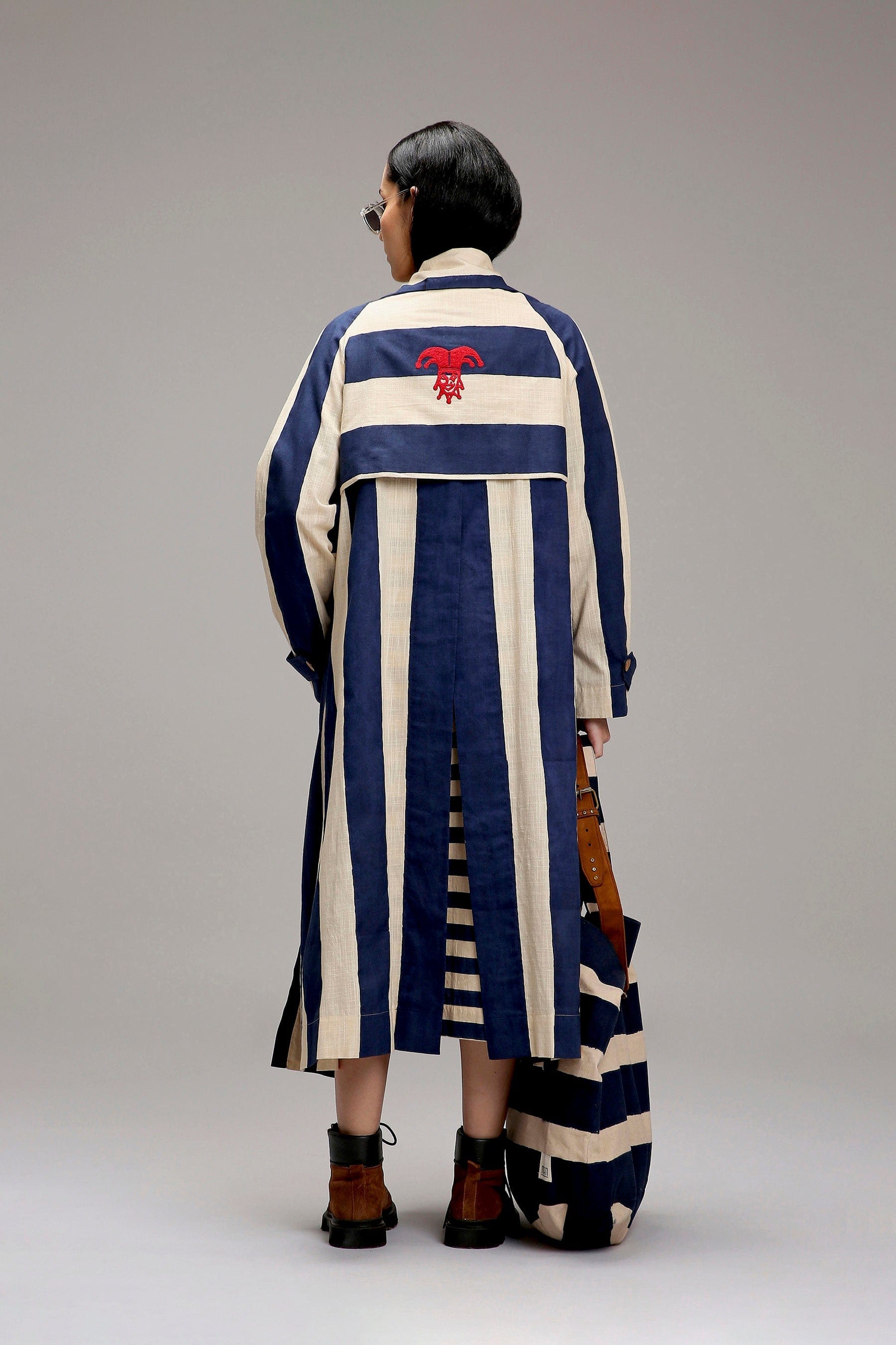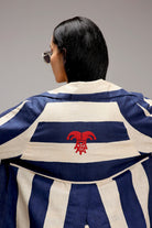 Crafted from handwoven cotton, this jacket blends timeless style with sustainable craftsmanship. Featuring hand-block printed fabric, full sleeves, and intricate button detailing, it stands out with bold joker embroidery on the back and a stylish slit opening for added flair.