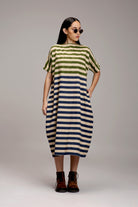 Crafted from handwoven cotton, this dress features beautifully hand block printed stripes for a timeless look. Designed for comfort and functionality, it includes two side pockets and a back opening. Style it with our matching jacket to complete the ensemble.