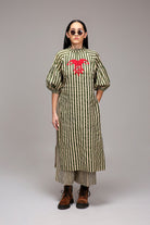 The Classic Acra Tunic is a loose, OVERSIZED comfortable kaftan-style outfit made from handspun cotton. It features hand-block printed stripes and beautifully hand-embroidered sleeves with joker thread work. With a front button opening and handy side pockets, it blends ease with style. Pair it with the matching striped pants for a complete and modern look.