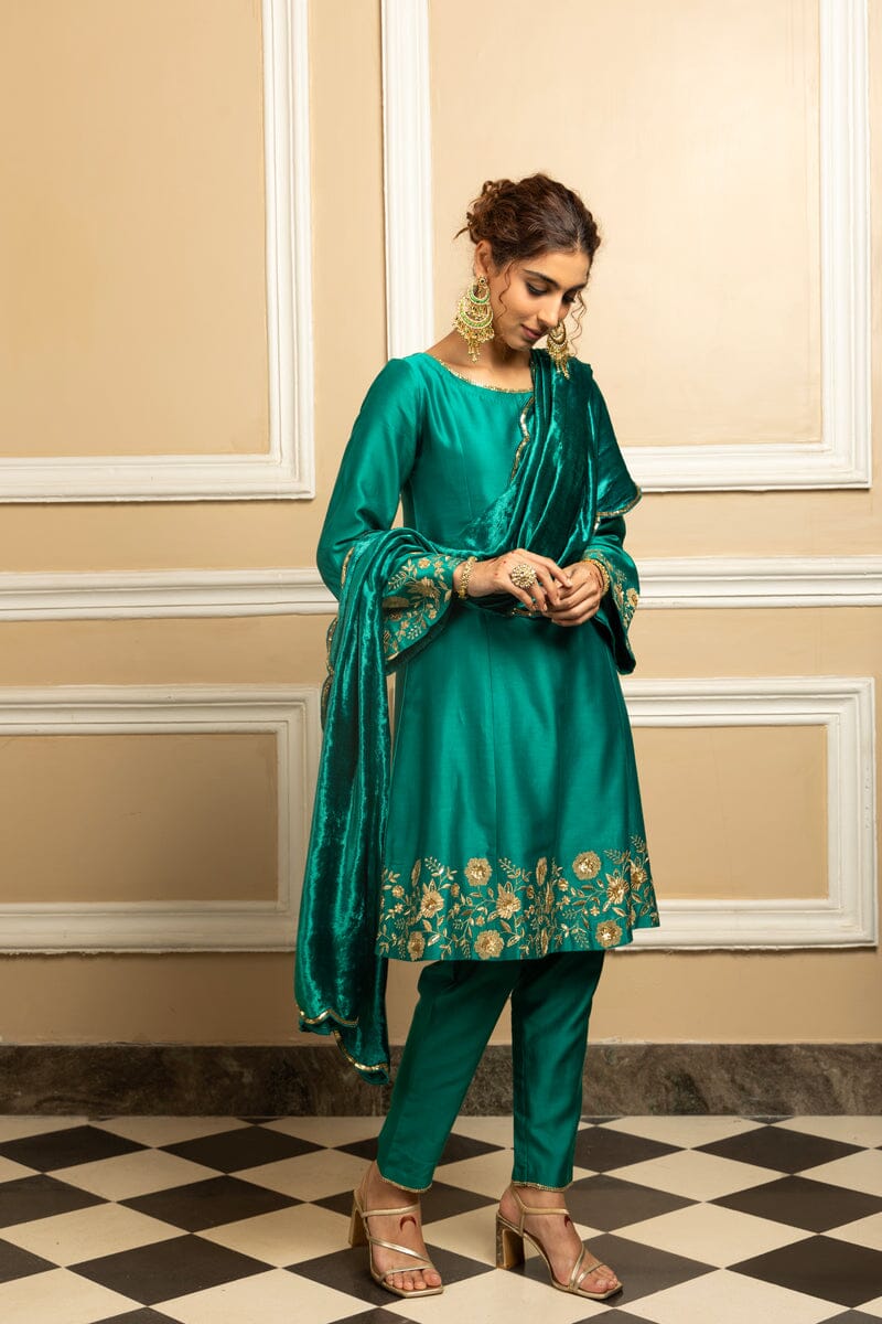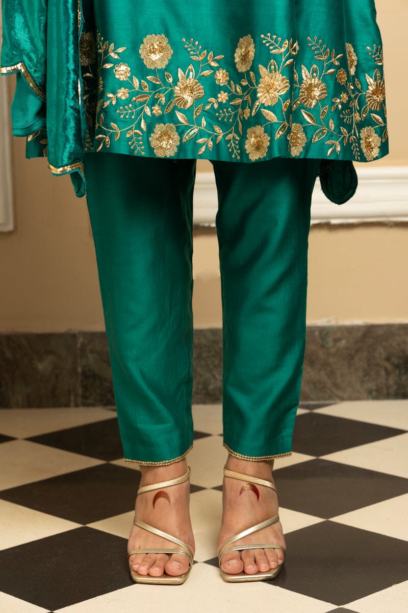 Introducing the Ekaya Green Kurta Set, a captivating blend of tradition and modern style. This short A-line silk chanderi kurta is paired with sleek straight pants and a velvet shawl, featuring intricate zari embroidery & sequin embellishments.