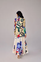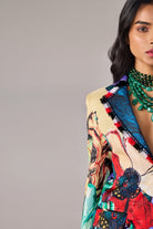 Abstract Floral Print, Long Line Blazer With Hand Embroidered Tassle Outline And Patch Pocket Detailing