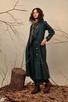 Full length jacket with peter pan collars and full sleeves with side pockets. Full button closer in the front. Layer it on any cord set from this collection or team it up with pieces in your wardrobe. A perfect travel jacket.