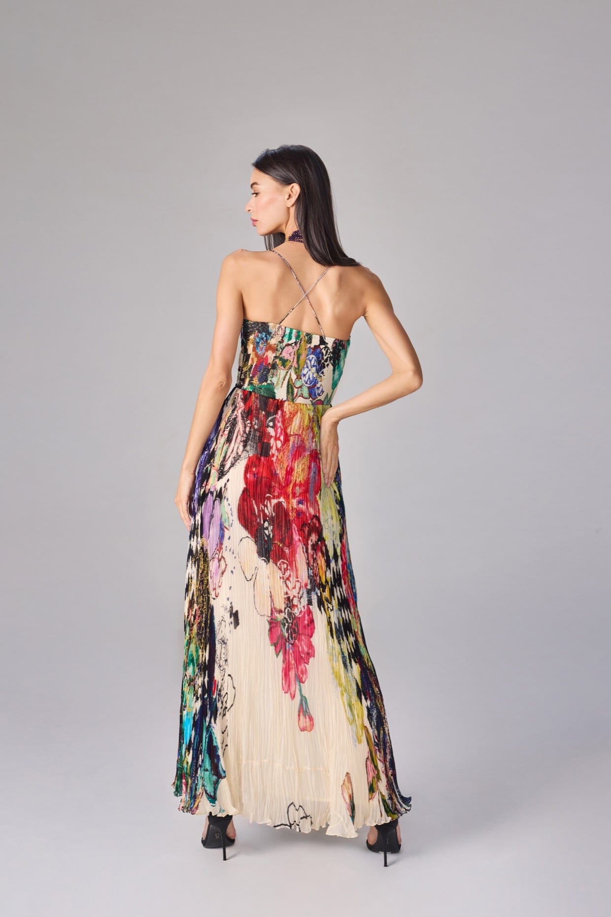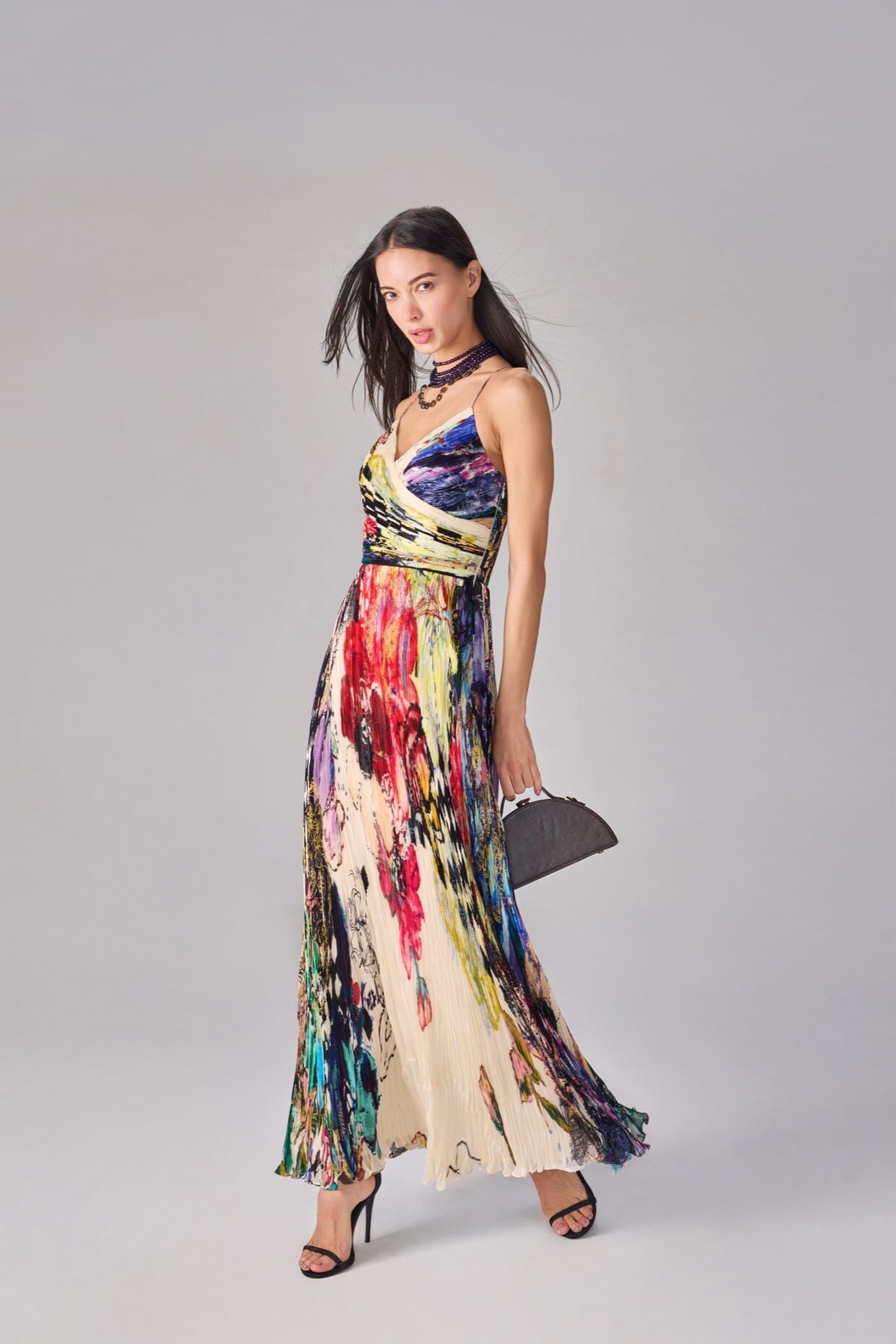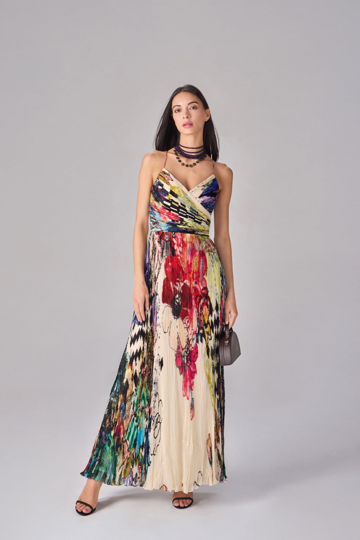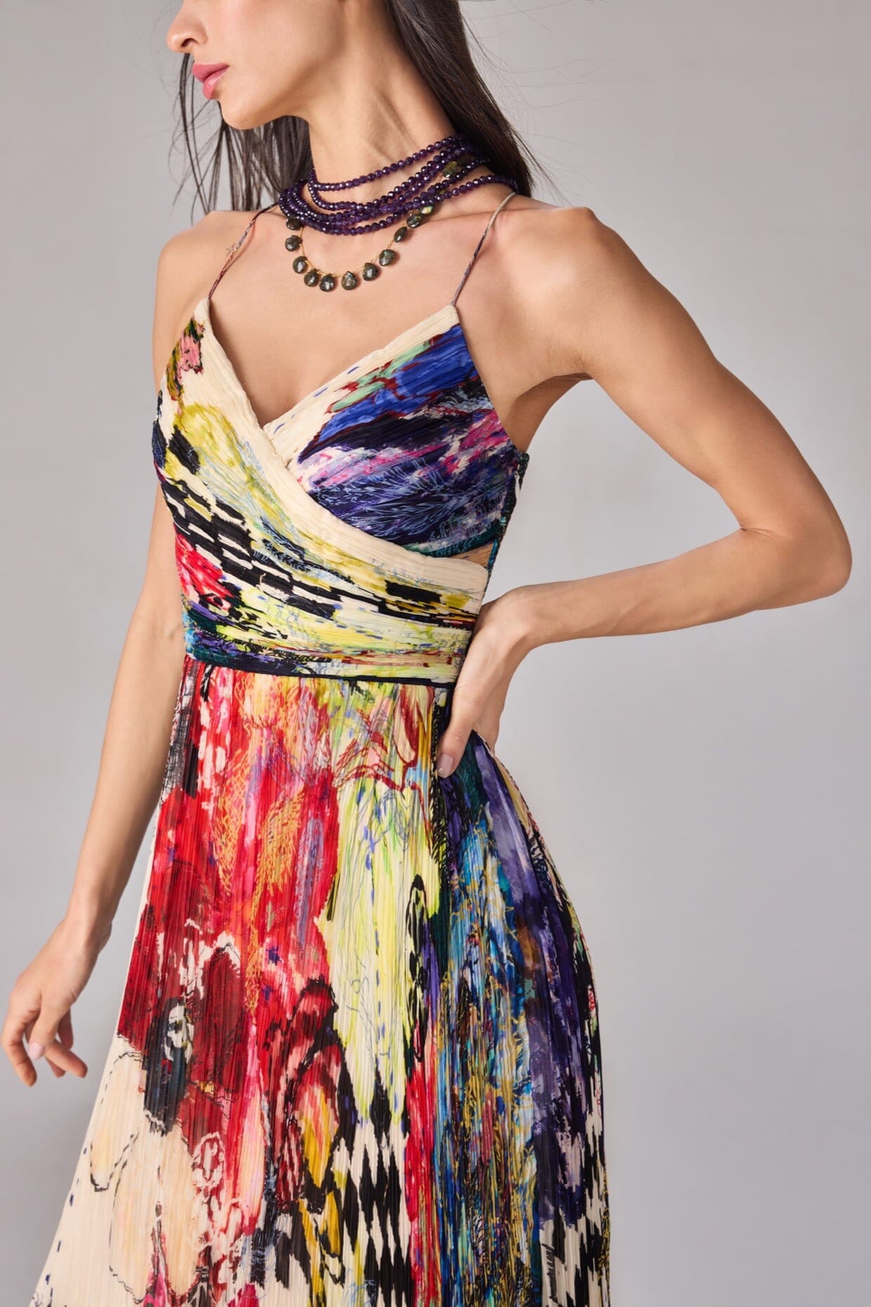 Floral And Abstract Print, Hand Micro Pleat Maxi Dress With Surplice Bodice And Noodle Straps