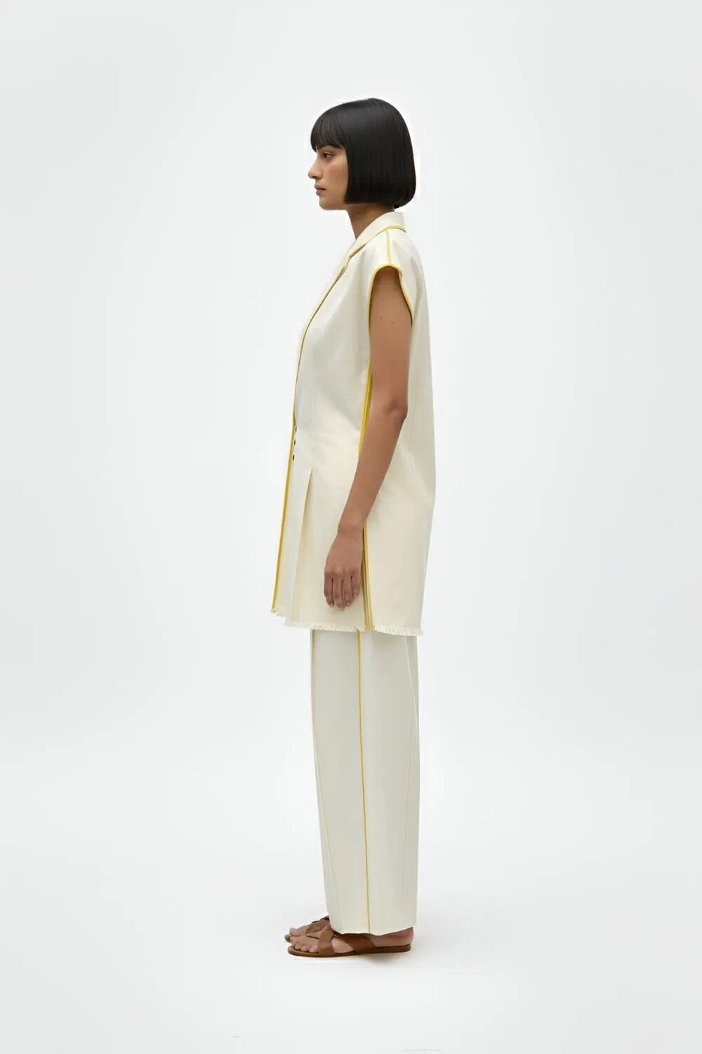 This captivating blazer set in ivory-mango yellow features a blazer with mango yellow piping over the collar, shoulders, and sleeve hem that beautifully accentuates the ensemble. It also has 3 buttons that enhance the overall look of the set. Paired with matching color ivory pants, which have pintucks starting from the waist, which open at the bottom that making the co-ord look more sophisticated. Perfect for any occasion, this set effortlessly combines sophistication with unique design elements, making a seamless transition from day to night.