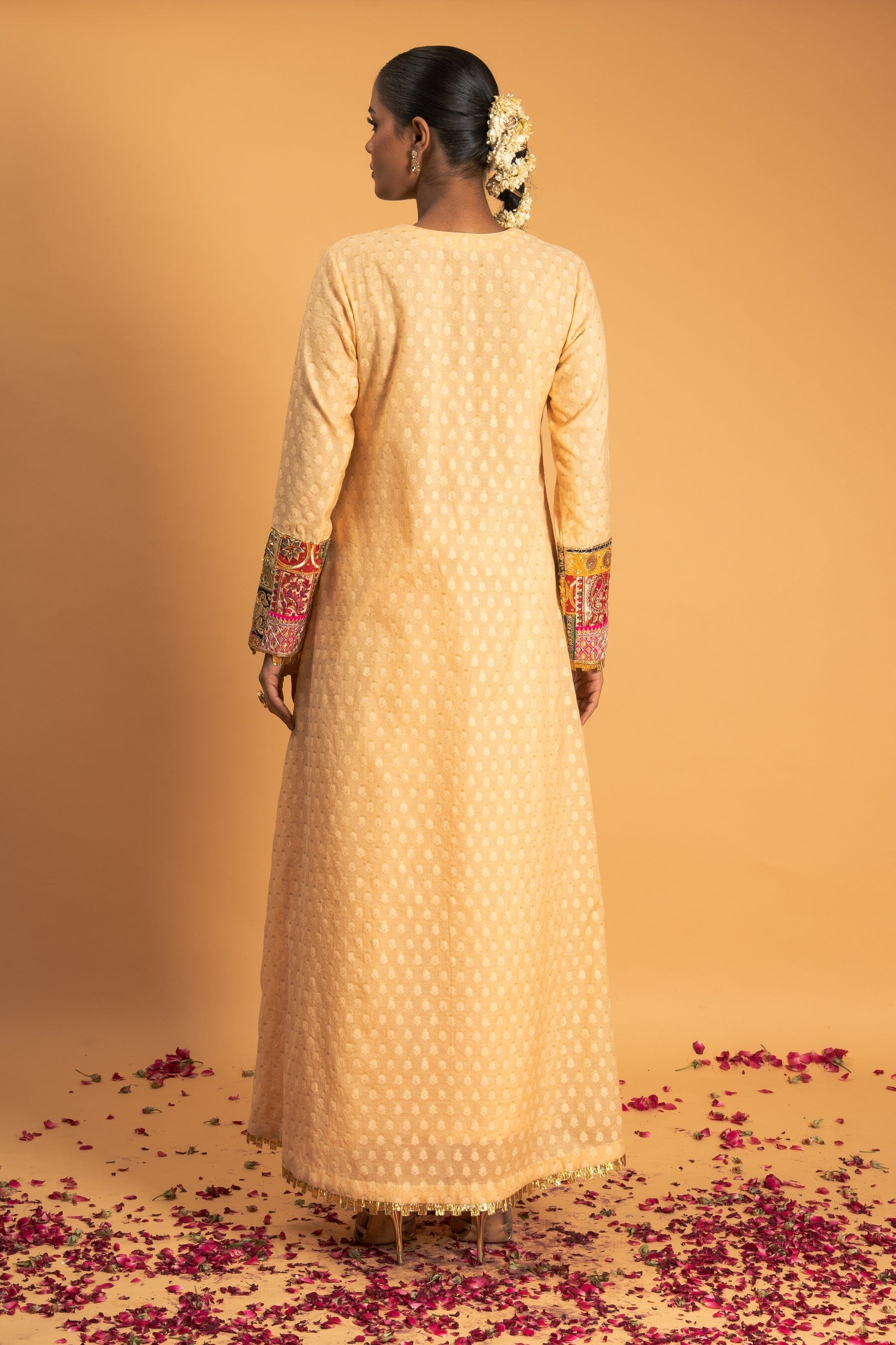 The Woven Chanderi Kurta Set in Light Peach features Gota applique work on the sleeves of the kurta. The outfit is paired with a Chanderi pants with Gota borders.