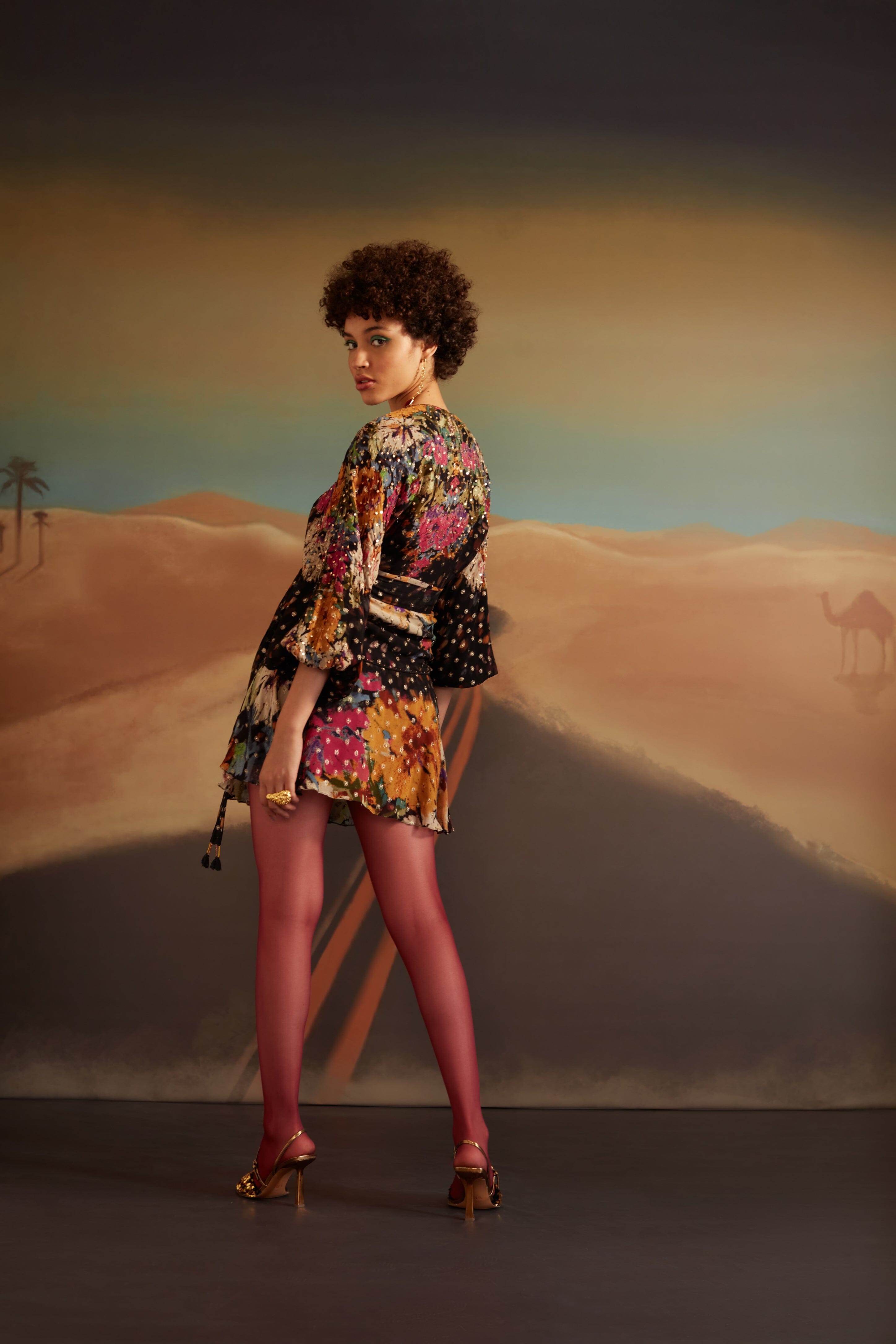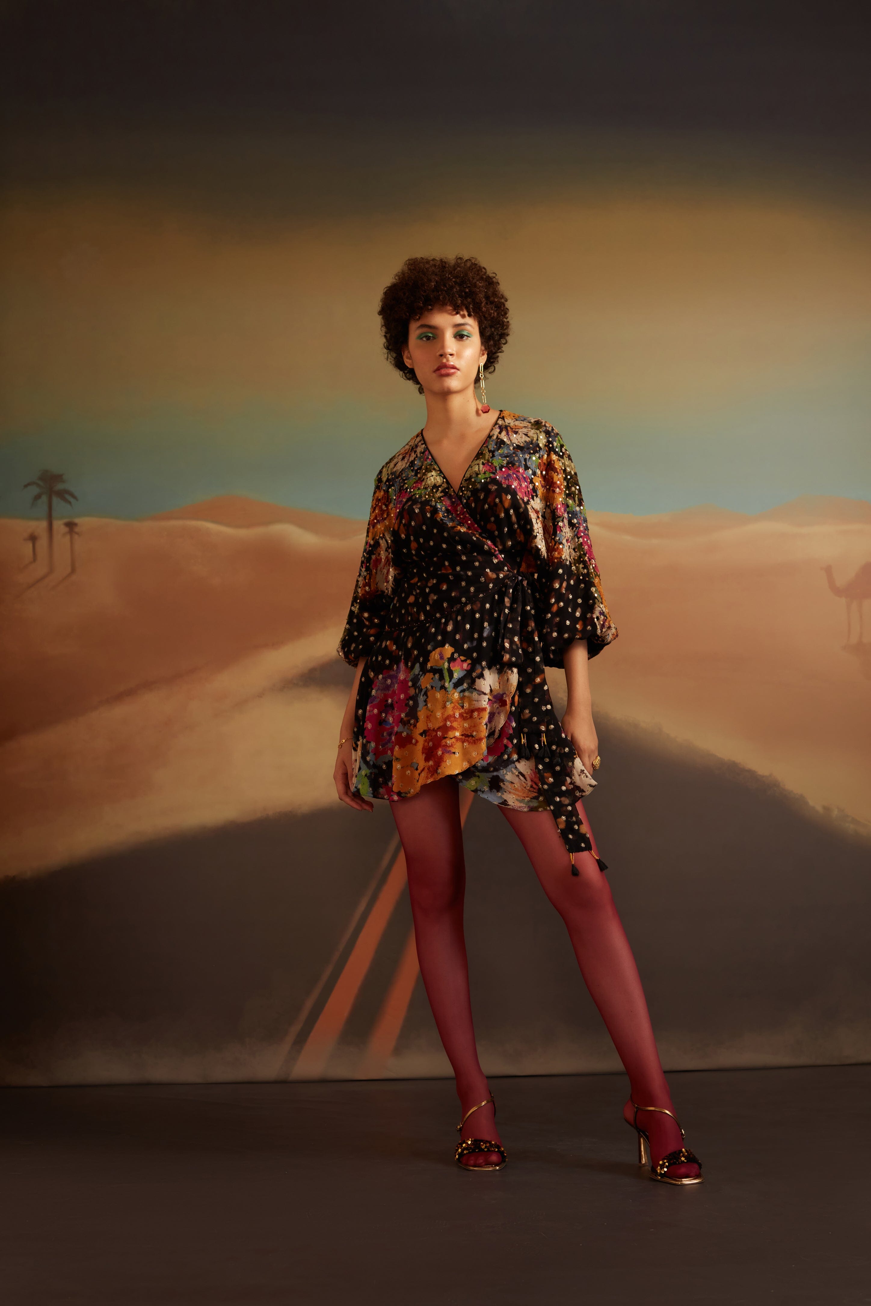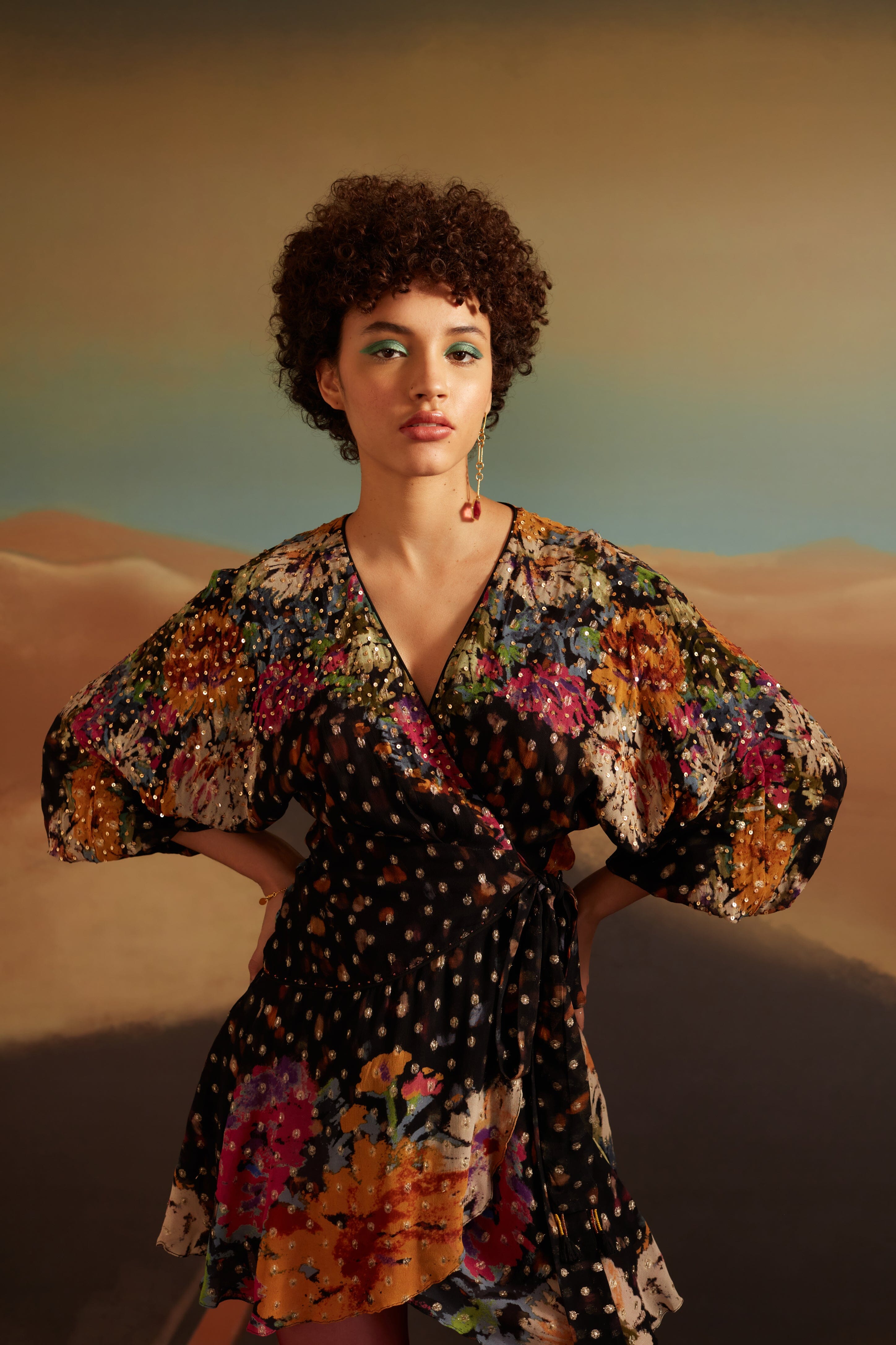 Sequenced embroidered wrap dress ,lurex printed georgette