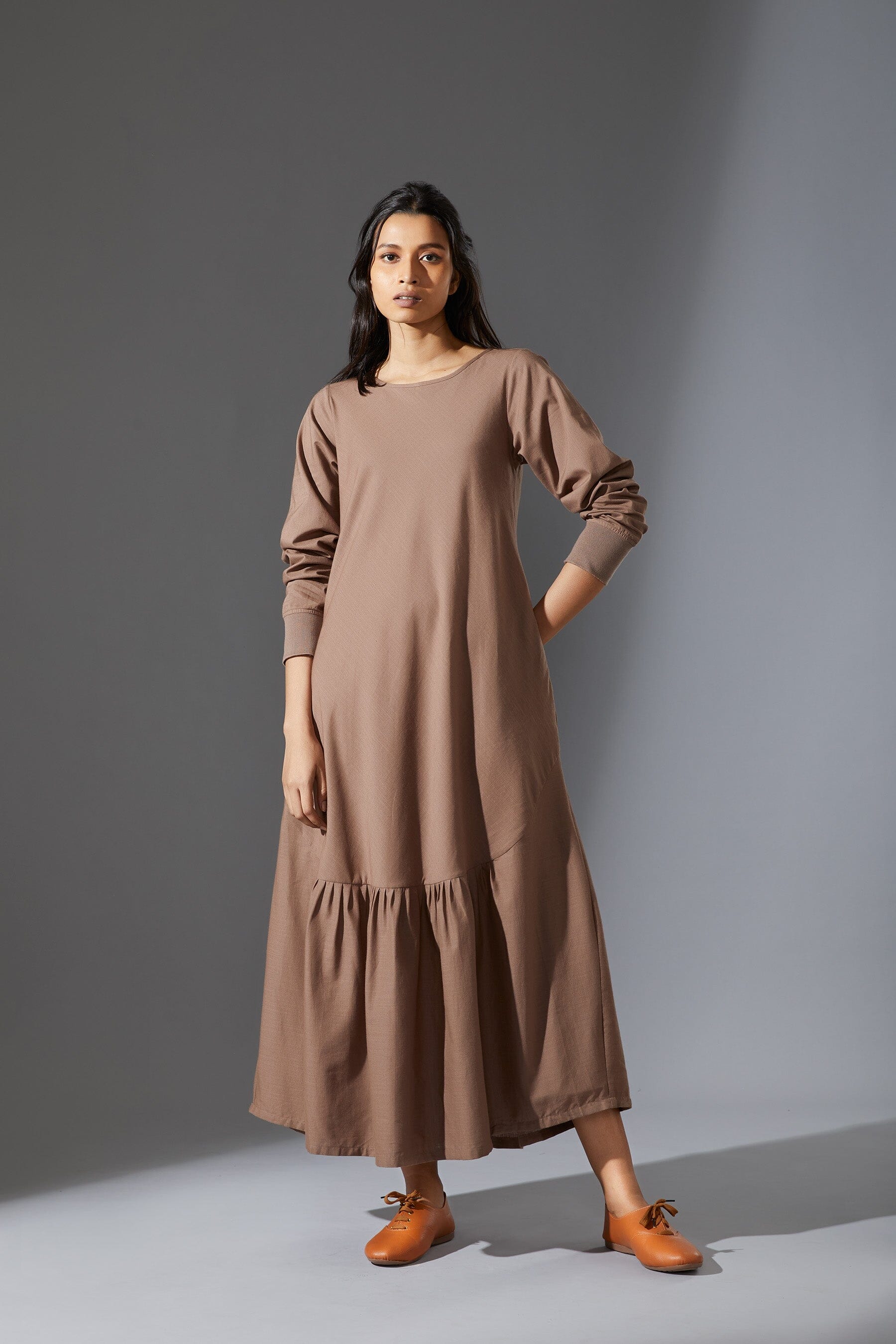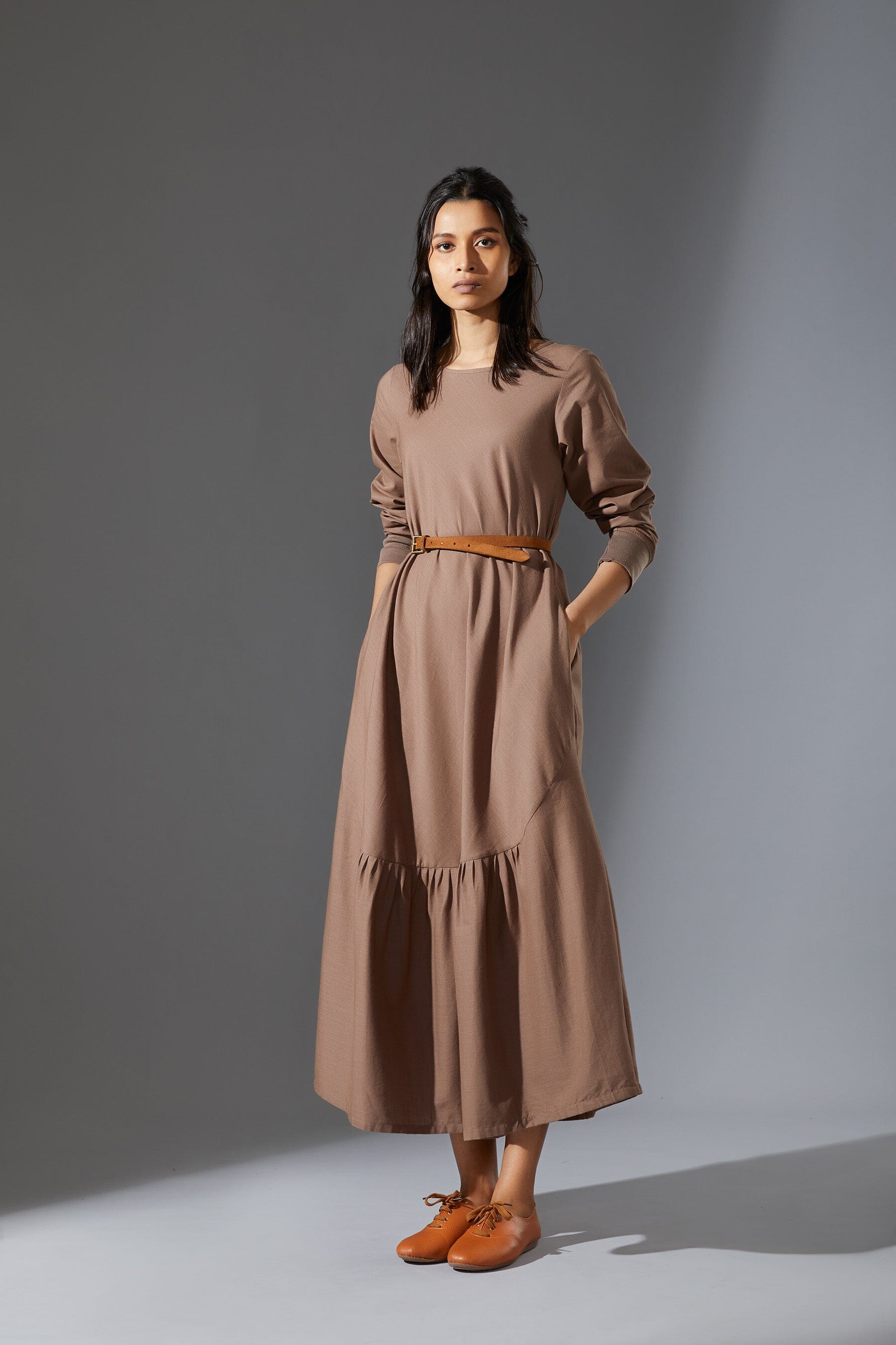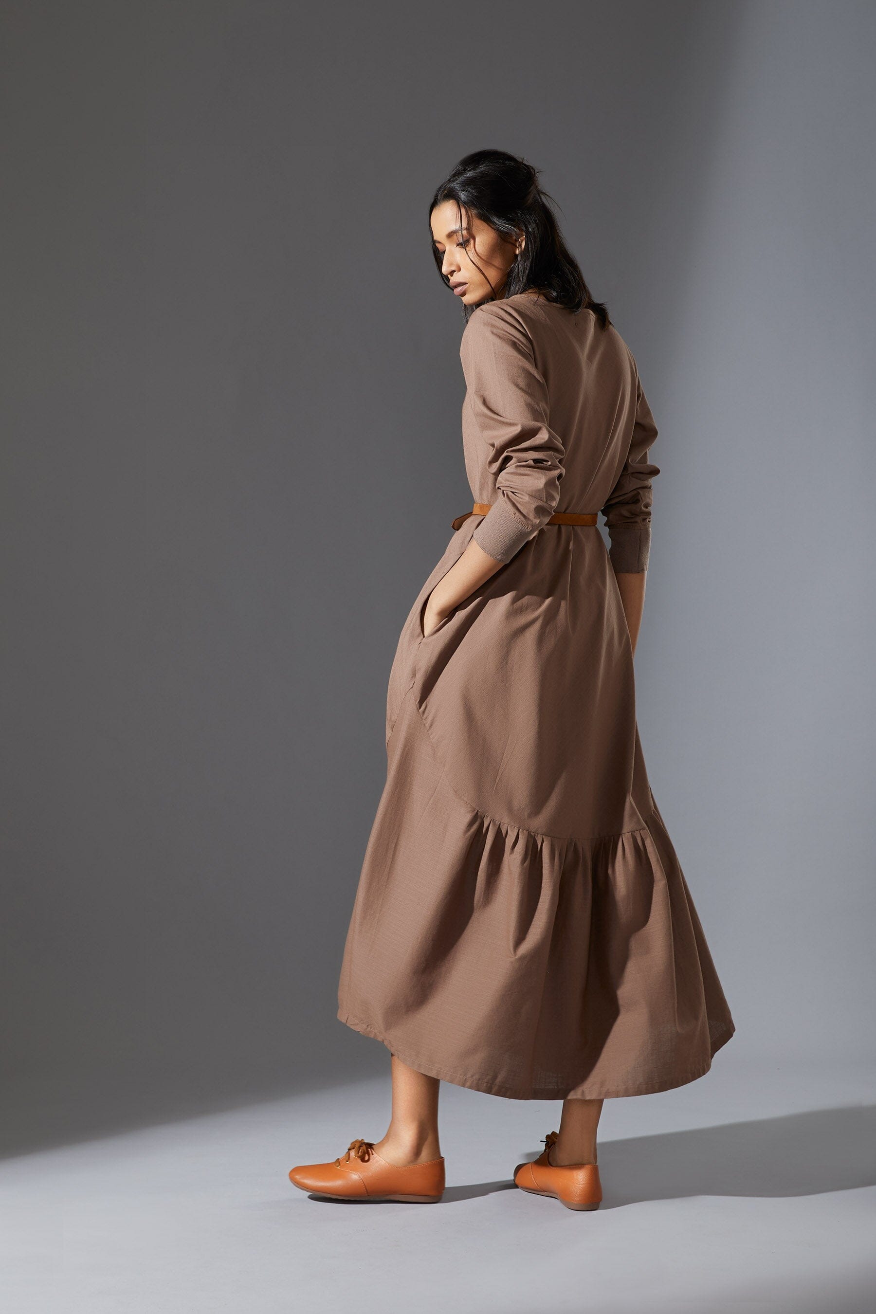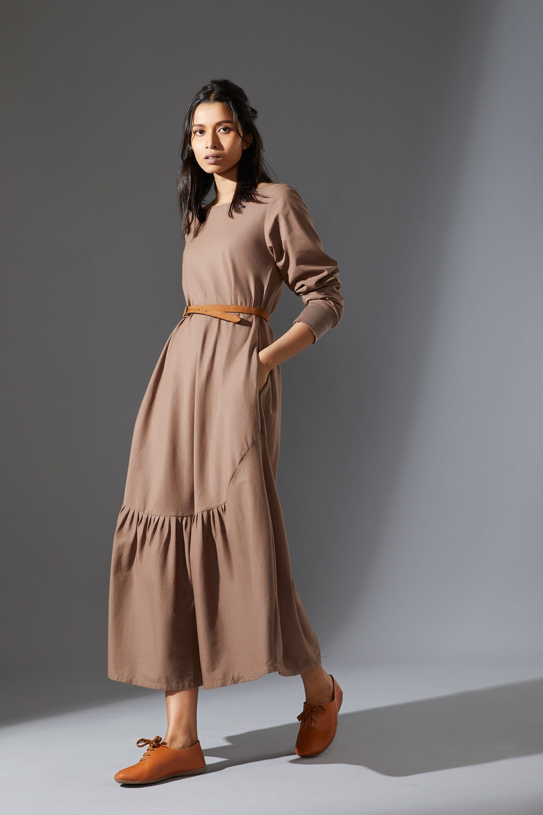 Un hermoso vestido recto confeccionado con algodón flameado tejido a mano. Con un corte al bies, este vestido se adapta perfectamente al cuerpo; además, puedes combinarlo con un cinturón, una bufanda o un bonito escote largo de color marrón tostado.