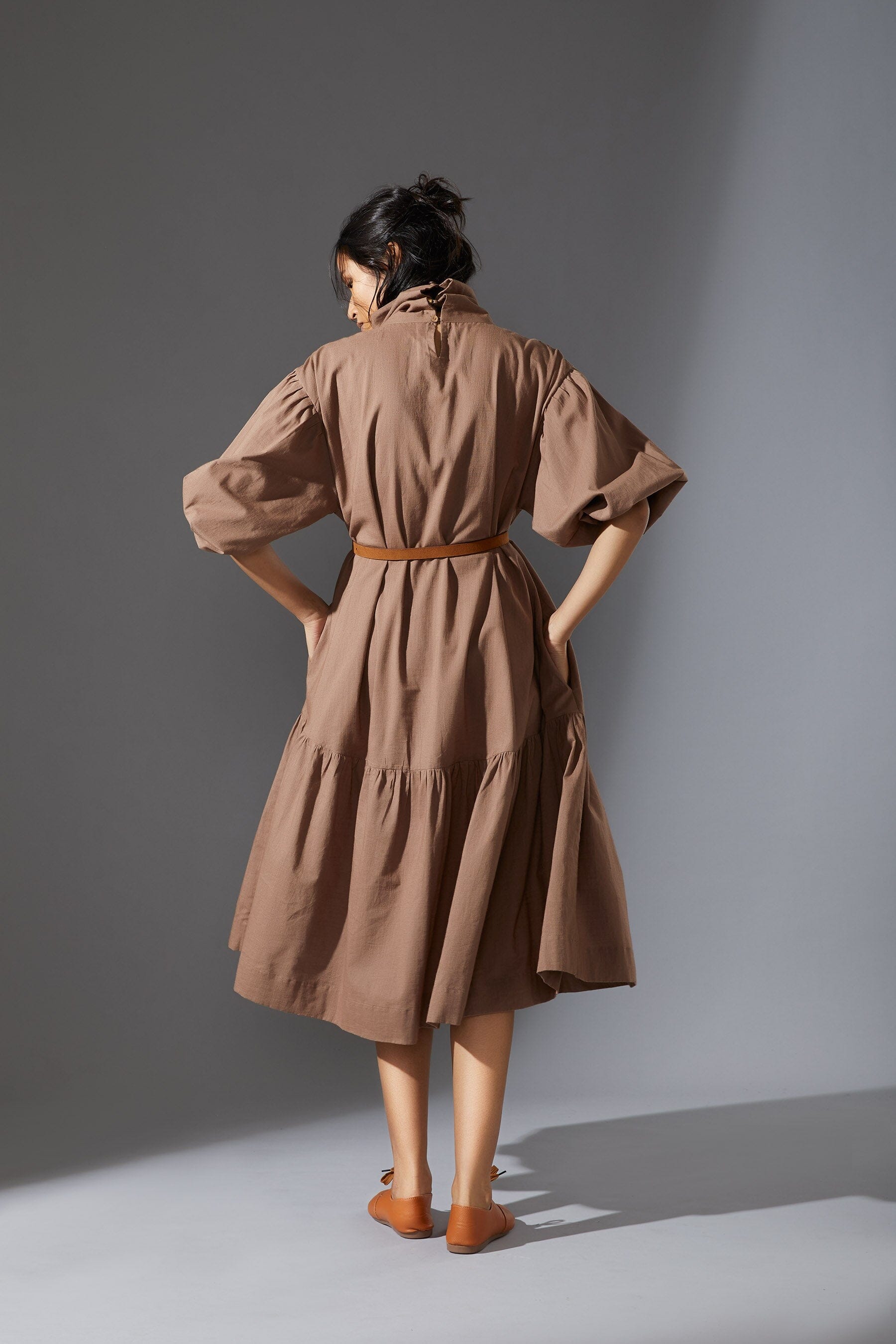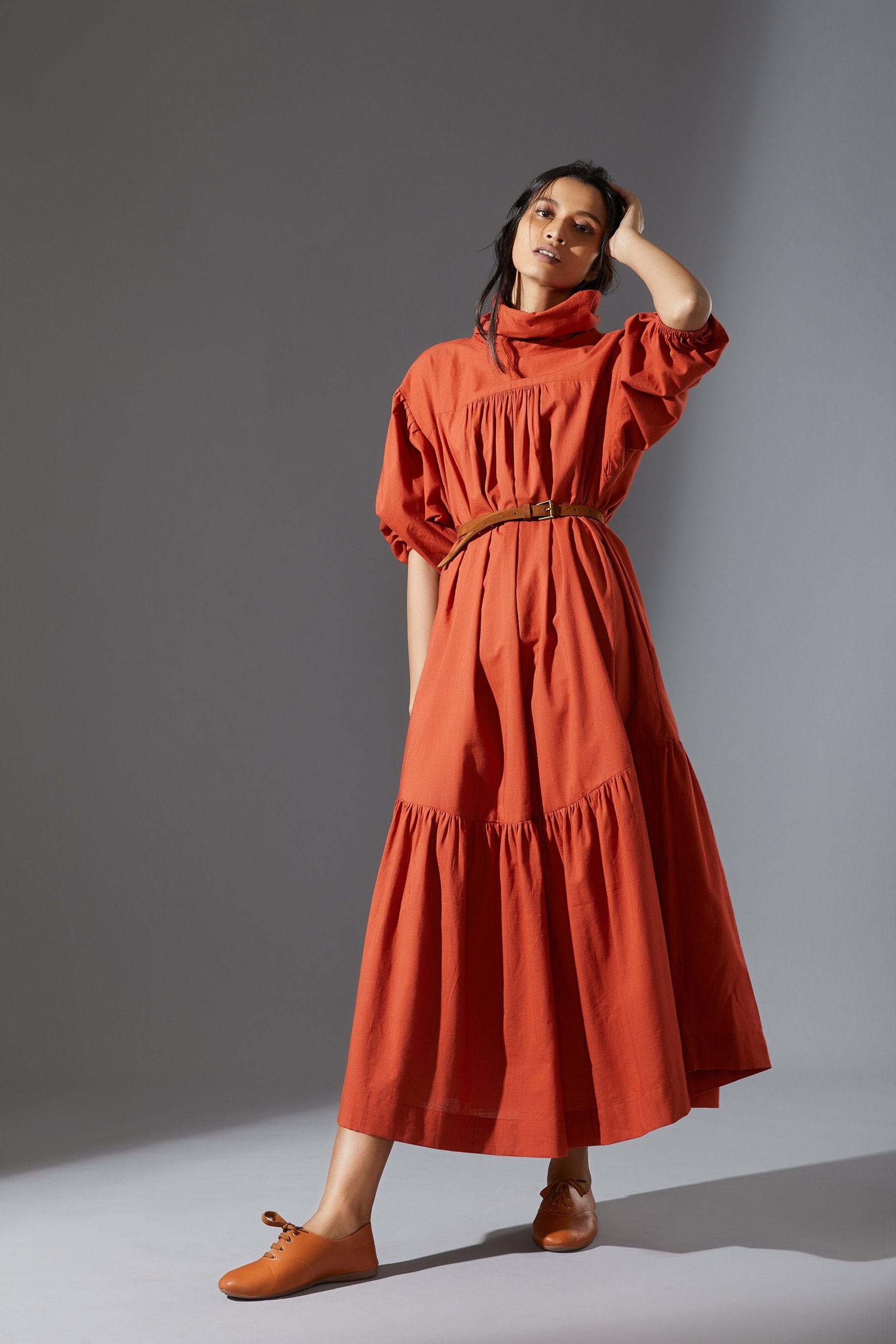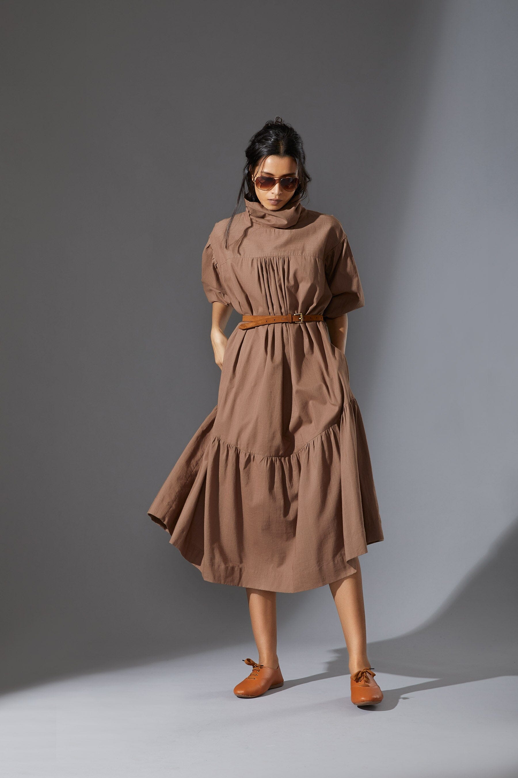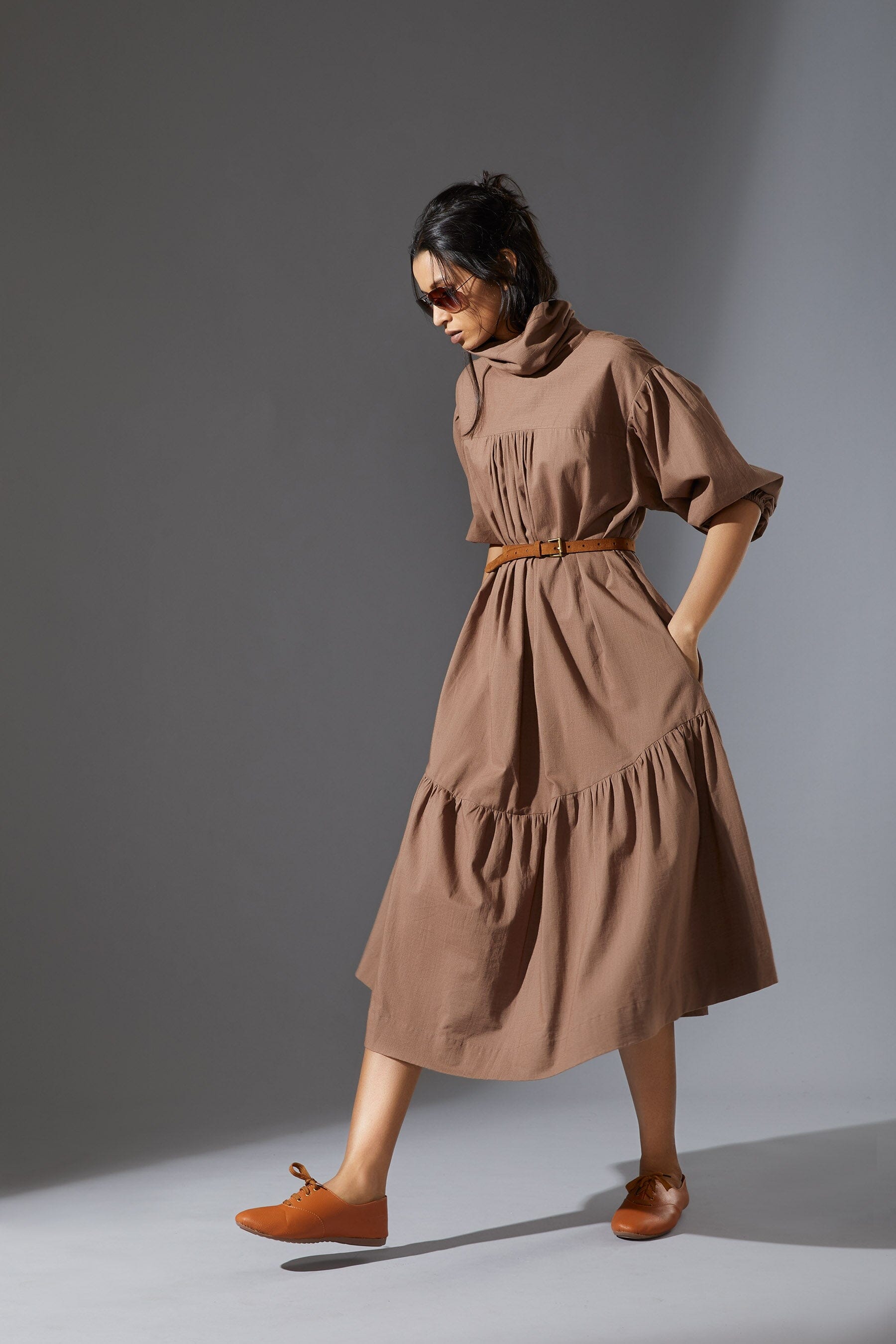 Este vestido divertido y elegante está confeccionado con una lujosa tela flameada de algodón tejida a mano. Tiene bonitas mangas tipo blusón, cuello alto y un cinturón ajustable para definir la forma holgada. Dale estilo al tuyo con sandalias con cordones y un bolso tote.