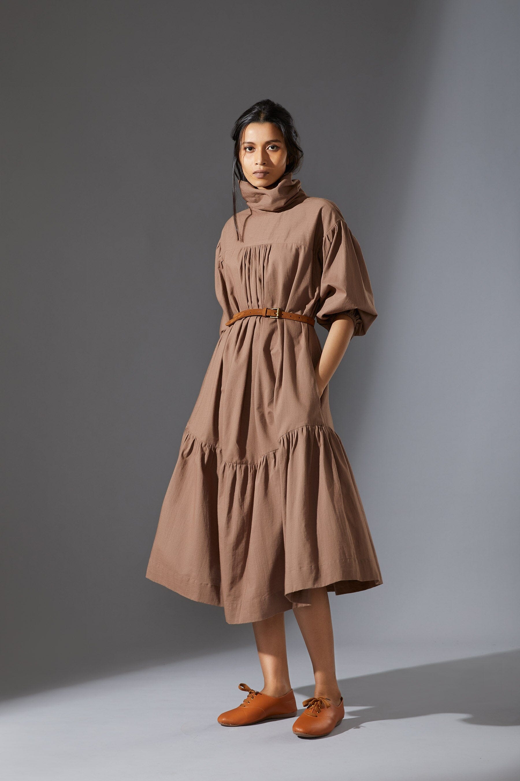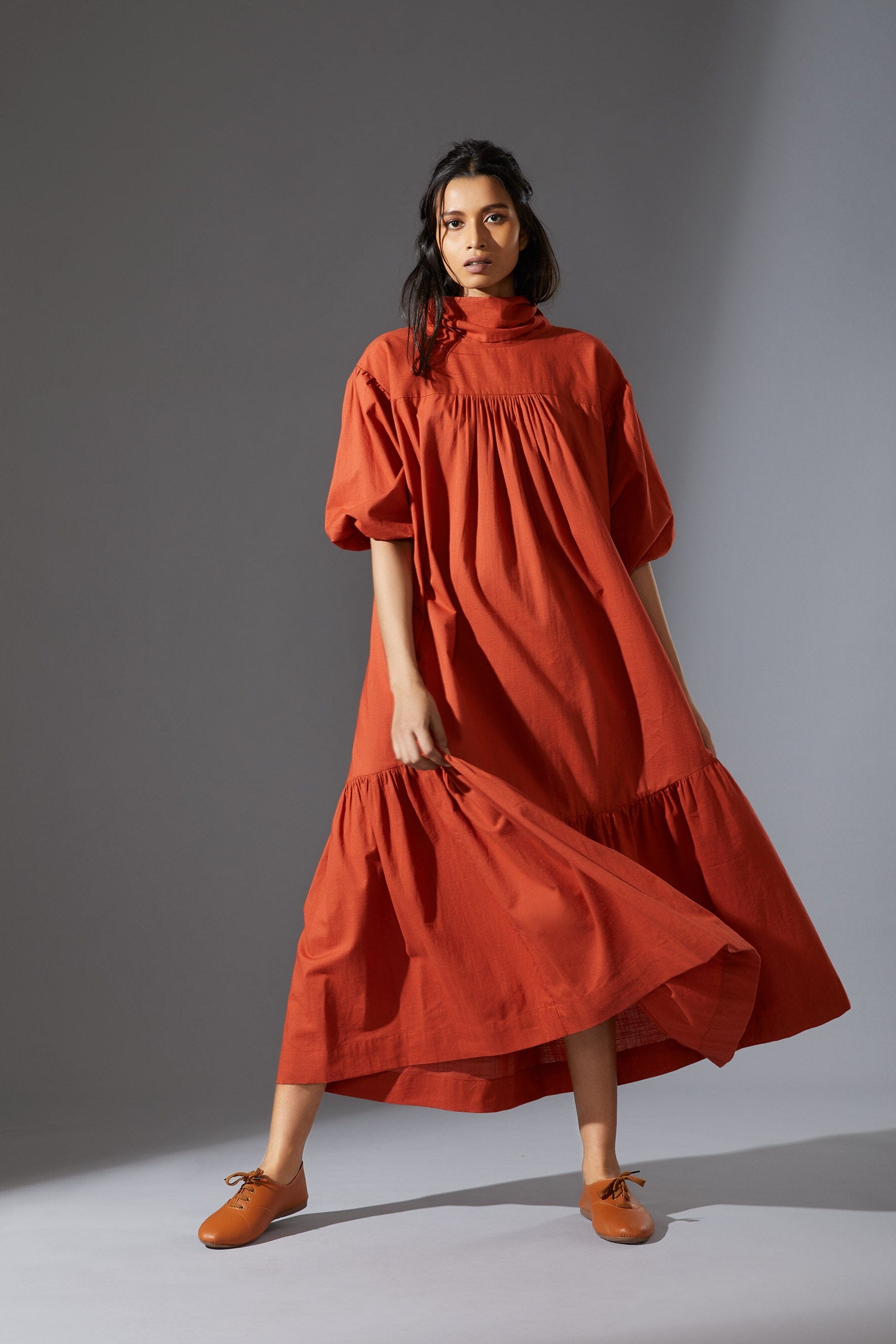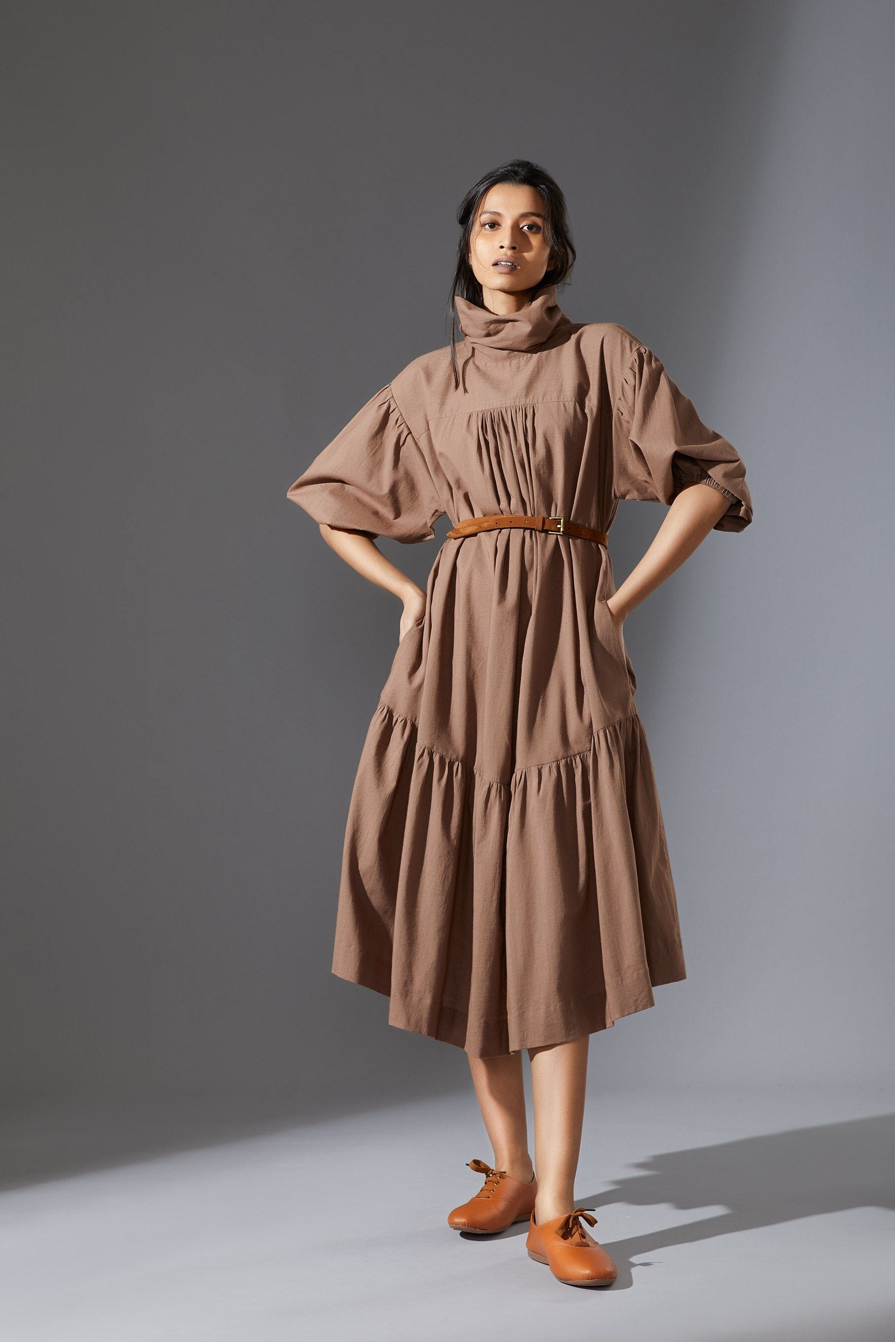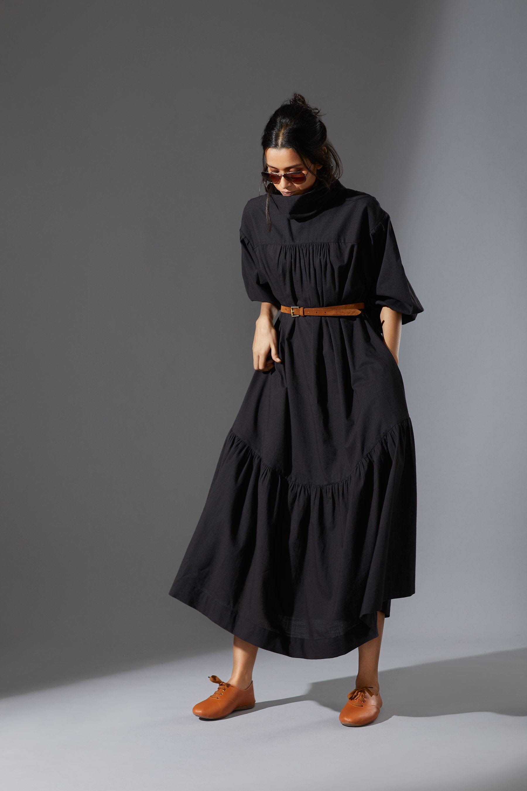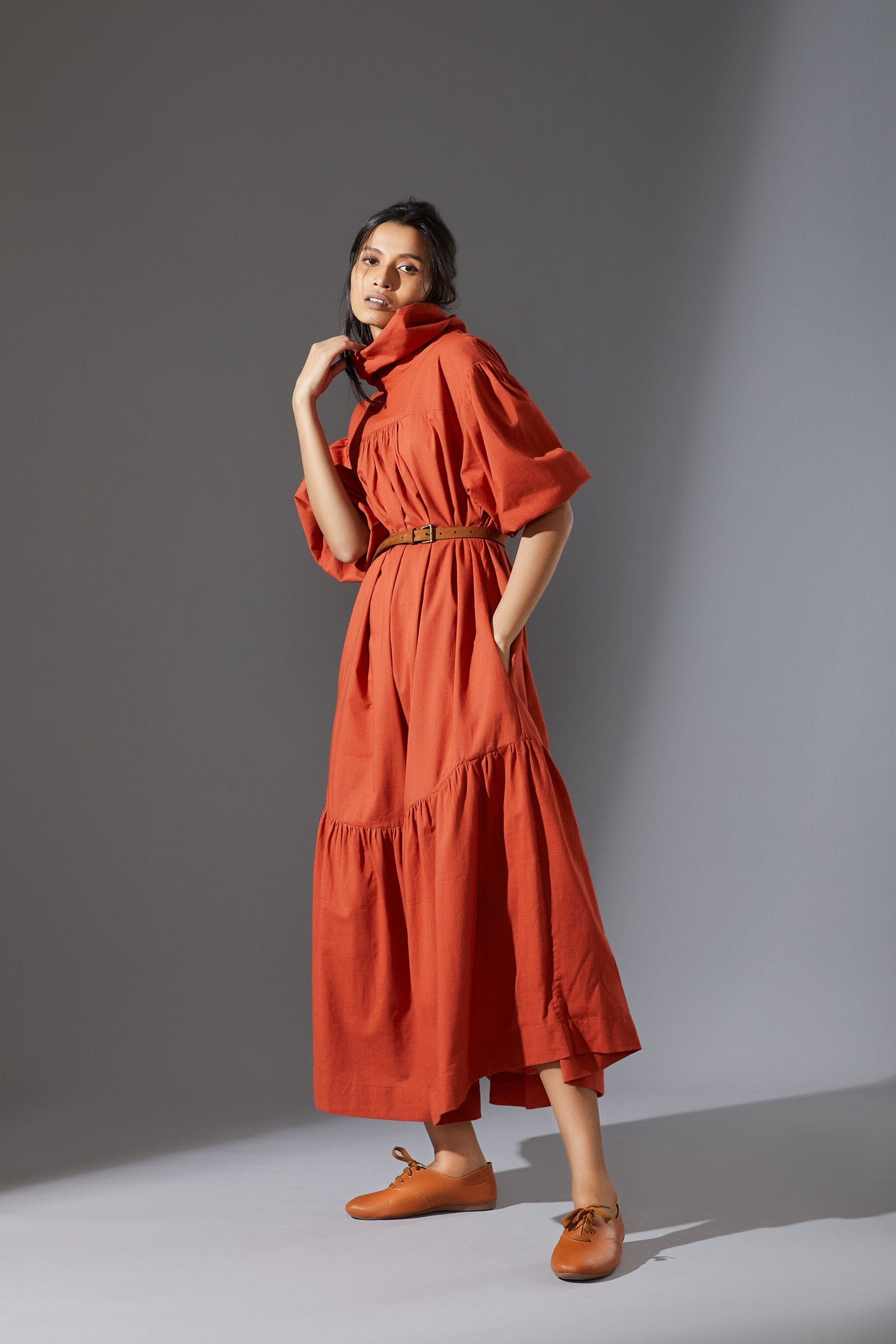 Este vestido divertido y elegante está confeccionado con una lujosa tela flameada de algodón tejida a mano. Tiene bonitas mangas tipo blusón, cuello alto y un cinturón ajustable para definir la forma holgada. Dale estilo al tuyo con sandalias con cordones y un bolso tote.
