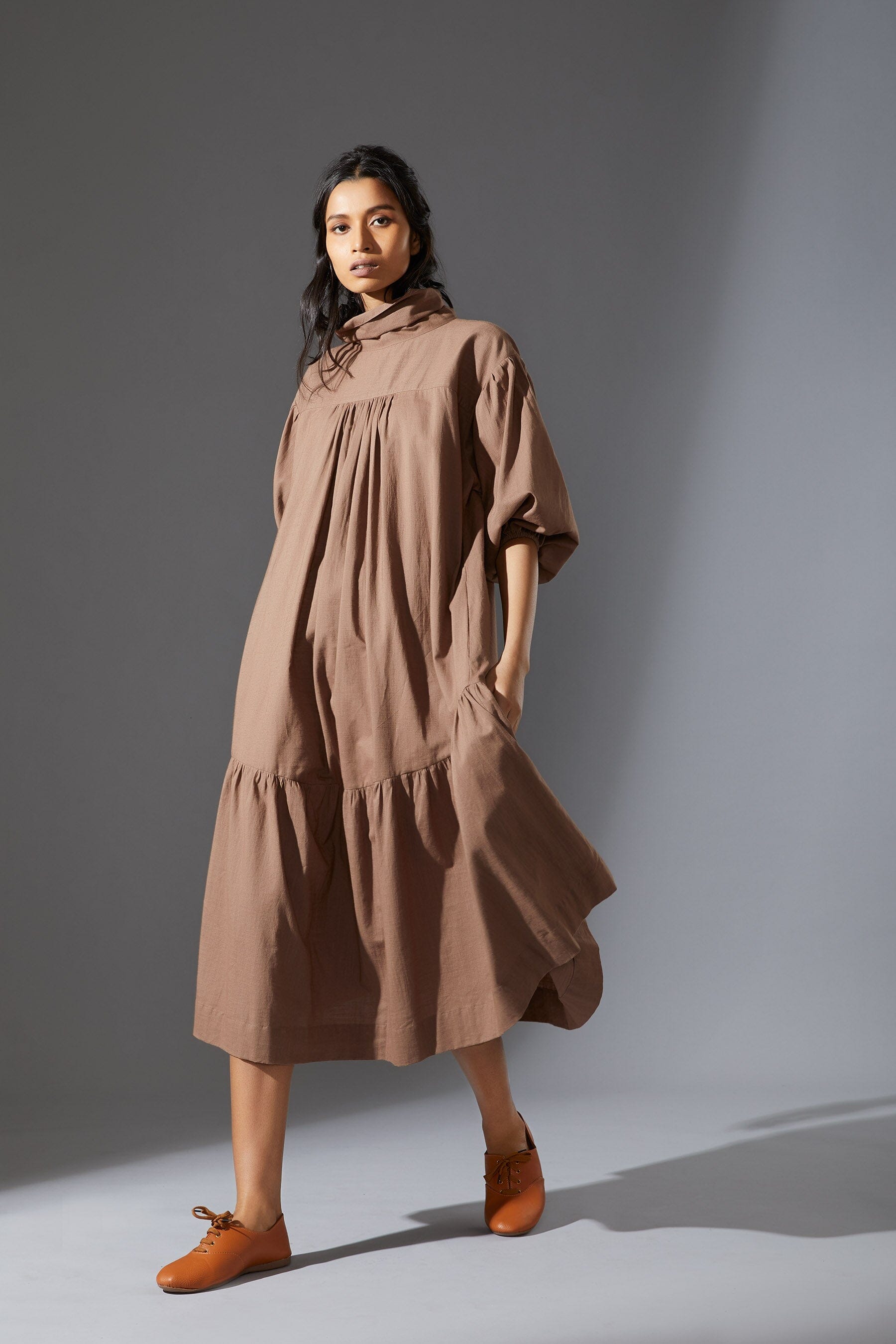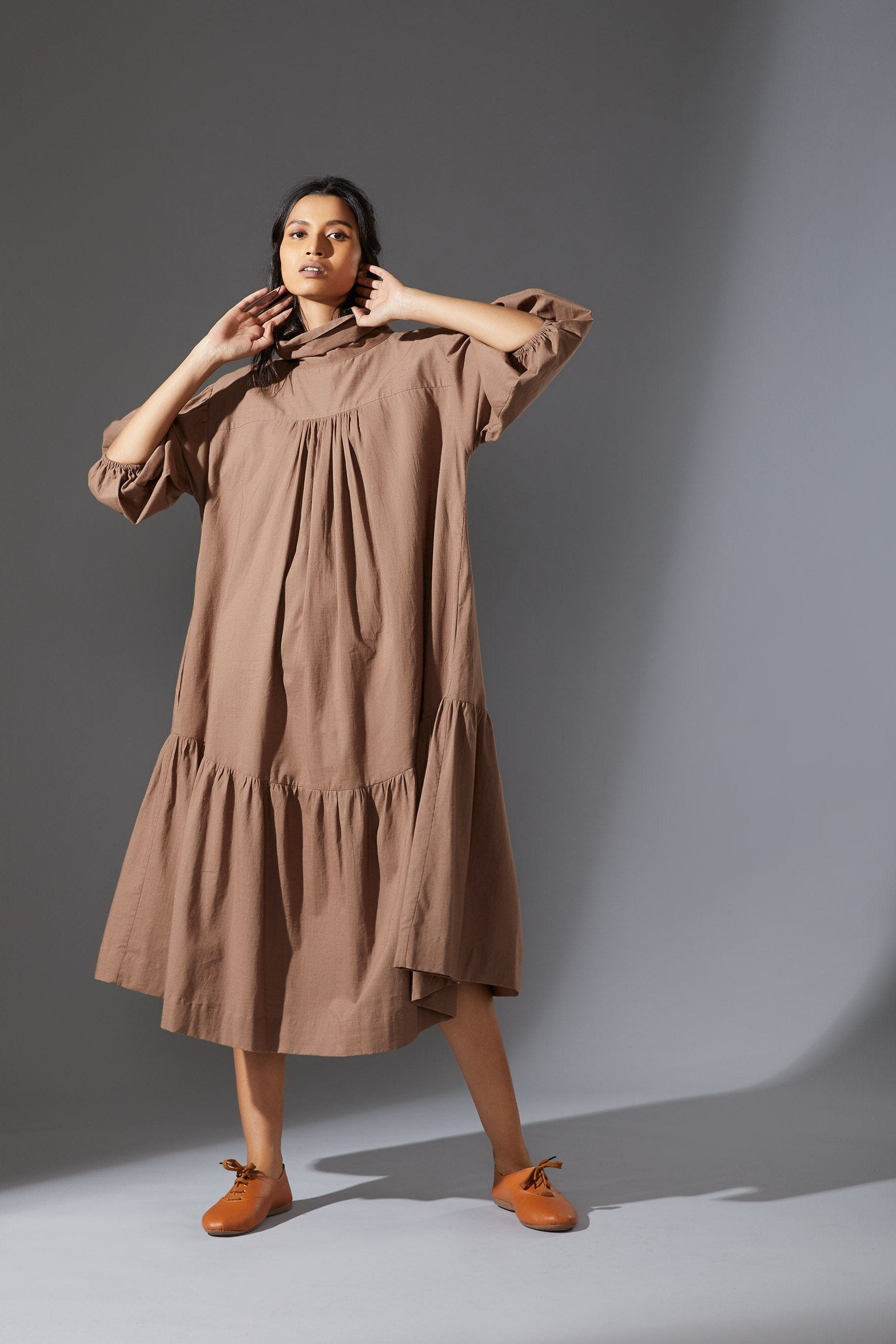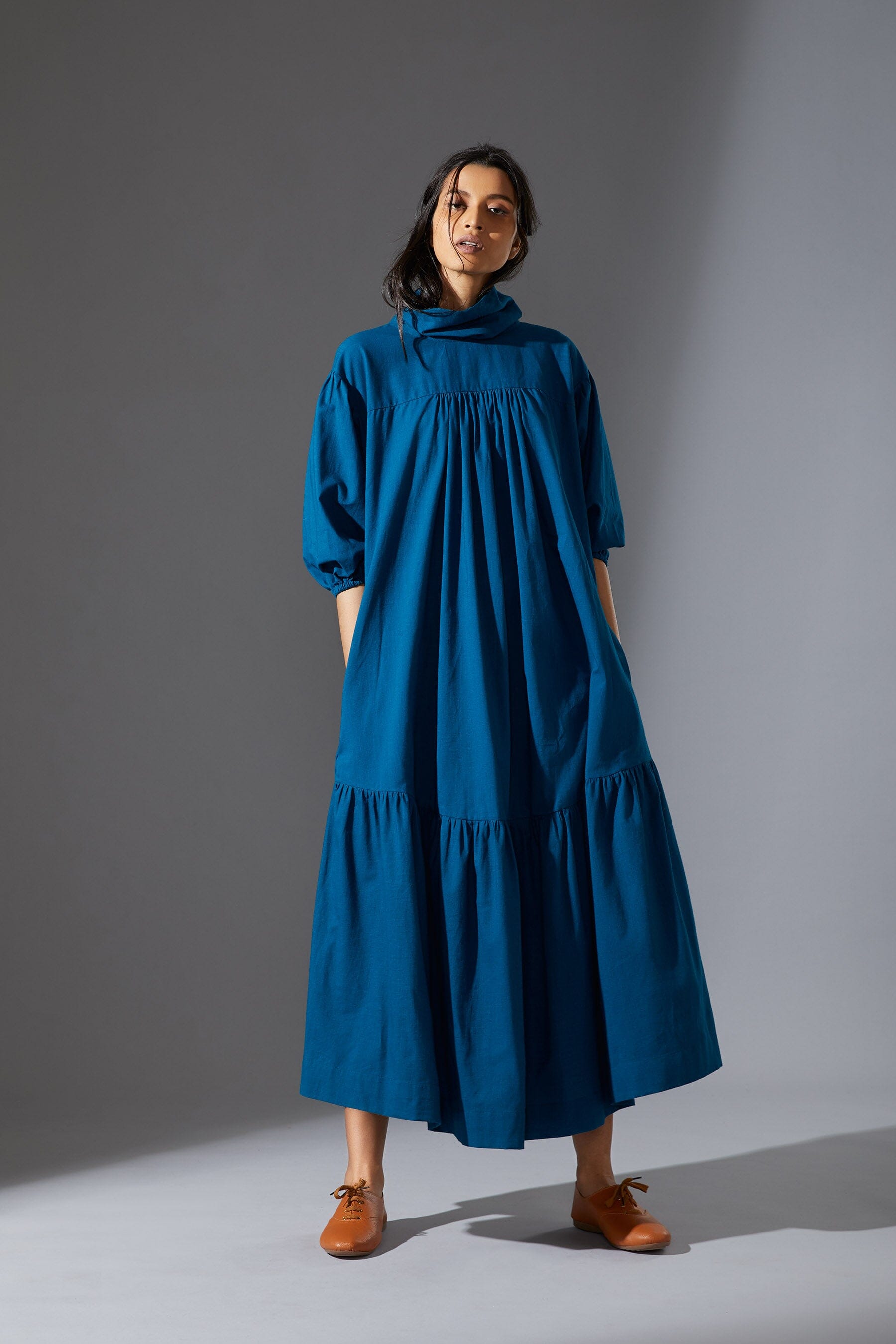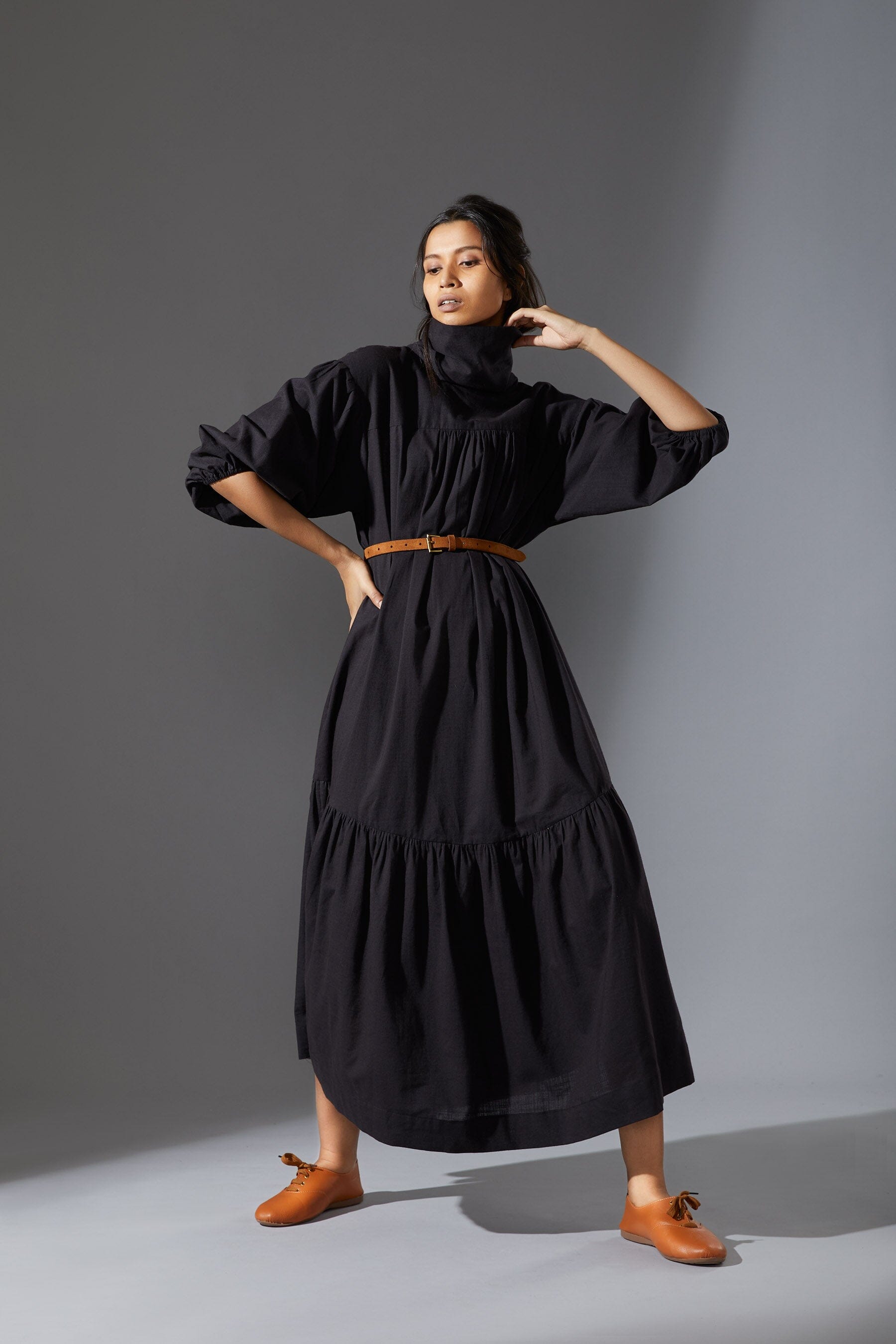 Este vestido divertido y elegante está confeccionado con una lujosa tela flameada de algodón tejida a mano. Tiene bonitas mangas tipo blusón, cuello alto y un cinturón ajustable para definir la forma holgada. Dale estilo al tuyo con sandalias con cordones y un bolso tote.