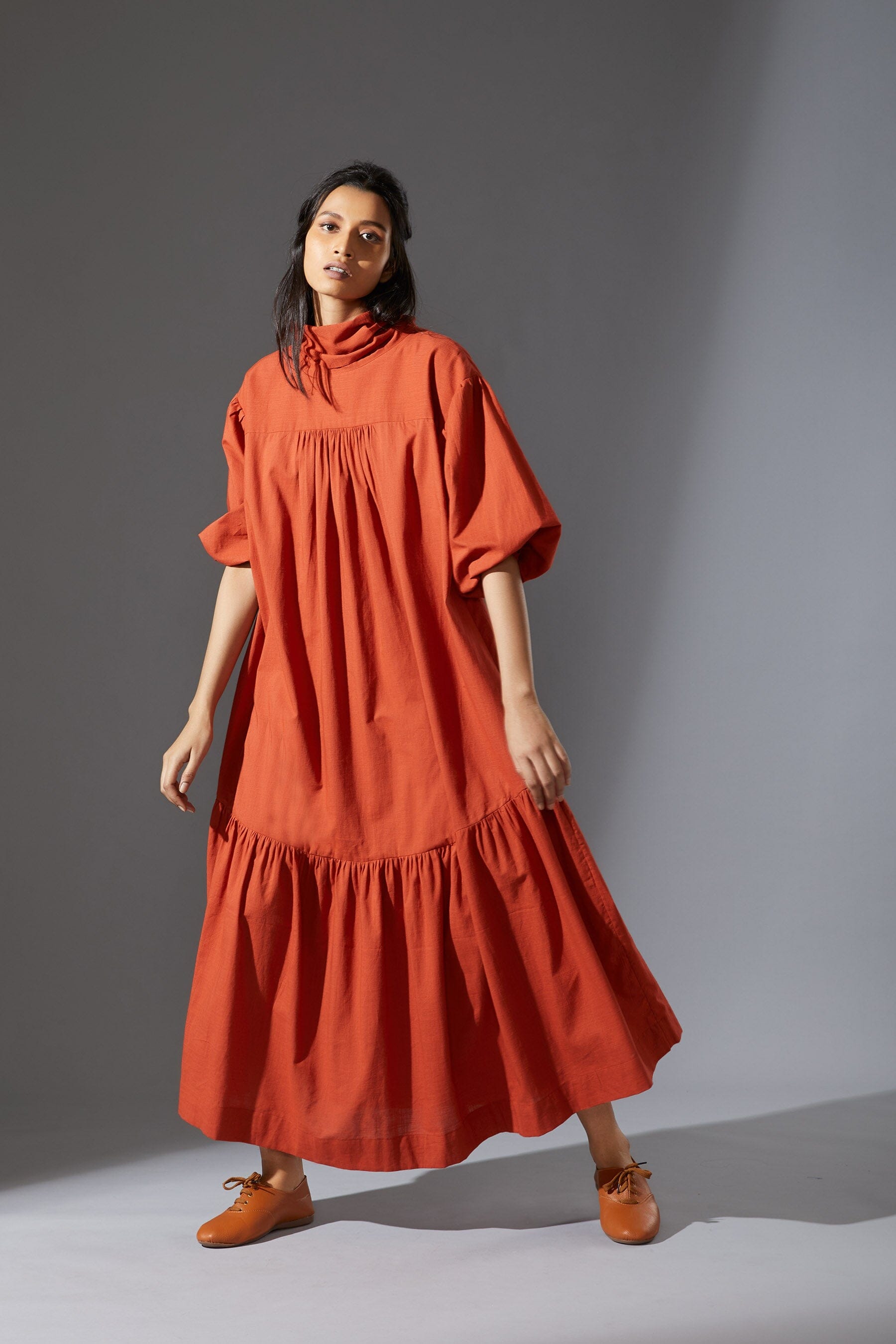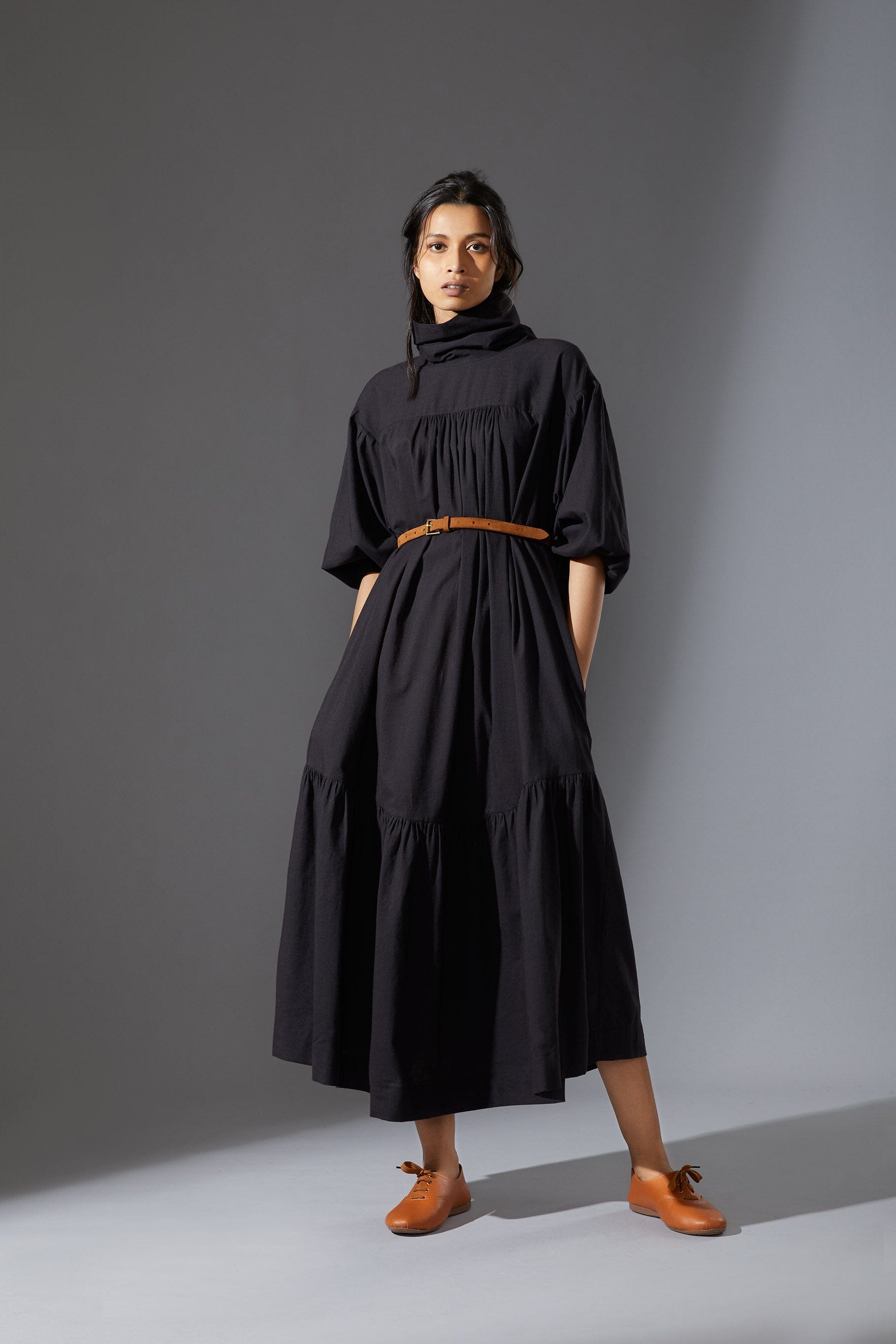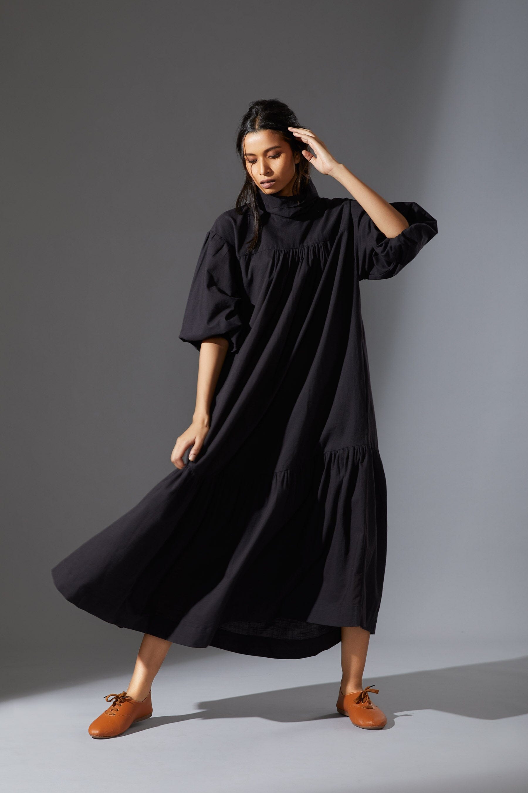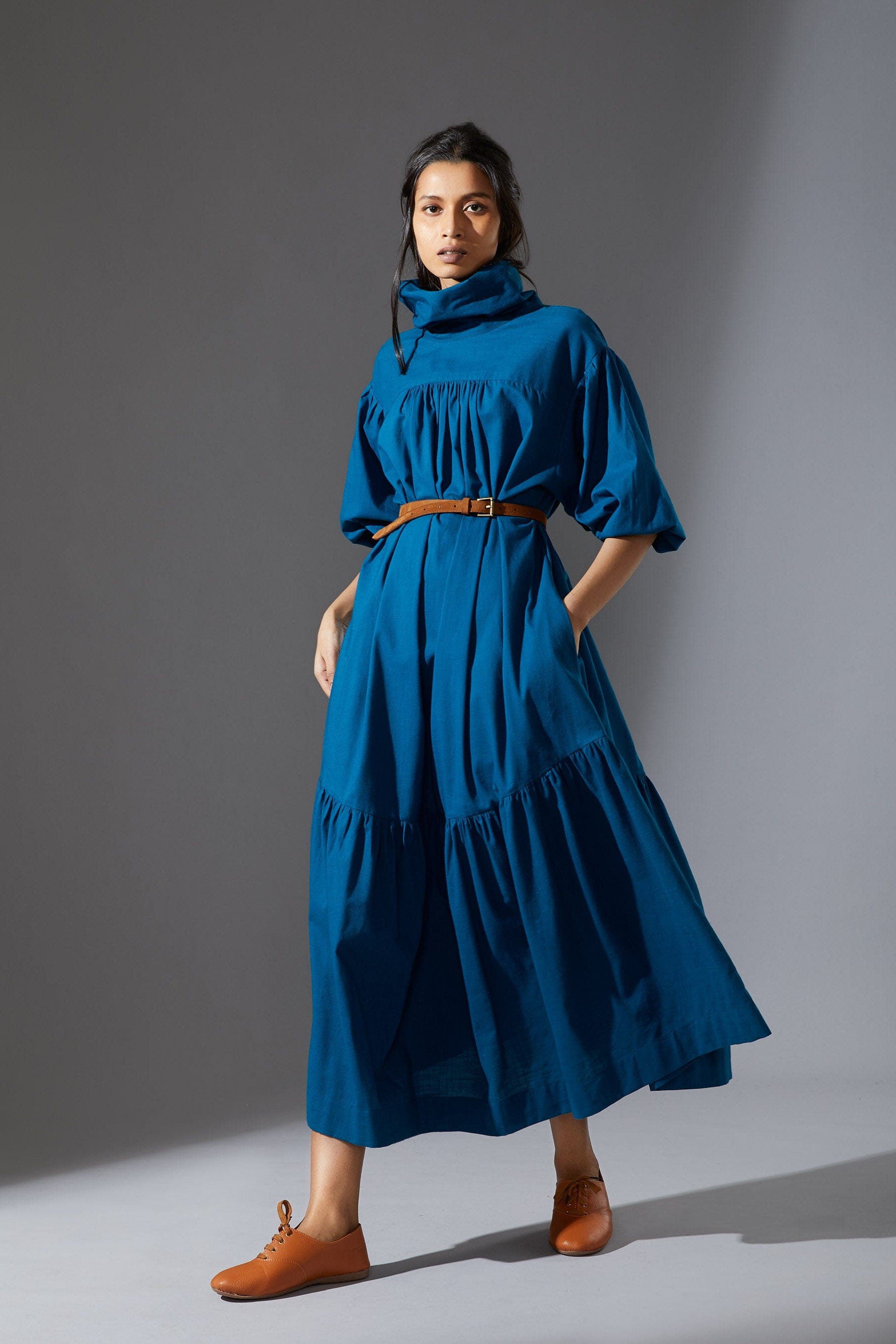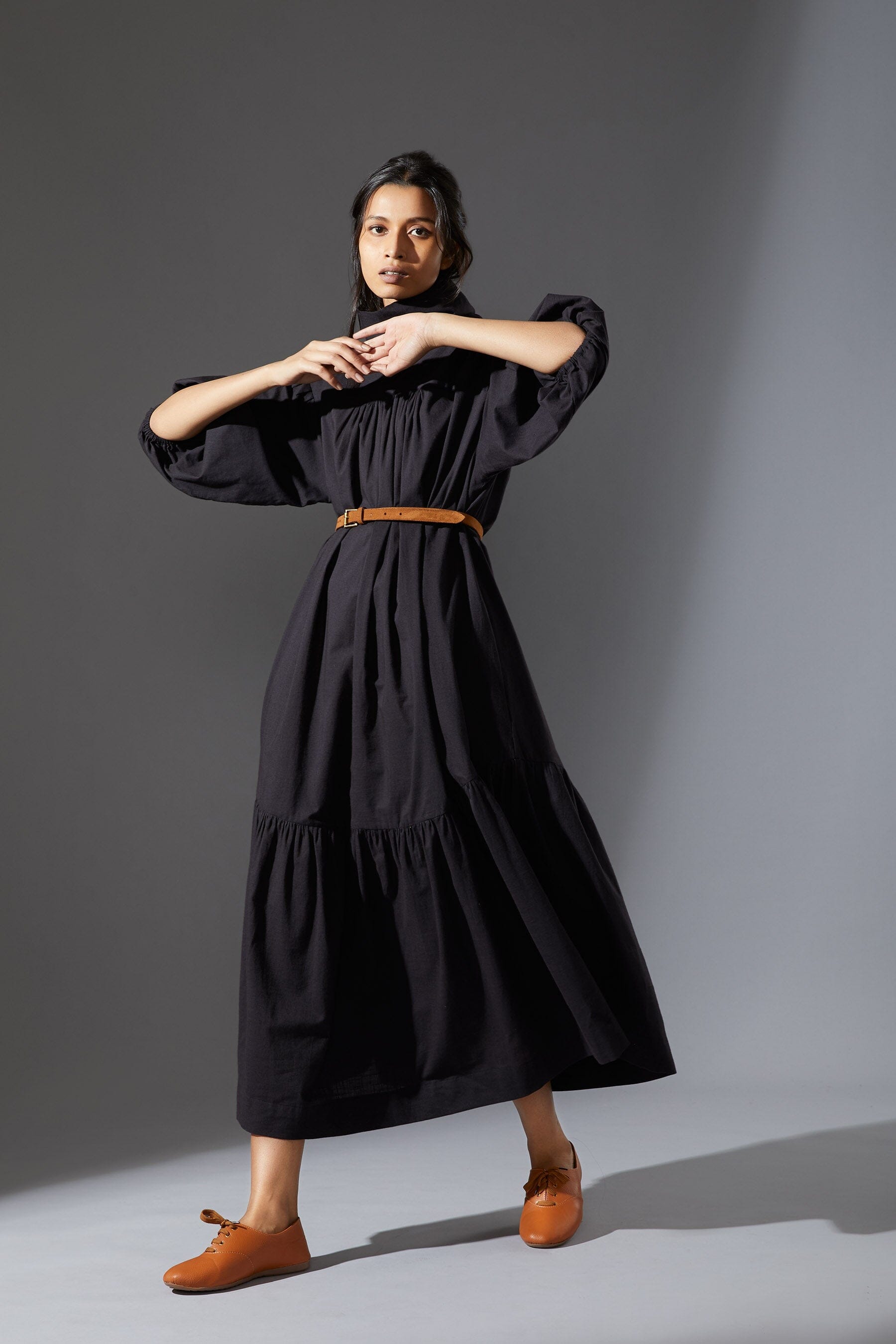 Este vestido divertido y elegante está confeccionado con una lujosa tela flameada de algodón tejida a mano. Tiene bonitas mangas tipo blusón, cuello alto y un cinturón ajustable para definir la forma holgada. Dale estilo al tuyo con sandalias con cordones y un bolso tote.
