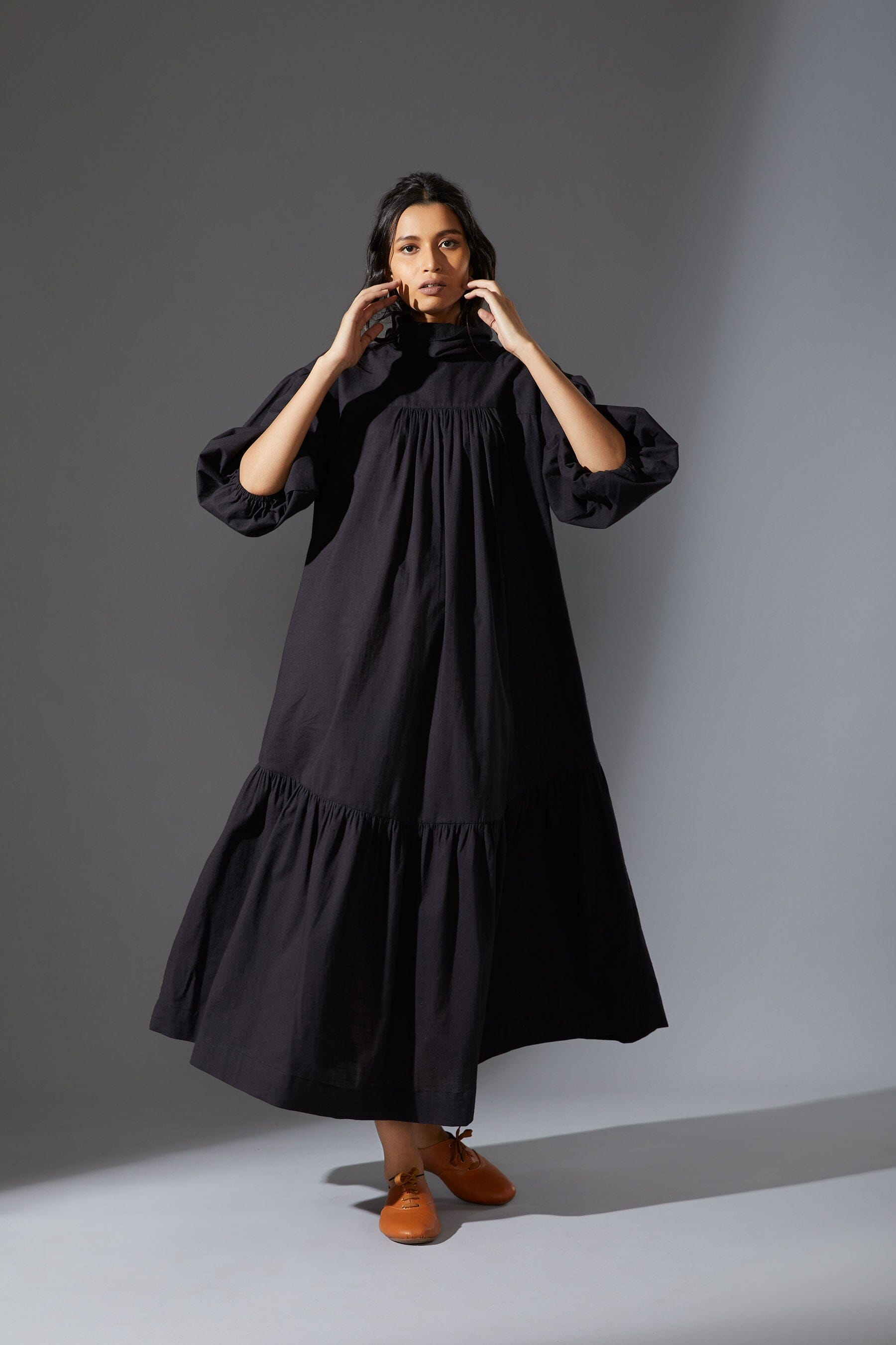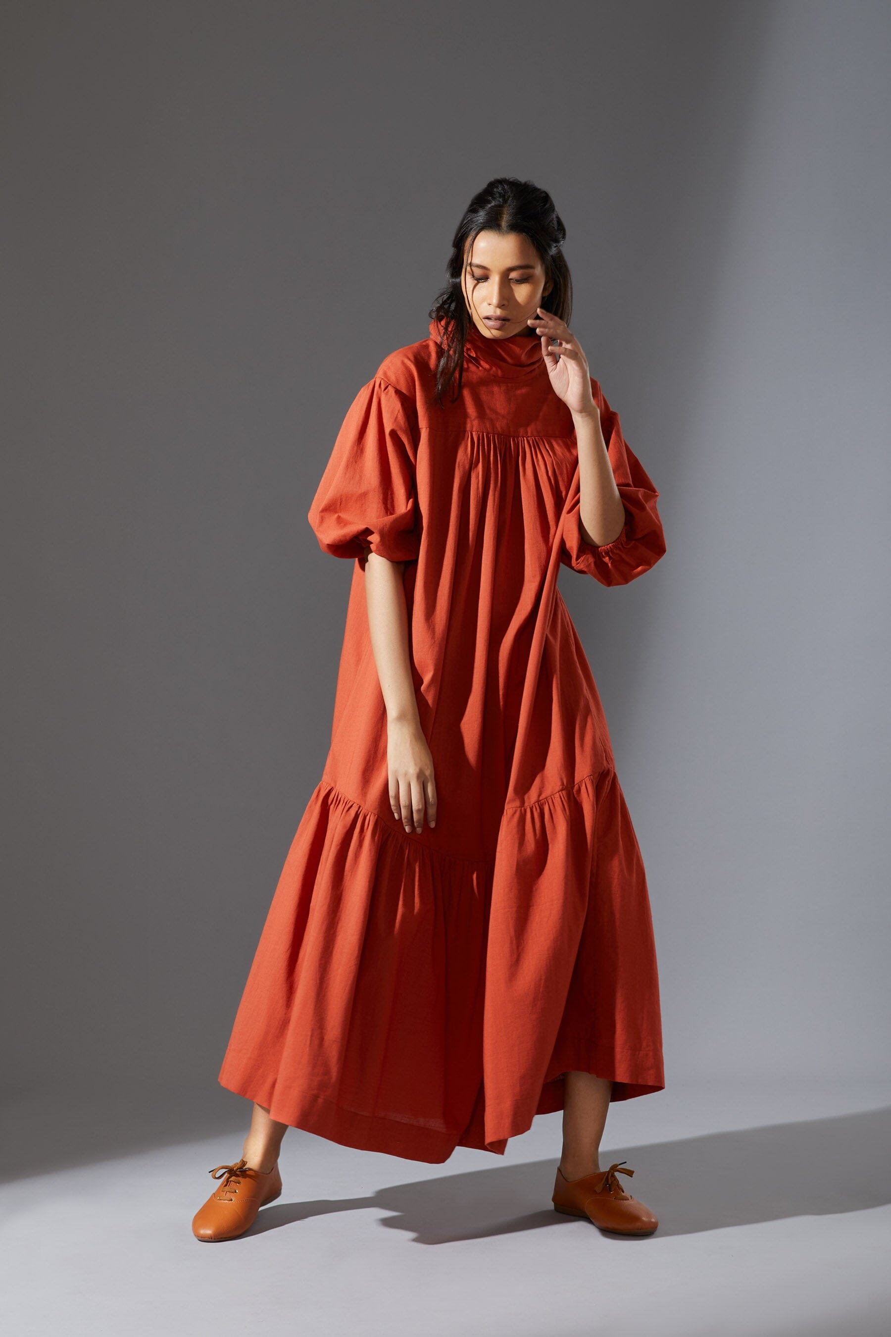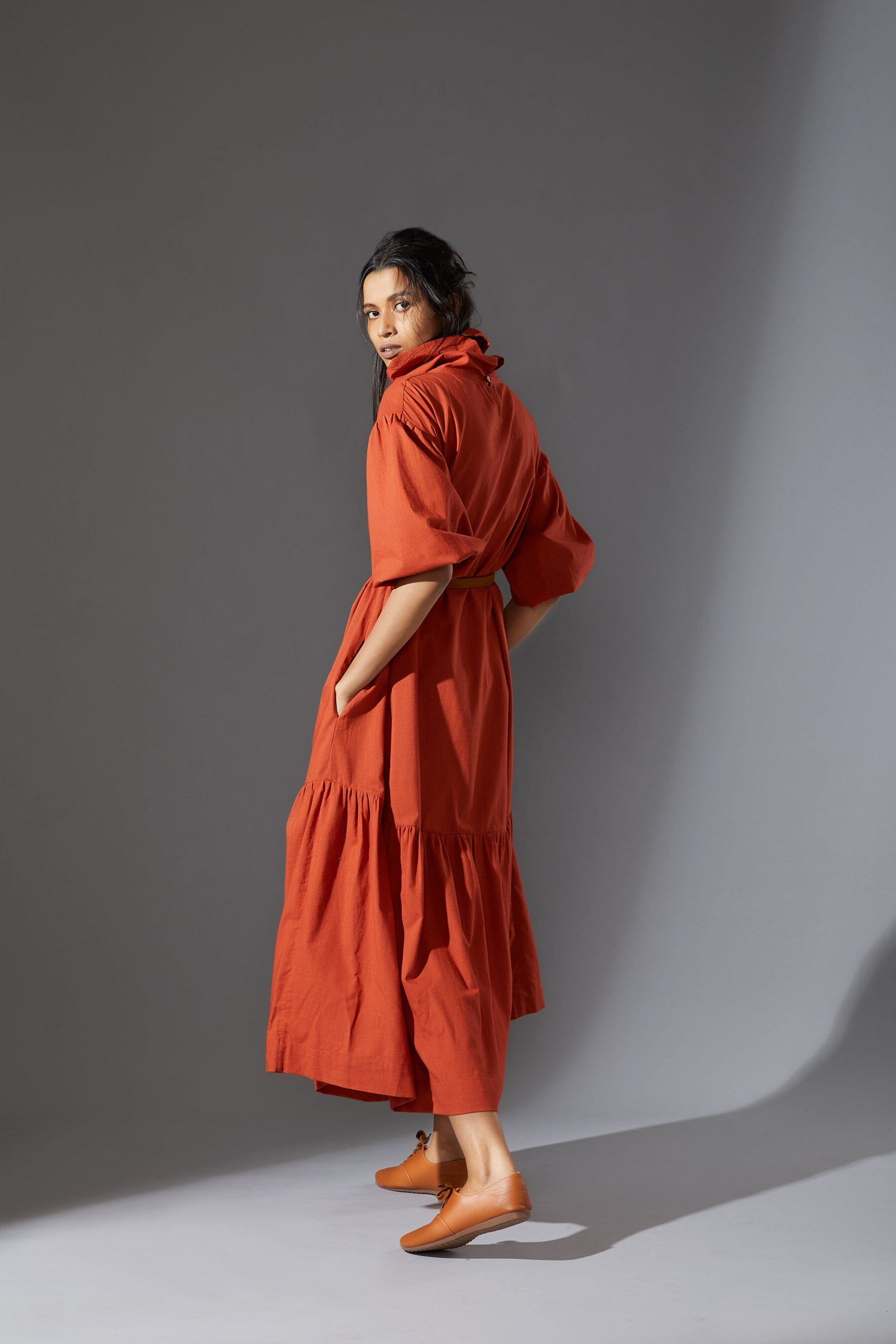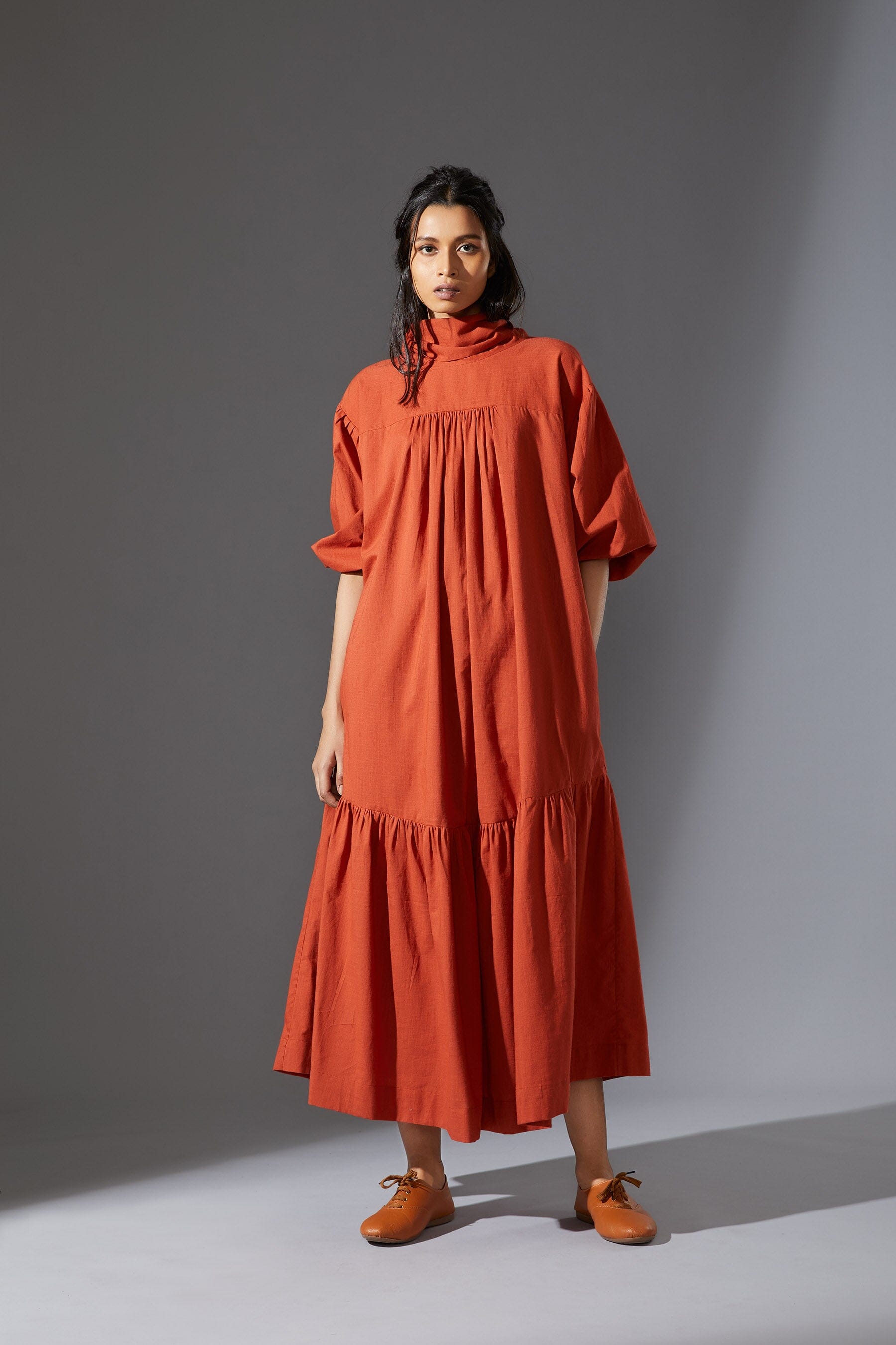 Este vestido divertido y elegante está confeccionado con una lujosa tela flameada de algodón tejida a mano. Tiene bonitas mangas tipo blusón, cuello alto y un cinturón ajustable para definir la forma holgada. Dale estilo al tuyo con sandalias con cordones y un bolso tote.
