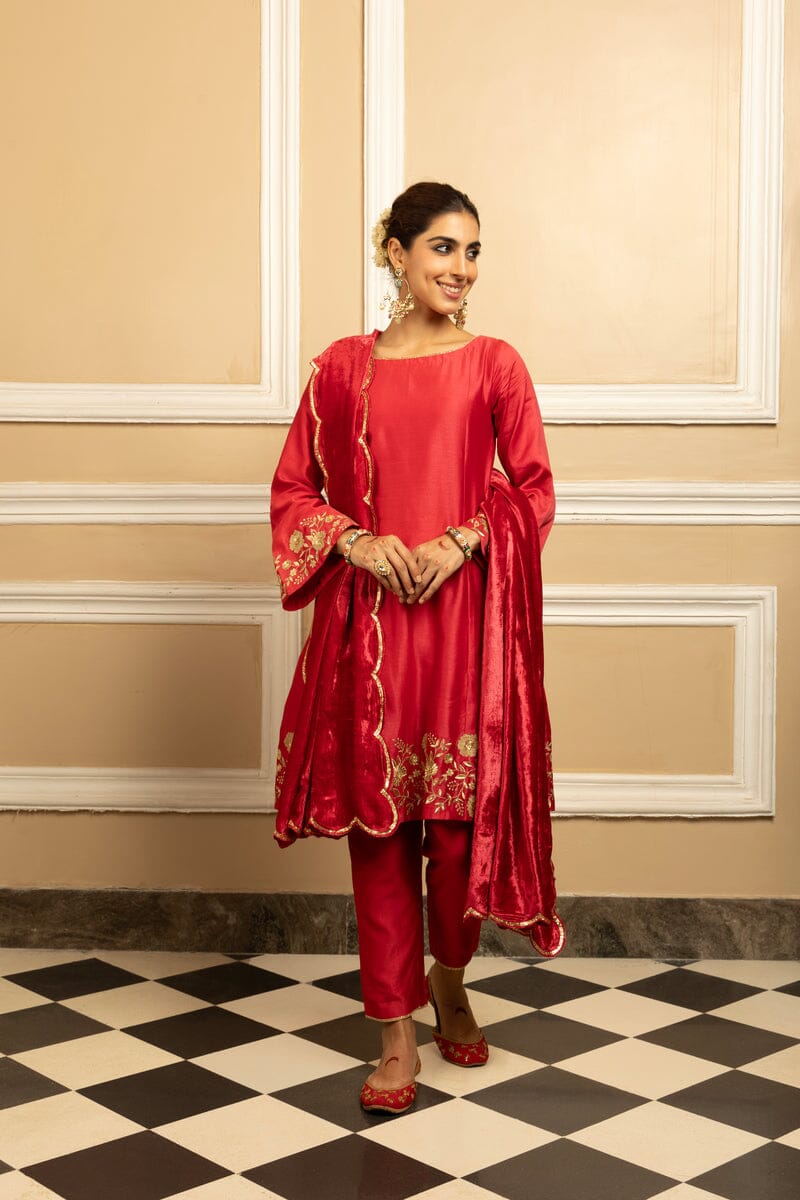 Introducing the Ekaya Red Kurta Set, a captivating blend of tradition and modern style. This short A-line silk chanderi kurta is paired with sleek straight pants and a velvet shawl, featuring intricate zari embroidery & sequin embellishments.