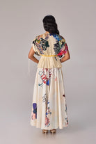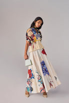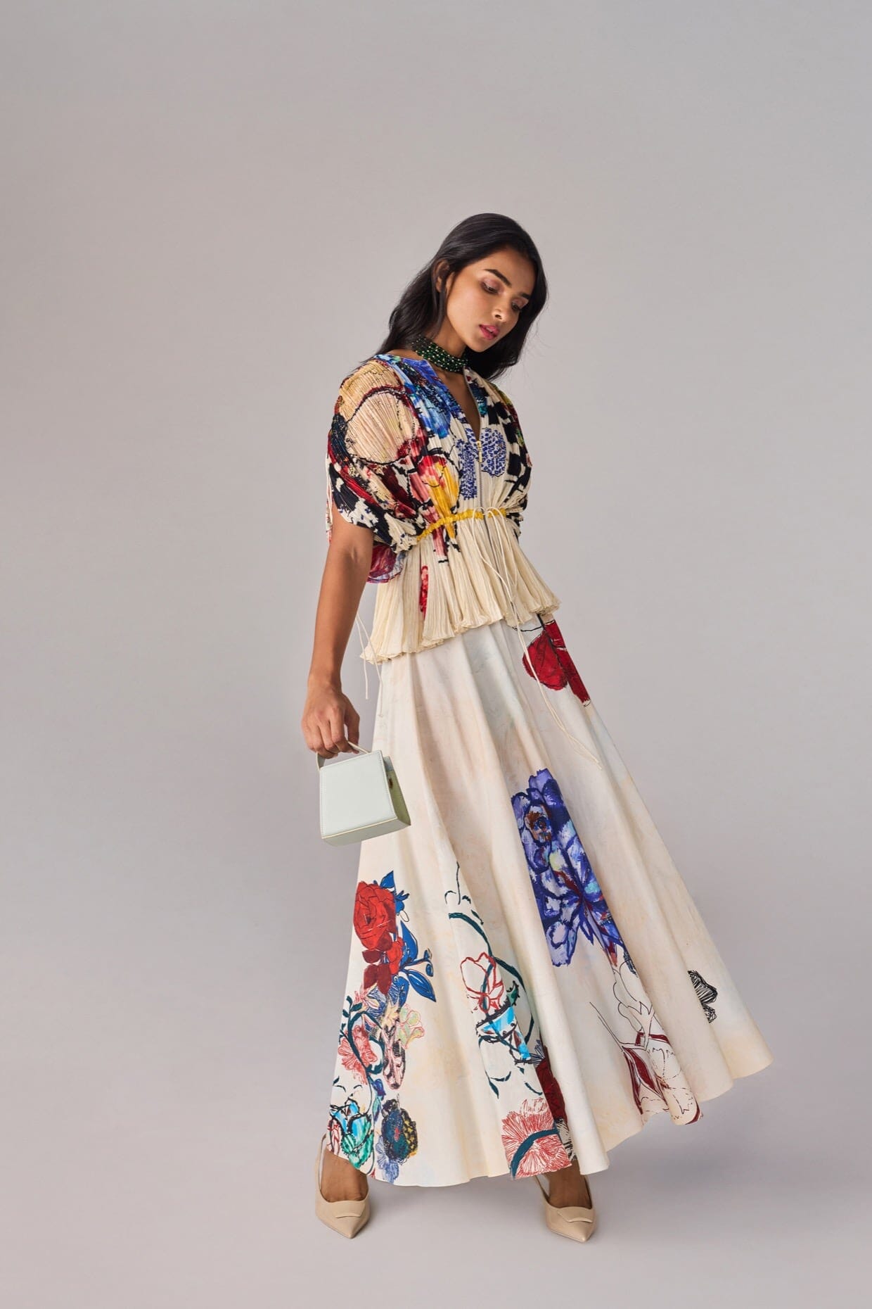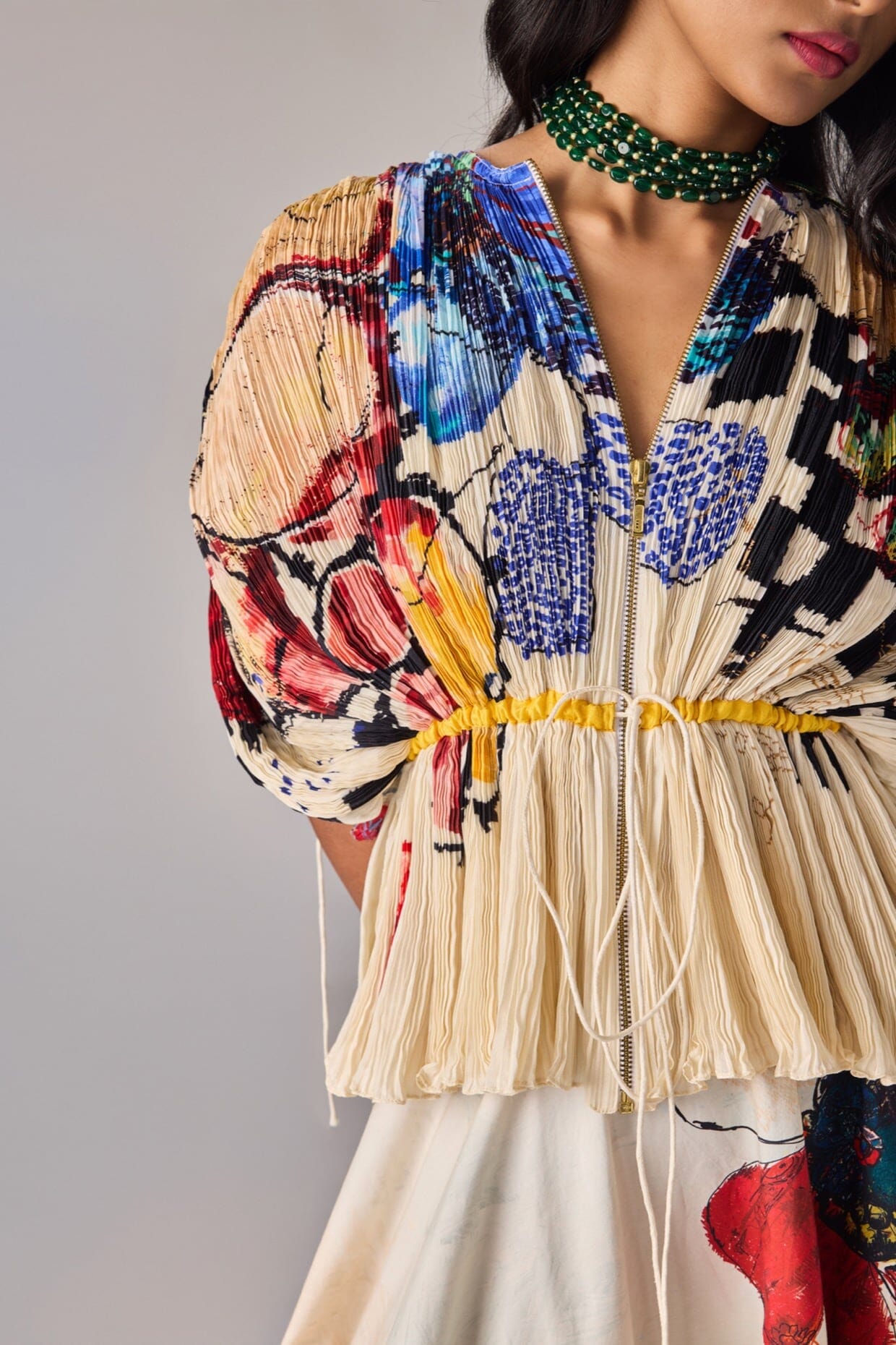 Floral And Abstract Print, Hand Micro Pleat Kaftan Style Blouse With Adjustable Drawstring Waist And Sleeves, And Front Zip Closure