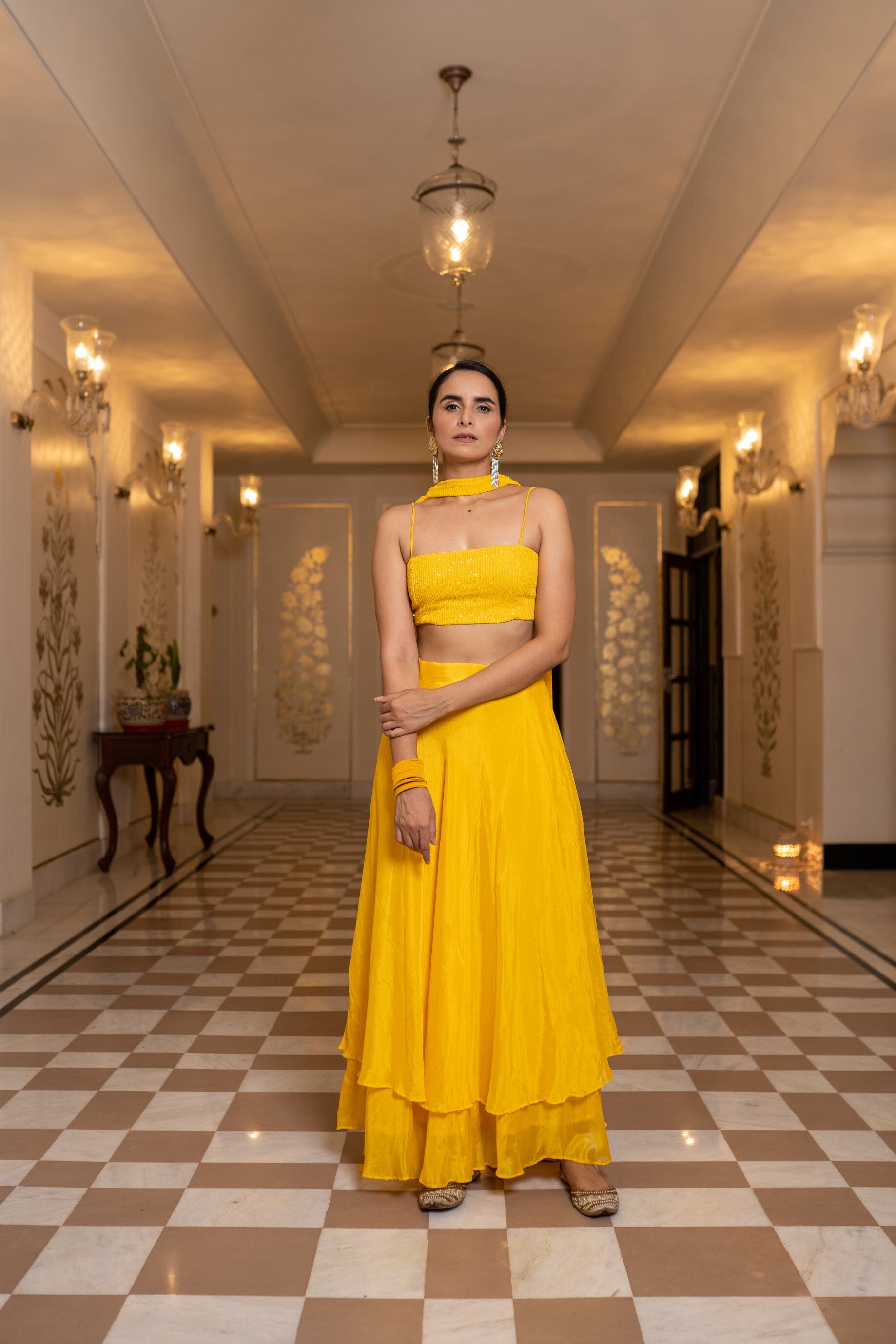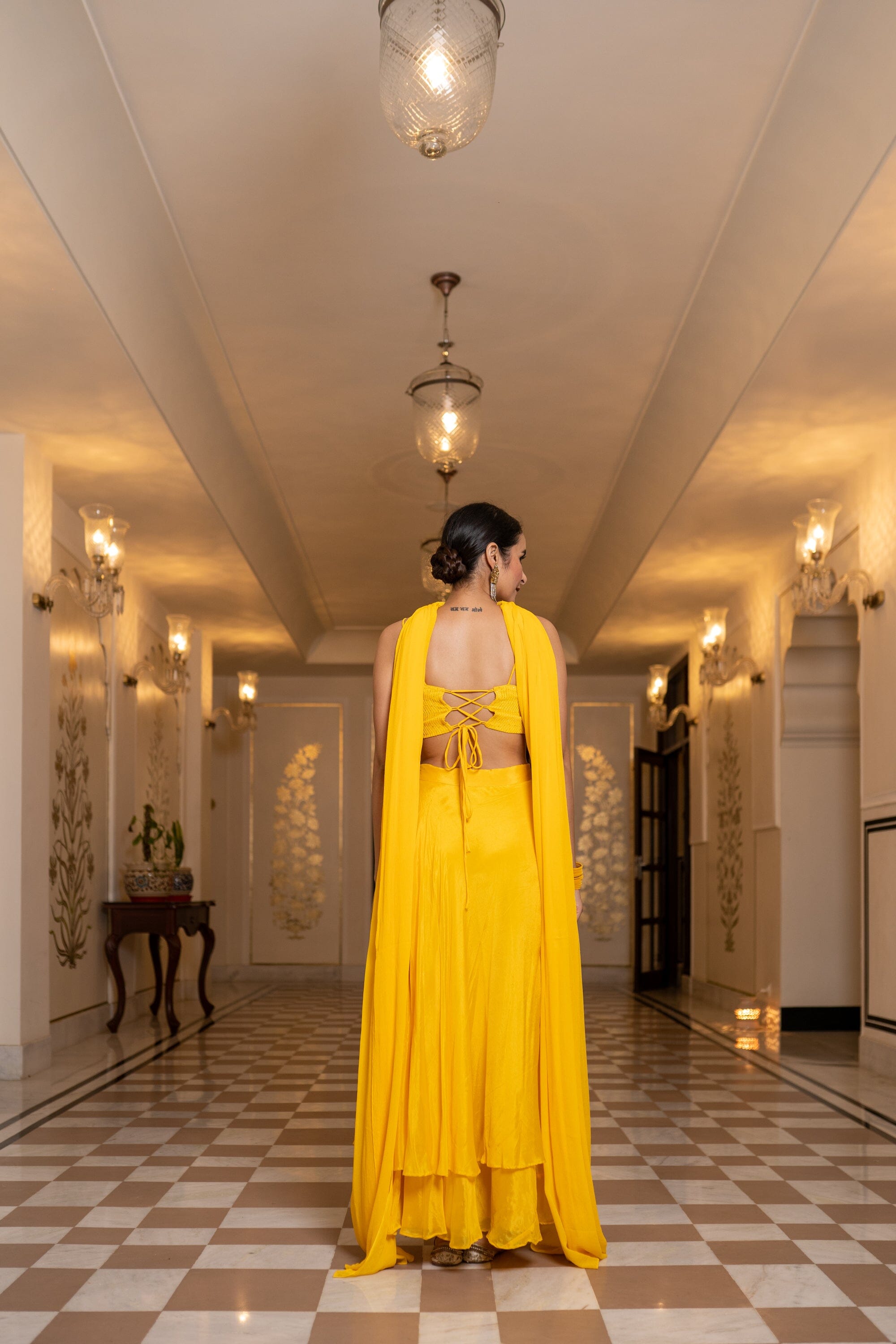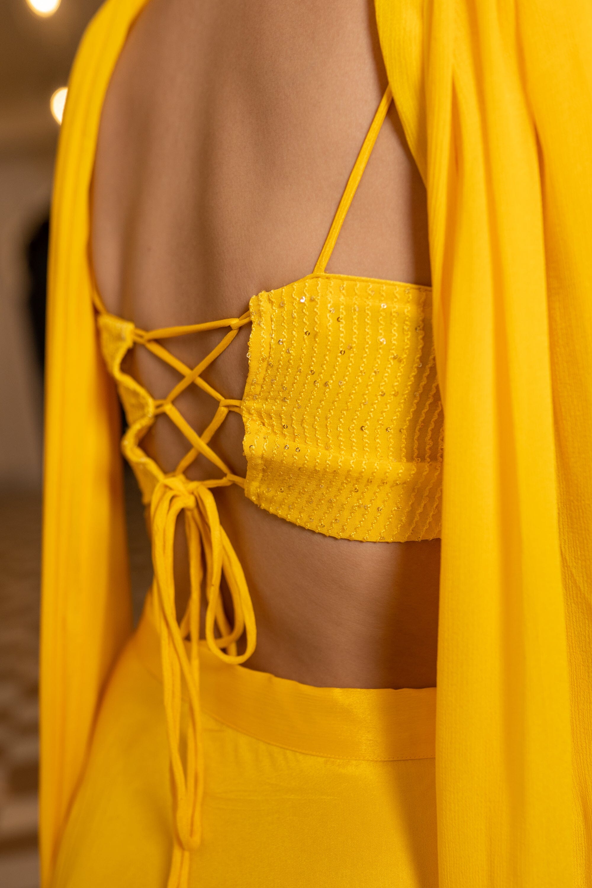 Con un conjunto Sharara amarillo en base Chinon. Se combina con una Dupatta en la base. Blusa de tiras con detalle de cordón en la espalda, pantalones Sharara y dupatta.