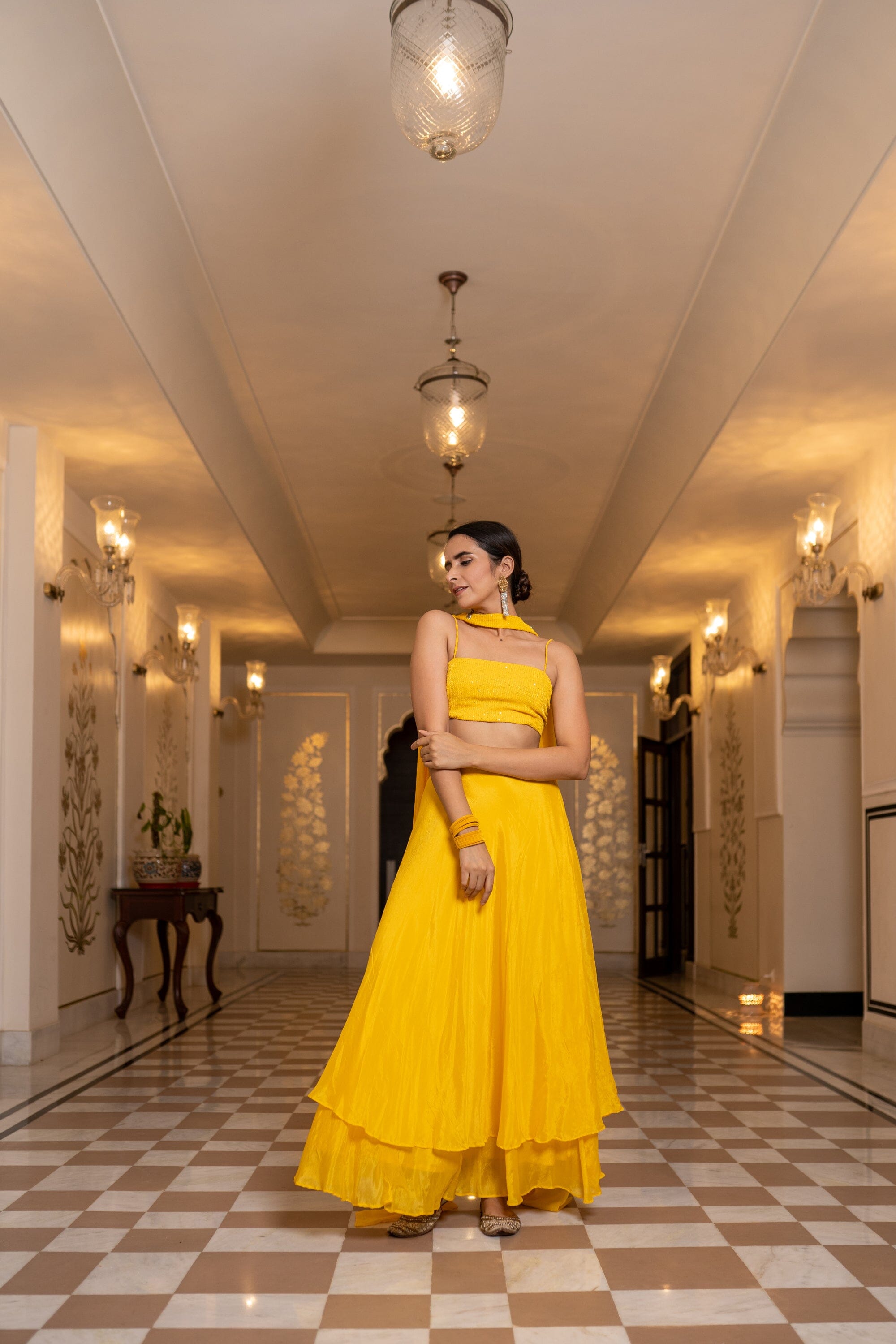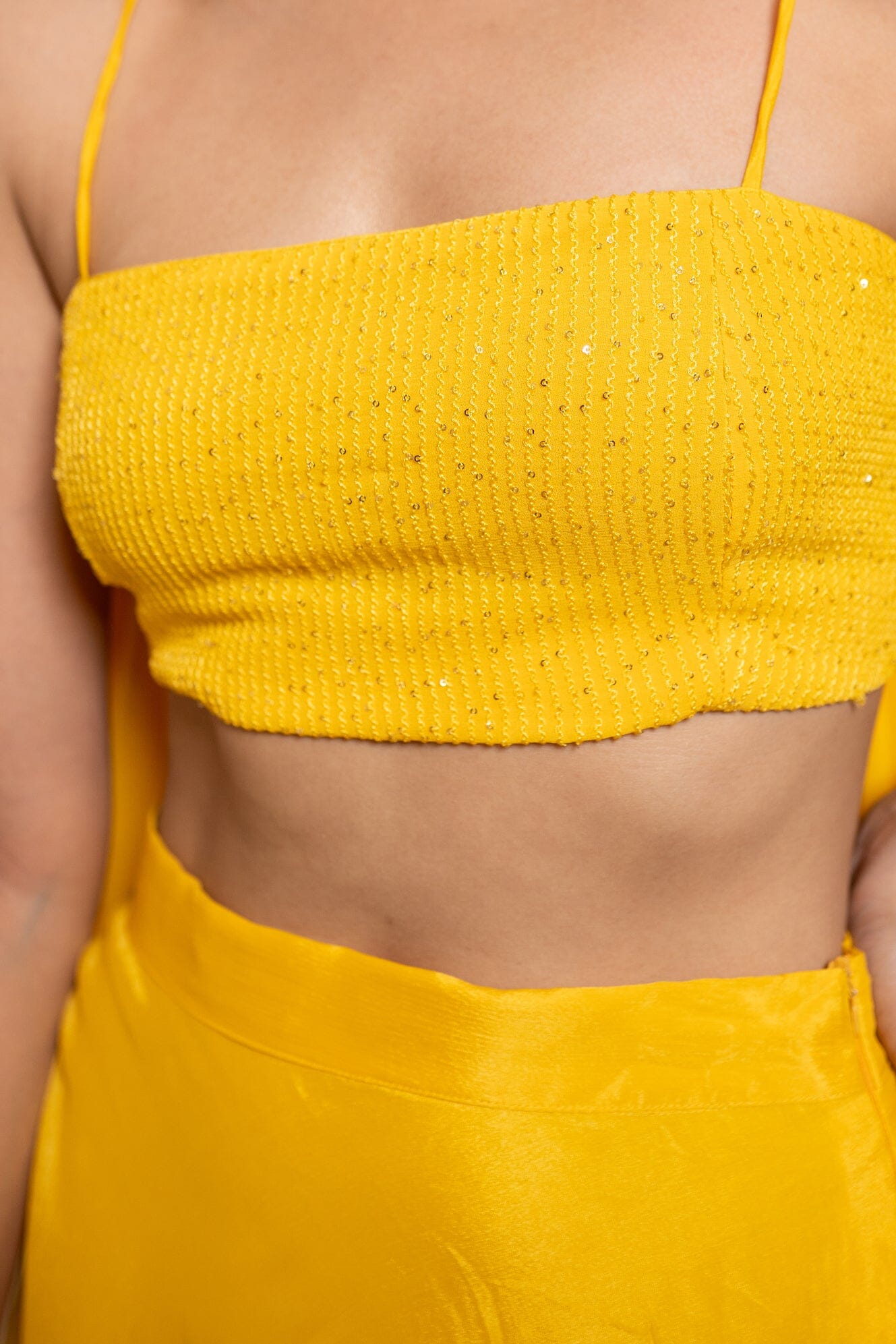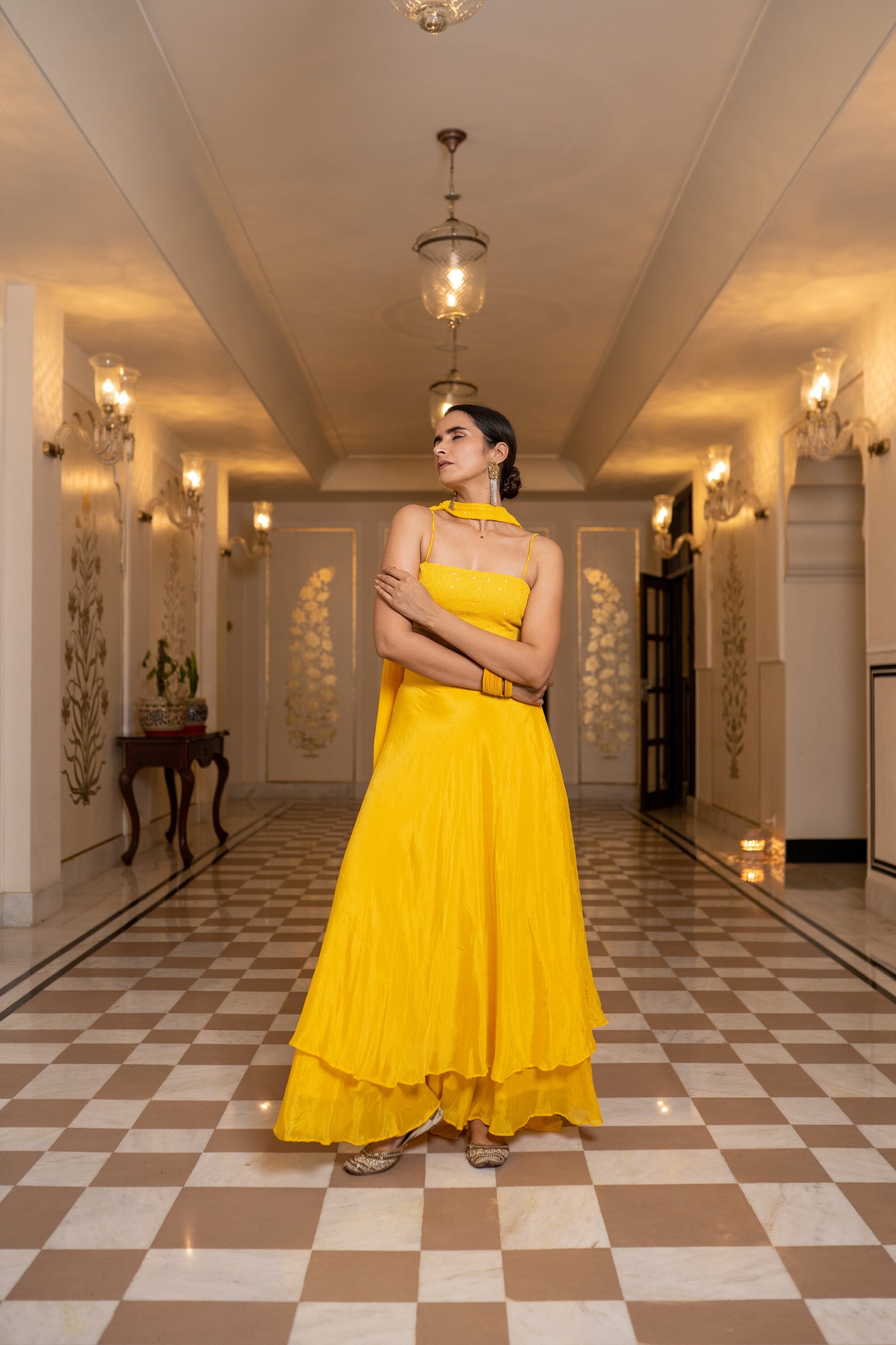 Con un conjunto Sharara amarillo en base Chinon. Se combina con una Dupatta en la base. Blusa de tiras con detalle de cordón en la espalda, pantalones Sharara y dupatta.