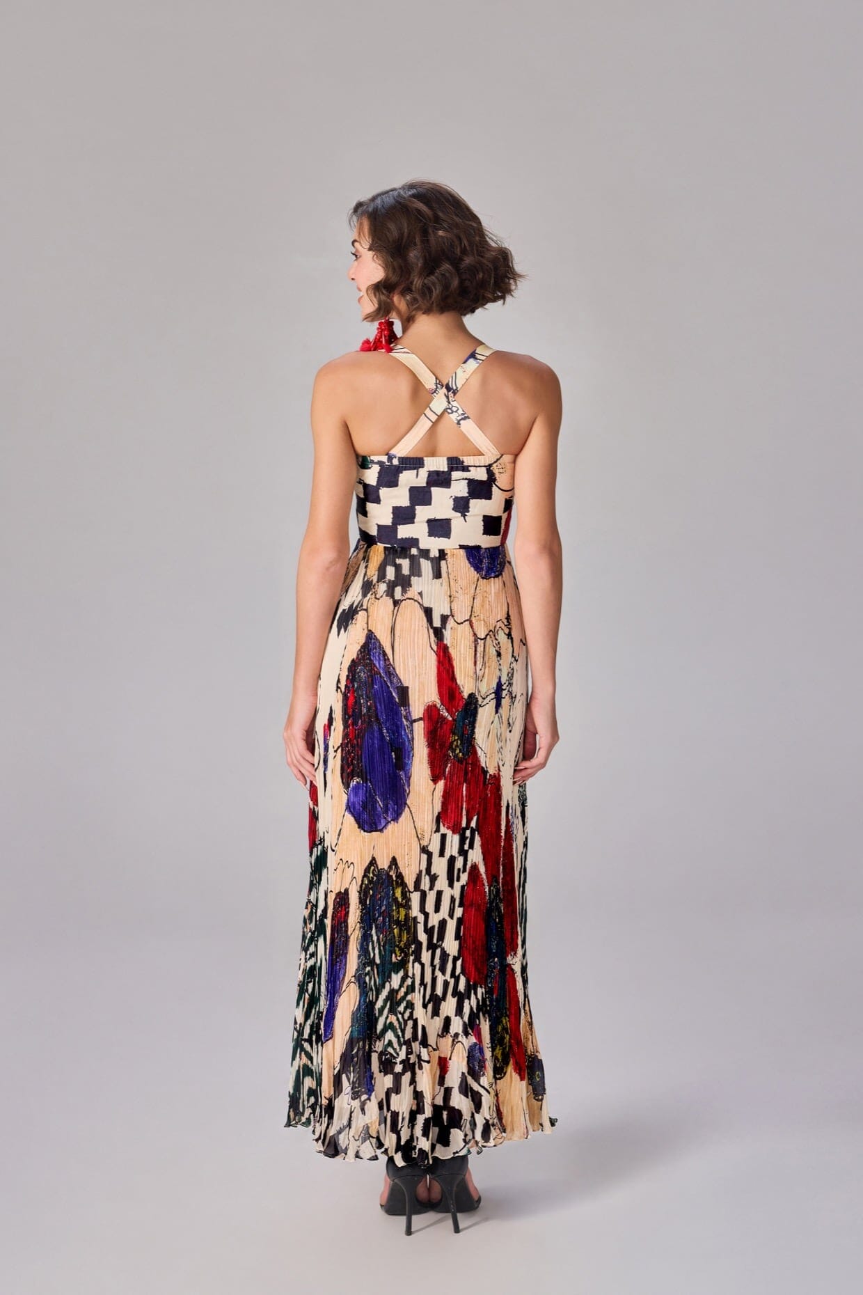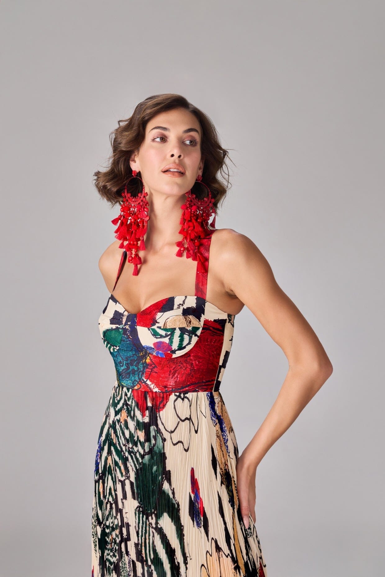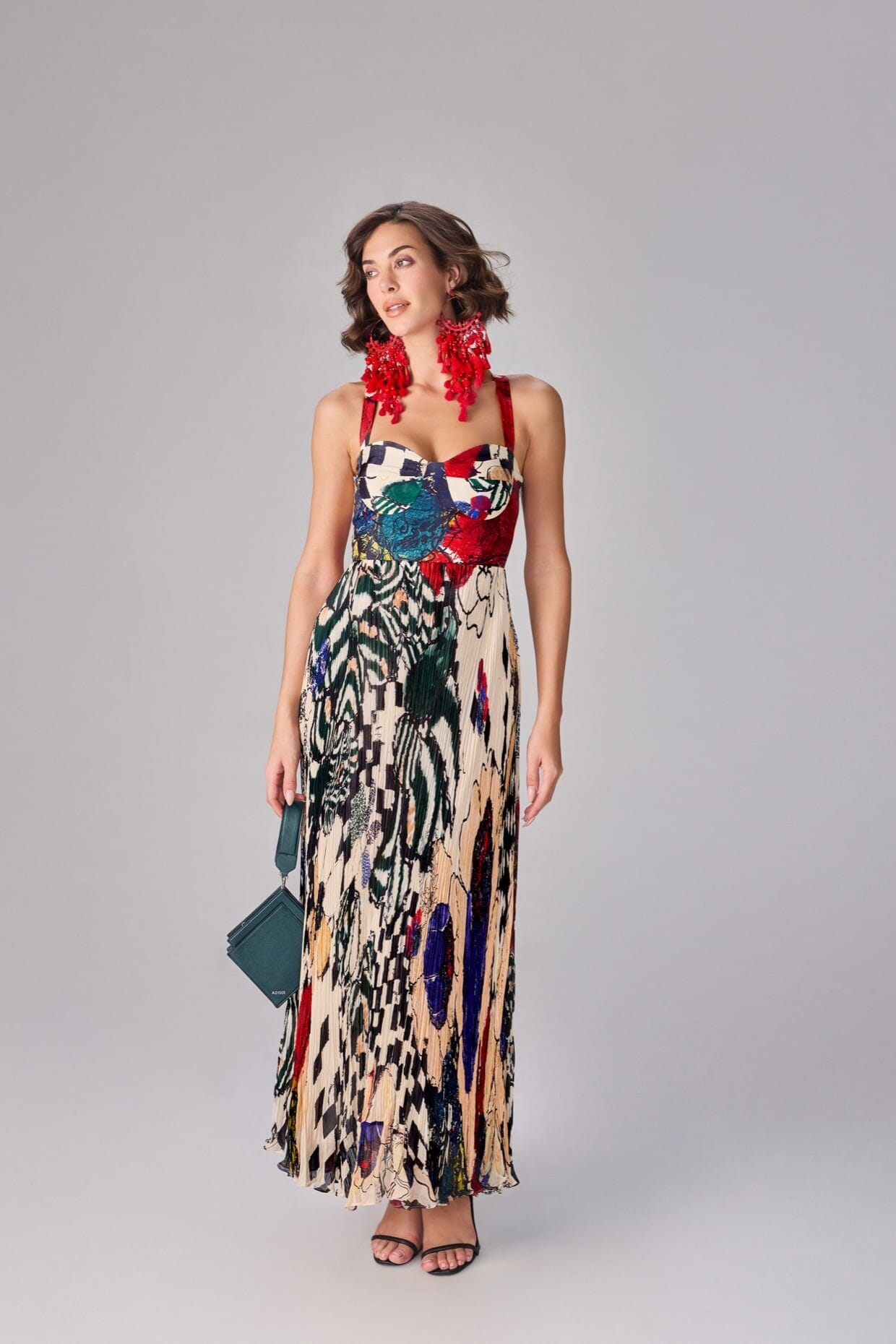 Floral And Abstract Print, Part Hand Micro Pleat Maxi Dress With Satin Bustier And Sweetheart Neckline