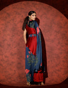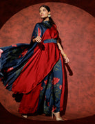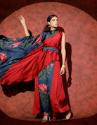 This asymmetric ensemble is crafted in luxurious georgette satin with jewel-toned charm. Featuring a closed-collar neckline, intricate panel detailing, and a hand-embellished floral belt, it pairs effortlessly with side-pleated contrasting pants. A sophisticated yet statement-making look for contemporary celebrations.